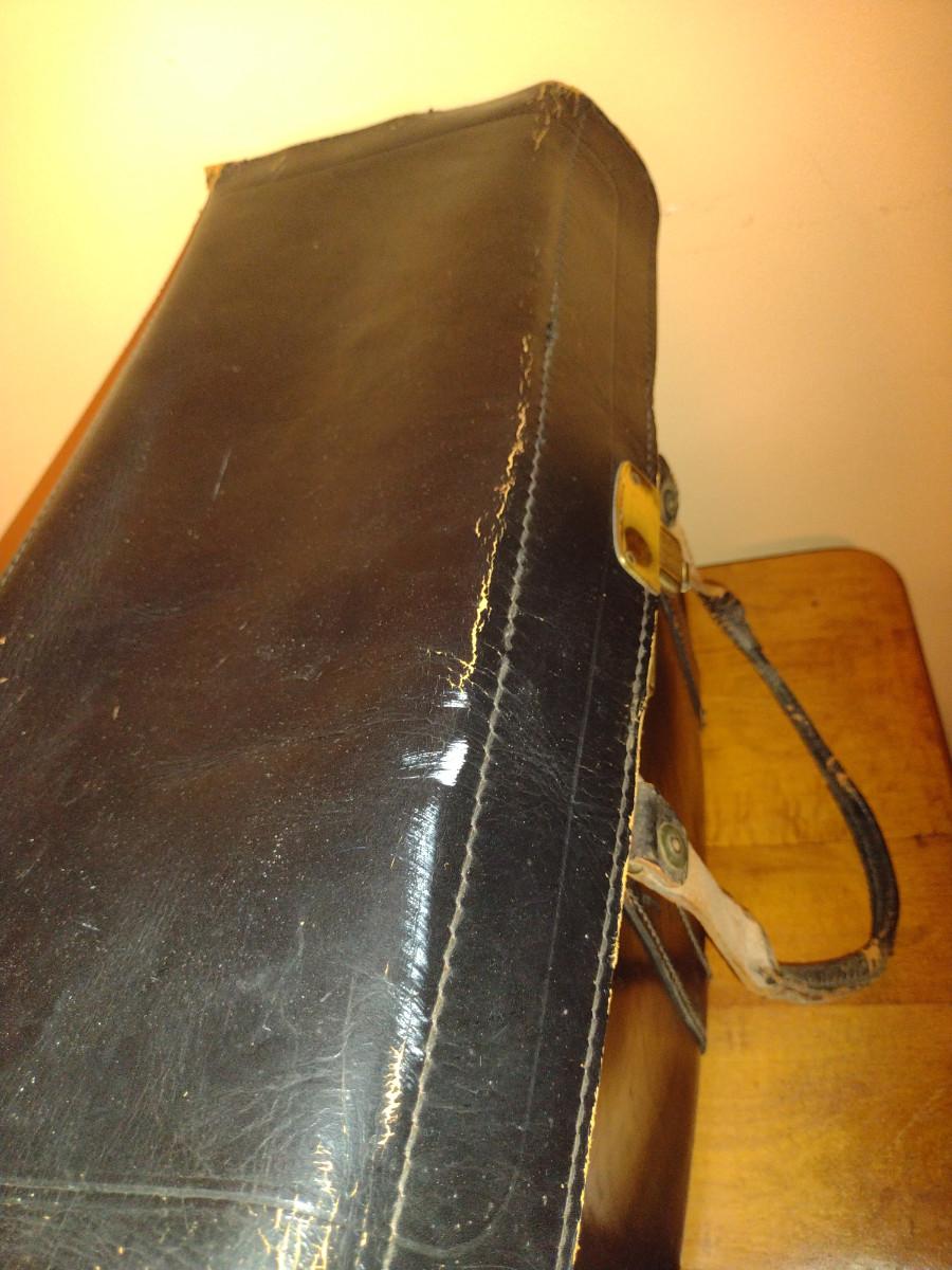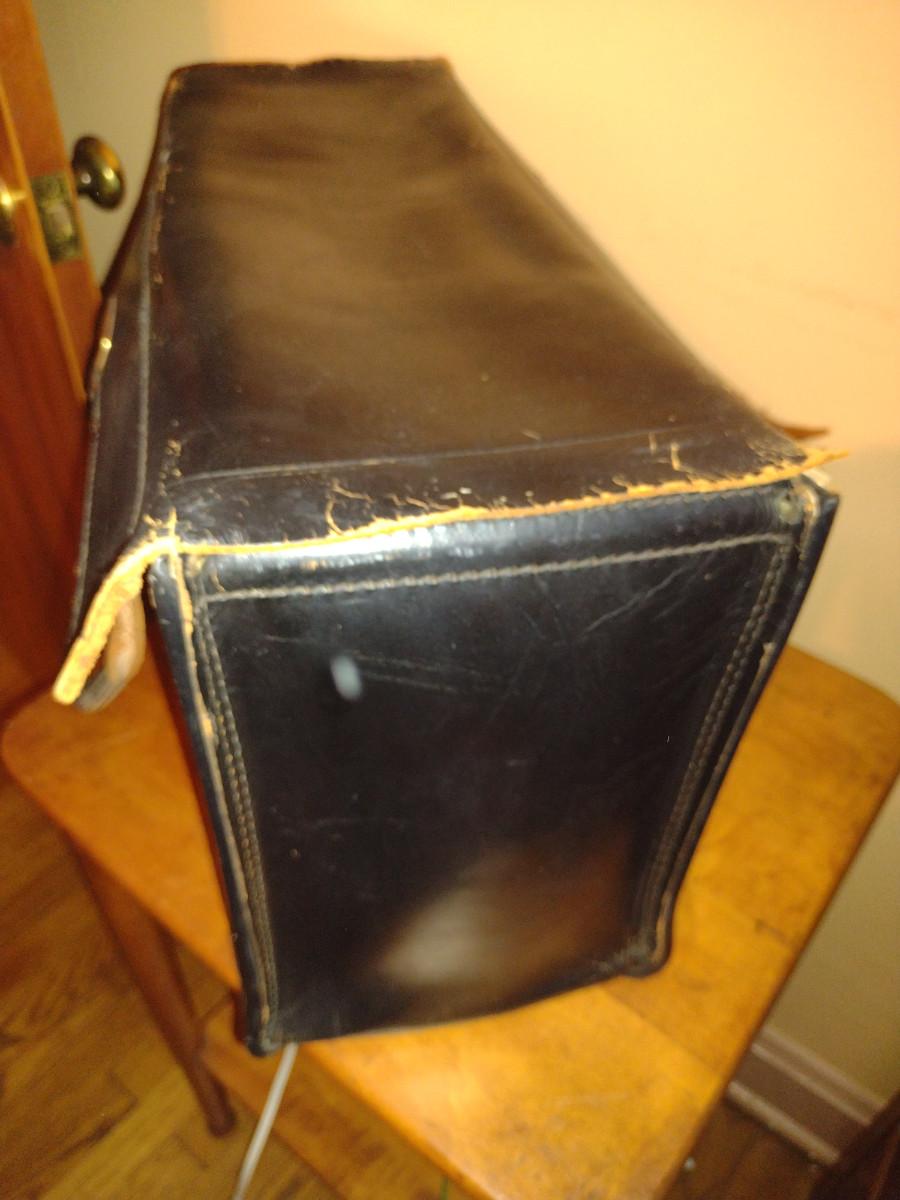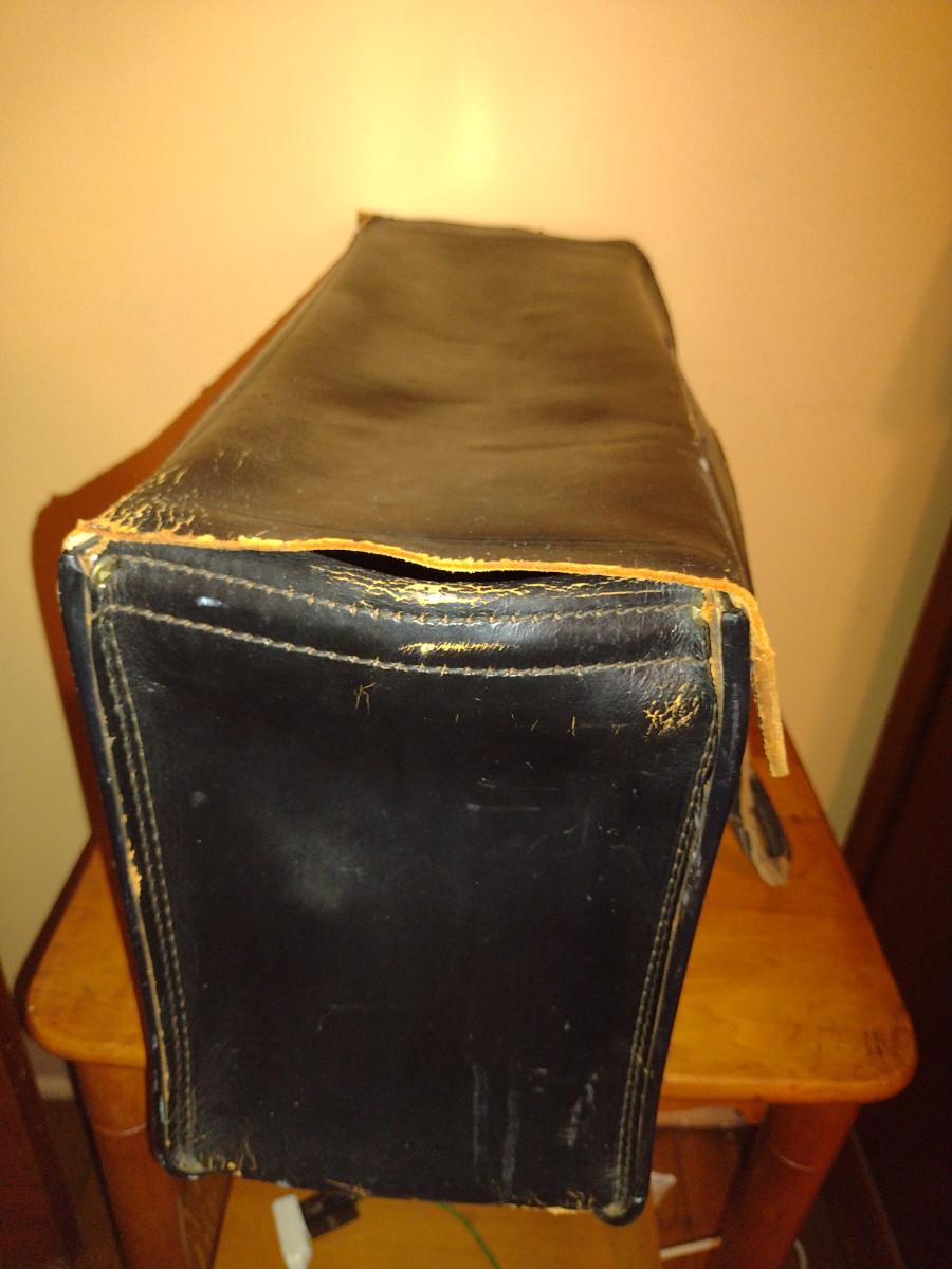 Large, Vintage Media Case- Approx 20" x 8" x 11 1/2" Tall. Appears to be leather. Please see all pictures- item has discoloration and wear.