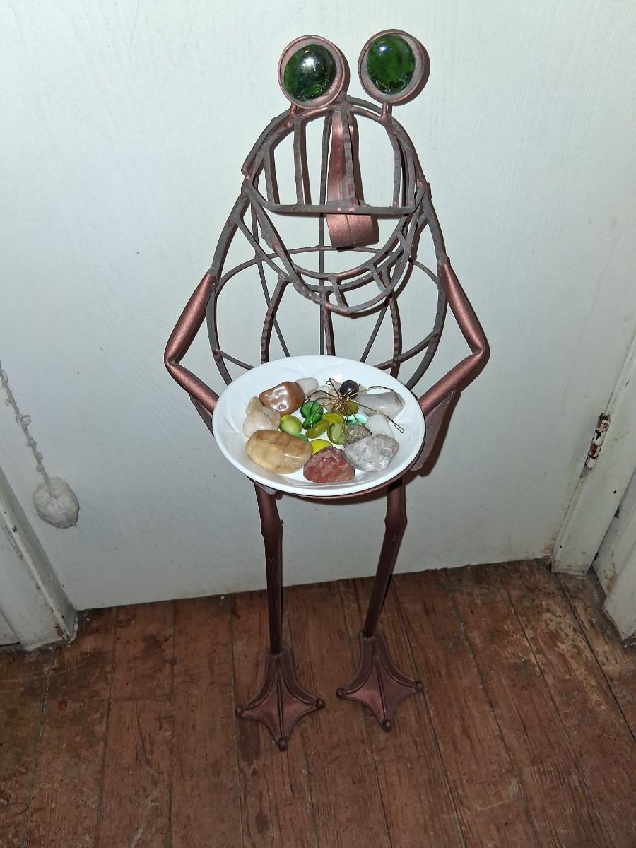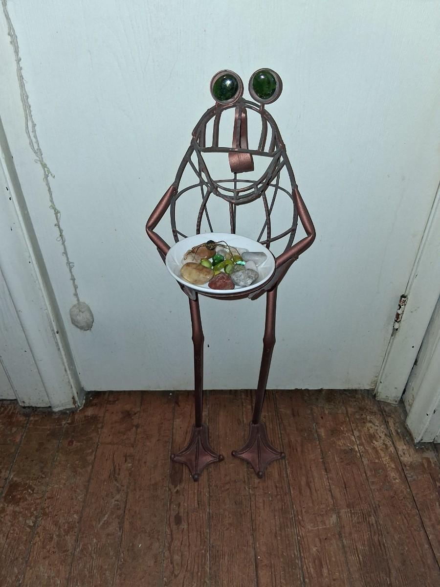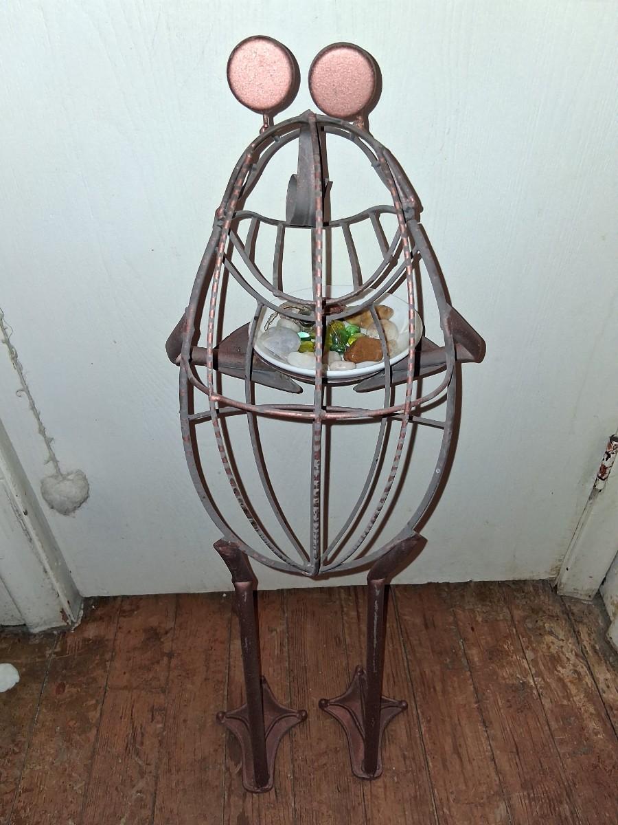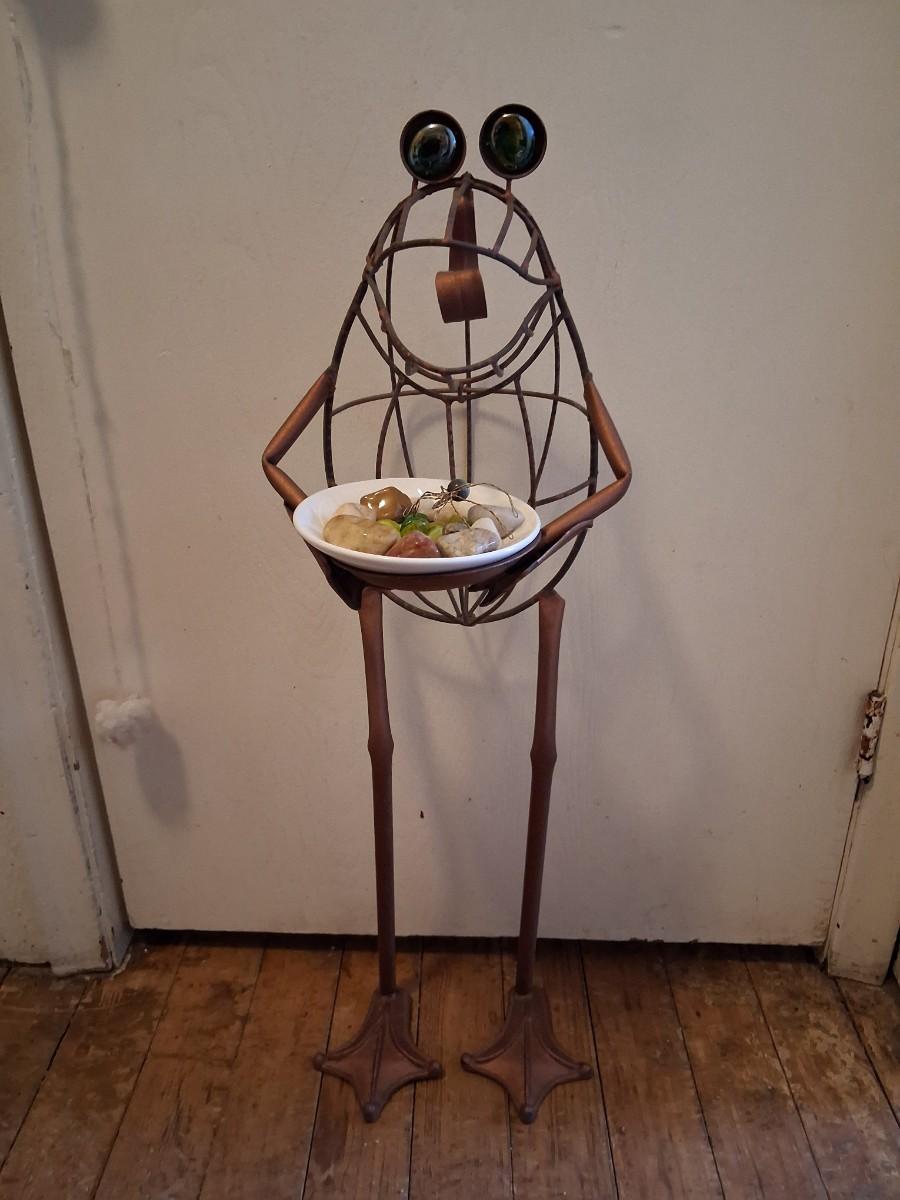 30"+ Metal Sculpture. He holds a bowl. There is a plate in it with a wire spider he is ready to snack on. Indoor or Outdoor. Ashtray or trinket holder, this is great for a Man Cave or Diva Den