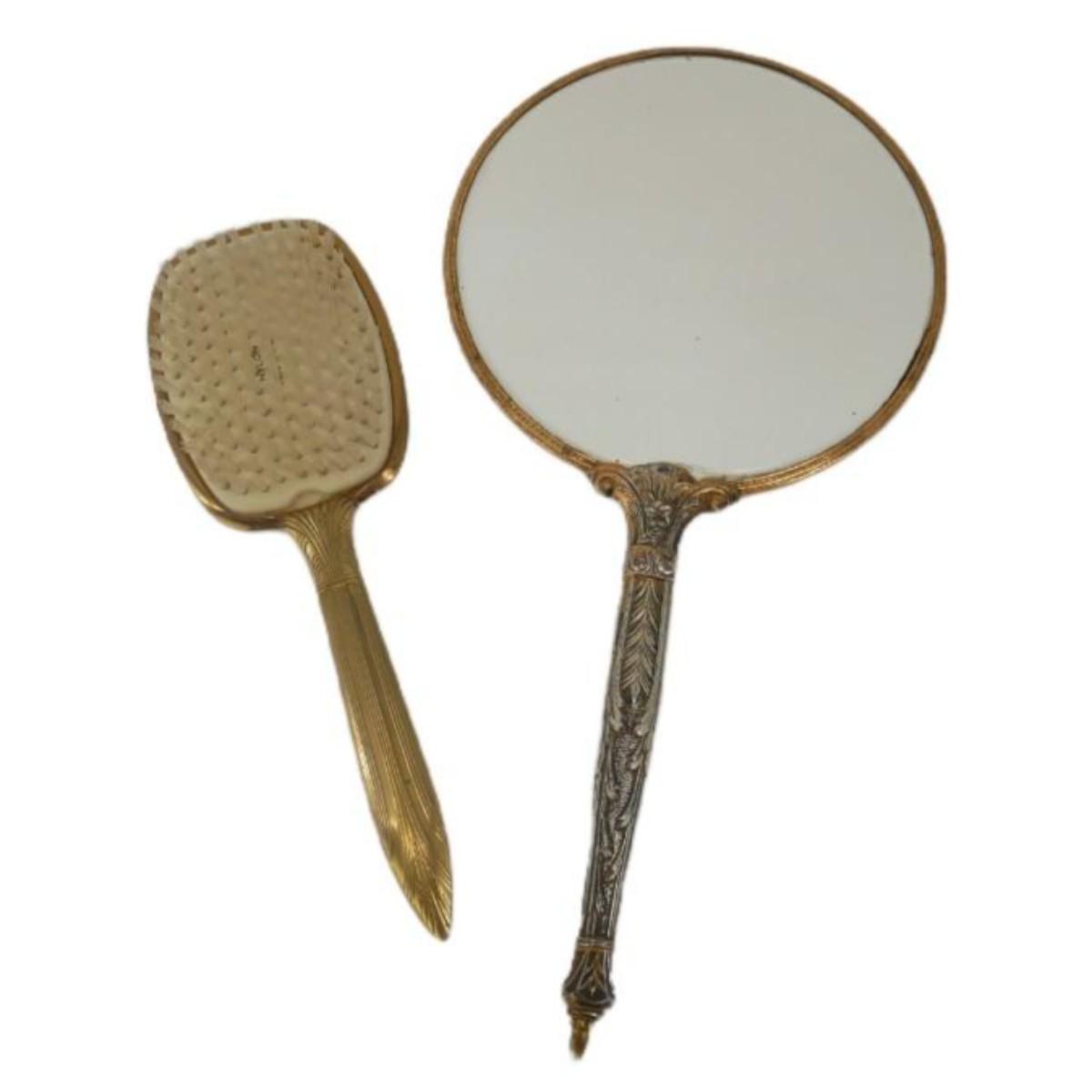 Vintage hand-held mirror and brush. Both ornately designed, with some wear. Mirror measures 7" in diameter and 15" in length. Brush head is 3.5" x 4" and total length is 10.25". Marked "Nylon Made in USA" Weight of lot is 1 lb 7 oz. (D28)