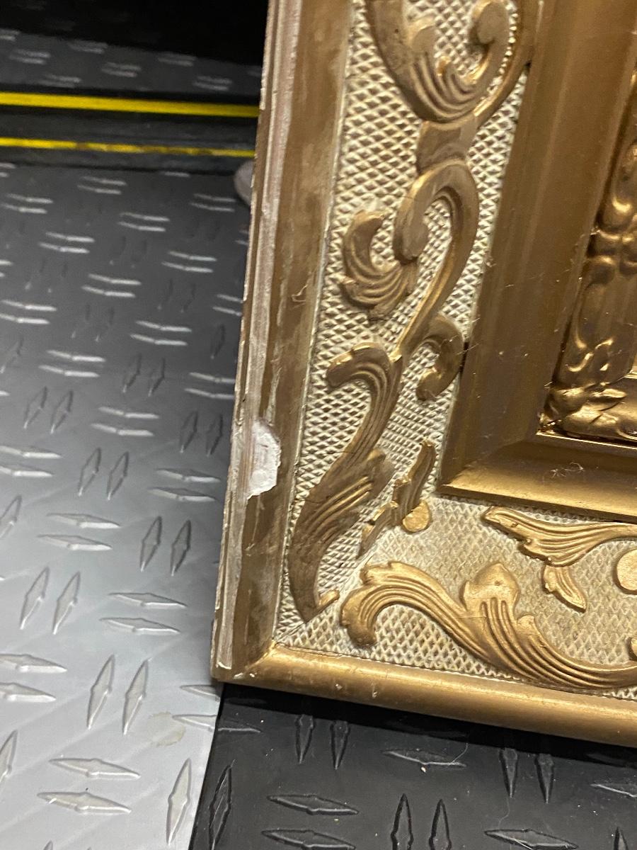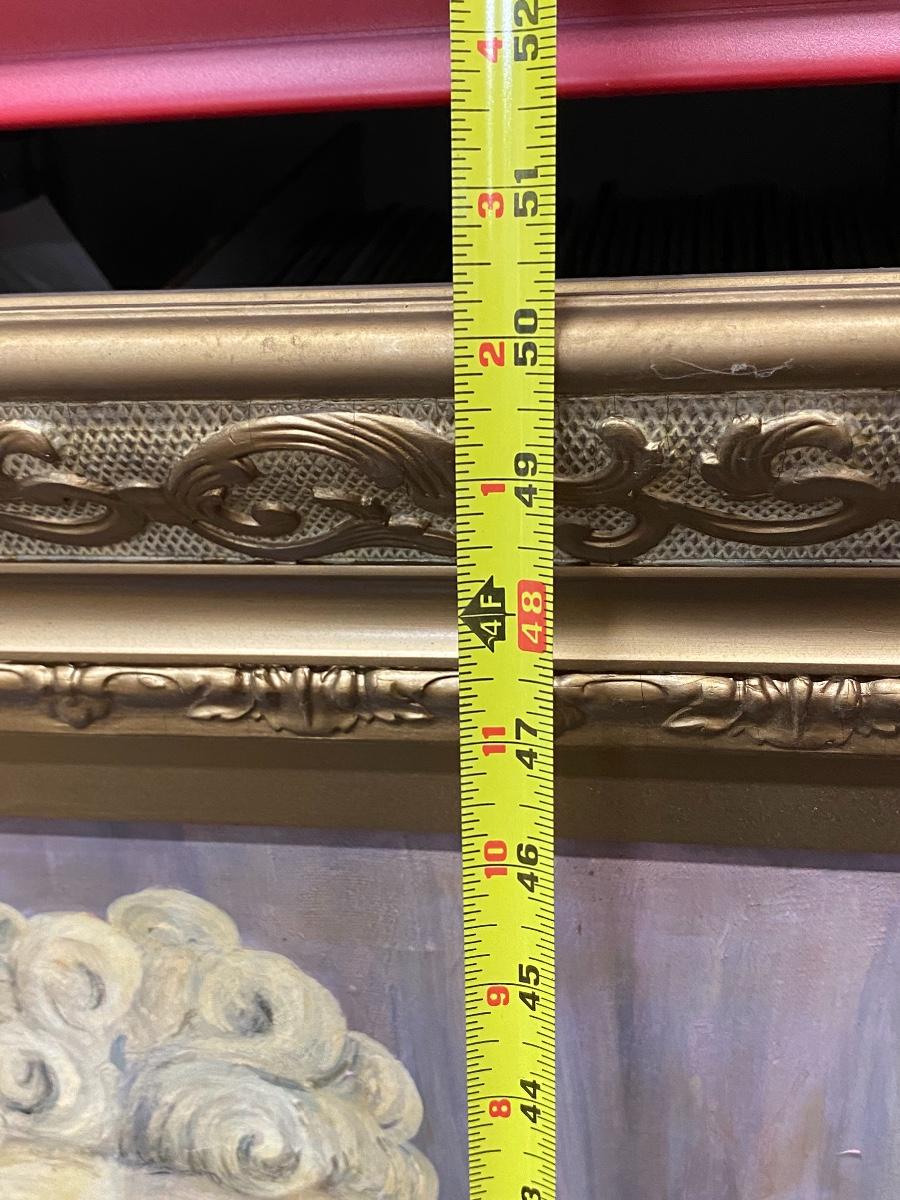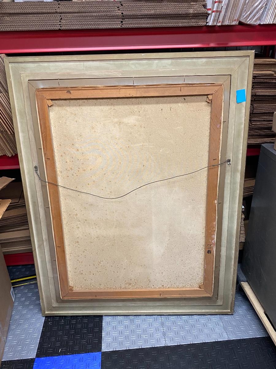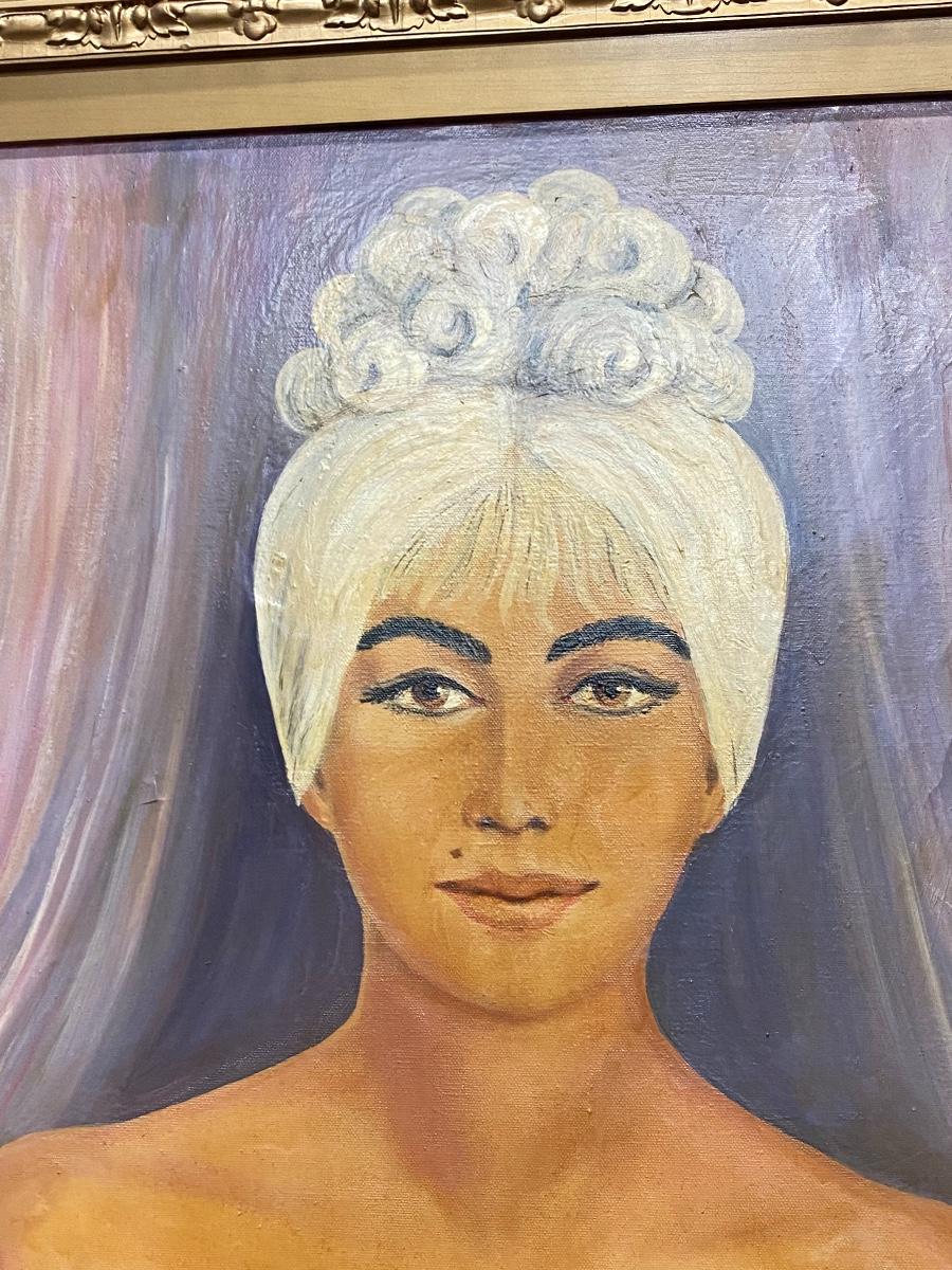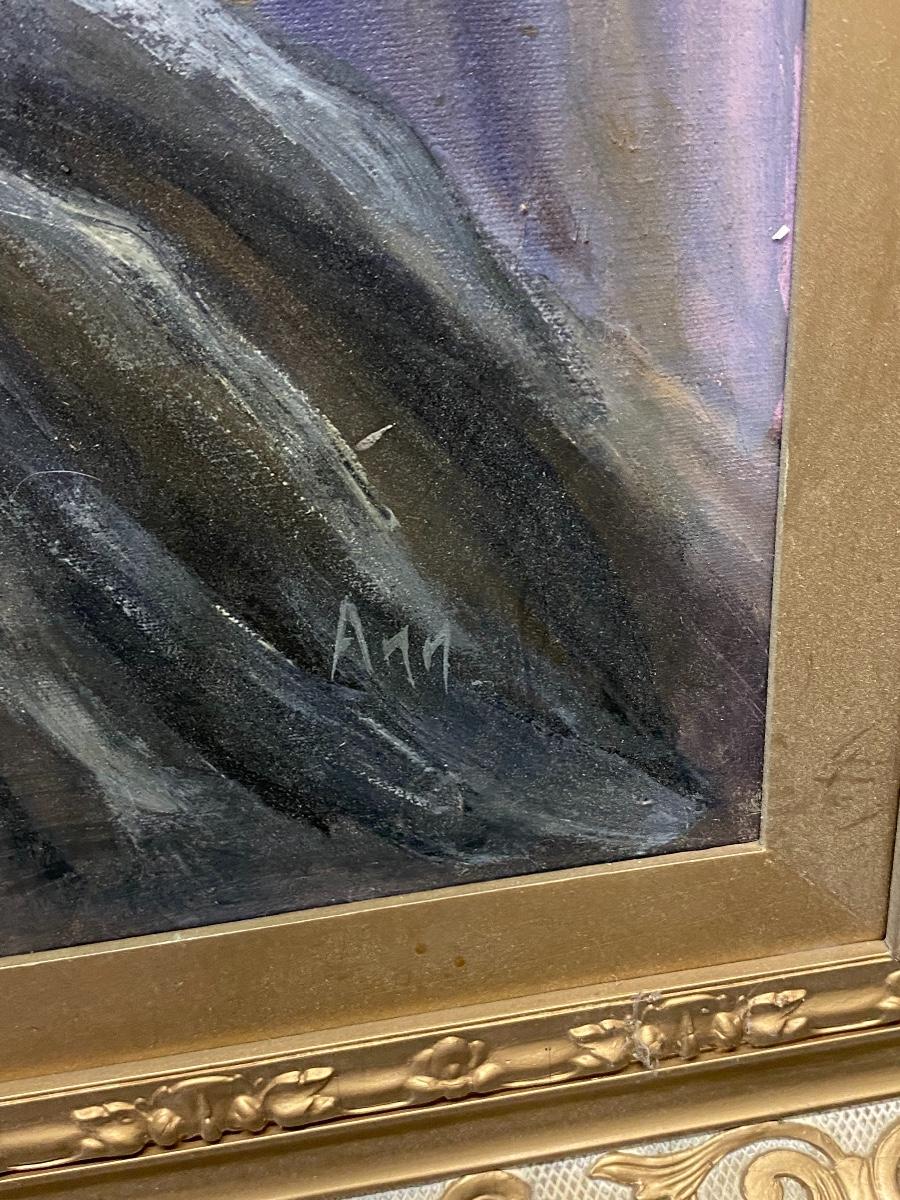 Vintage portrait painting of a woman in a black dress. Large framed painting measures about 40"x51". Signed in the bottom corner. Frame has a few scuffs from storage.