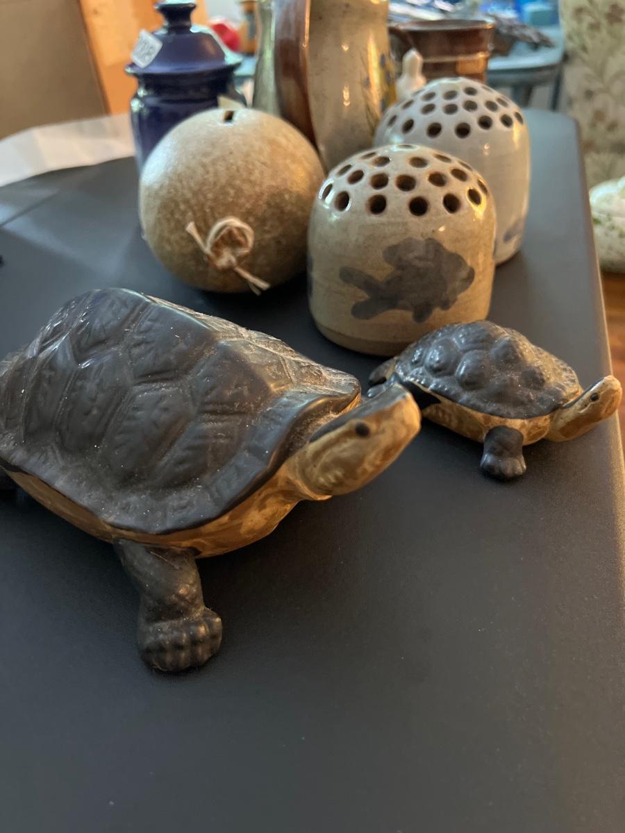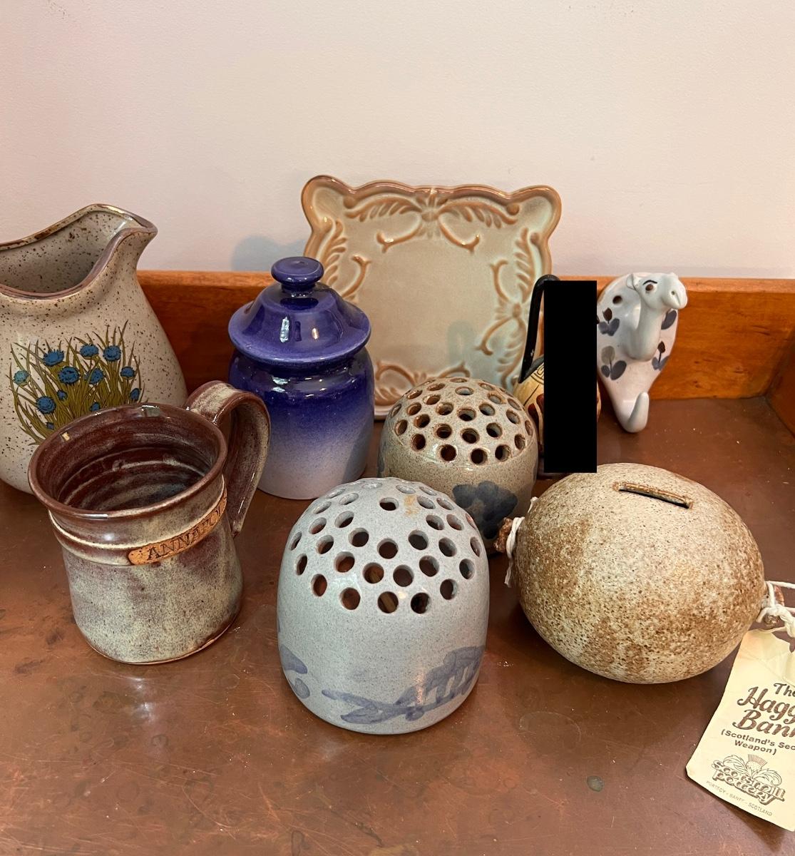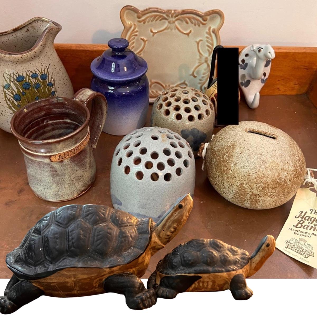2 Garagos Egyptian pottery vases. Vintage Scottish Pottery Haggis Piggy Bank 6 inches. Arabic pottery camel hook, 2 Japanese pottery turtles and more.