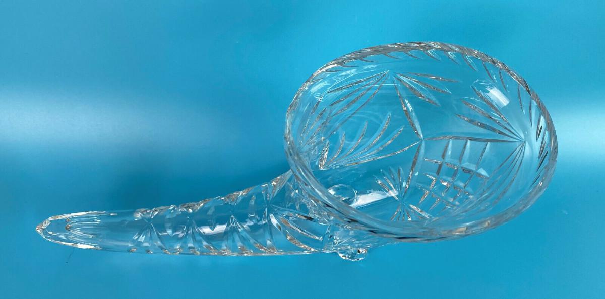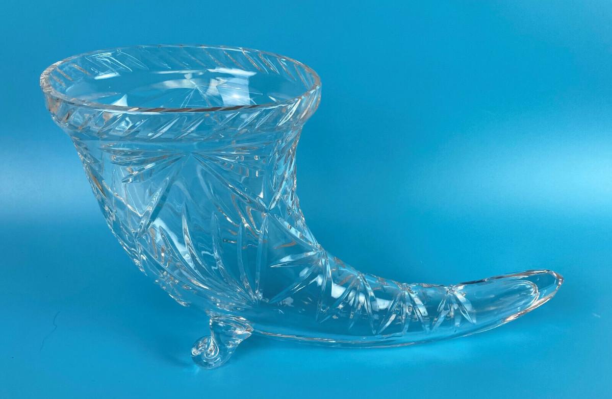 Excellent condition on this large 11.5" long by 7" high glass cornucopia...No damage on this vintage piece...Faceted tail...Unknown maker?
