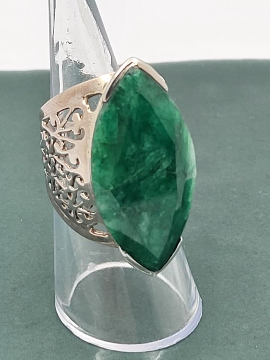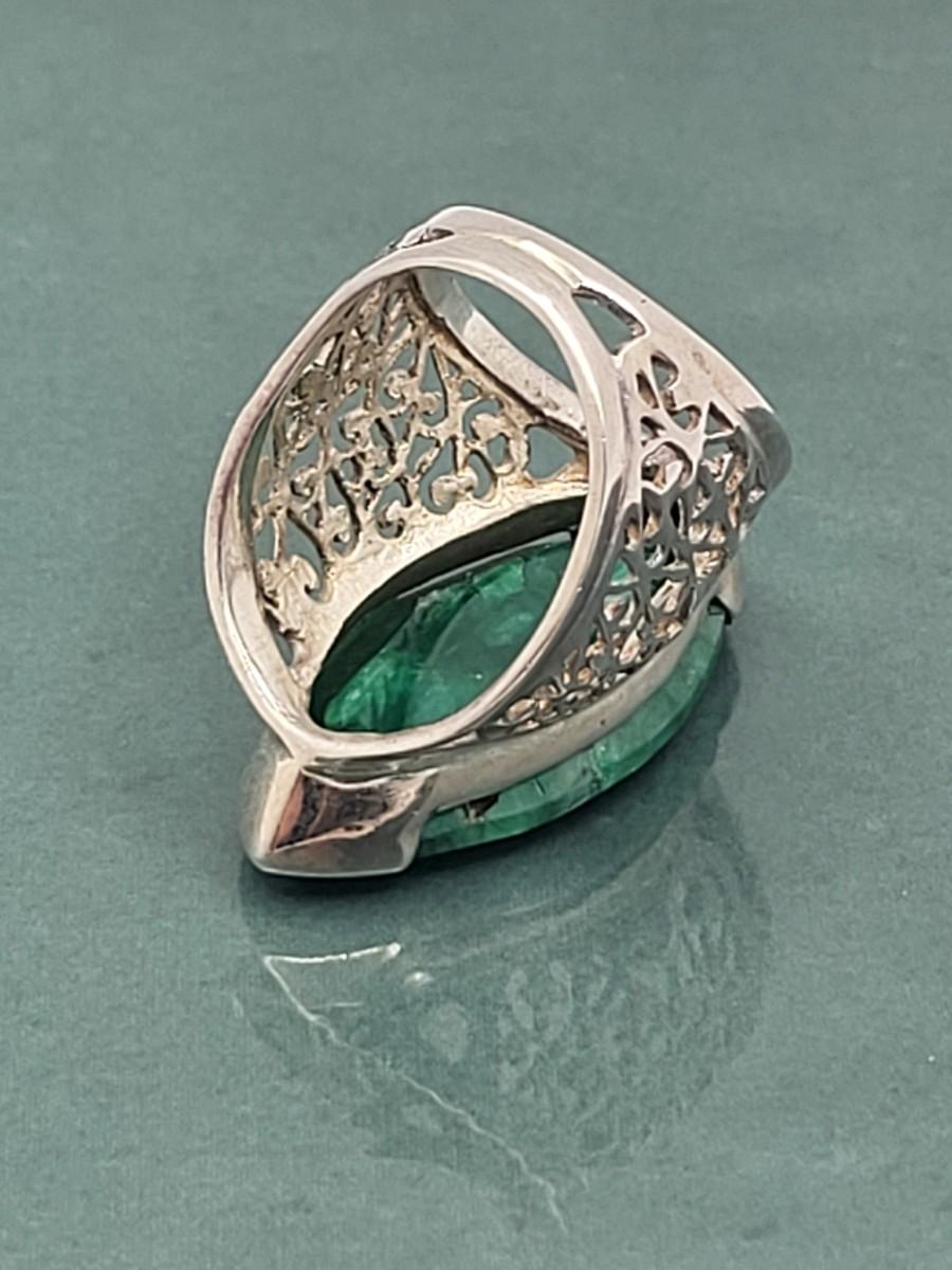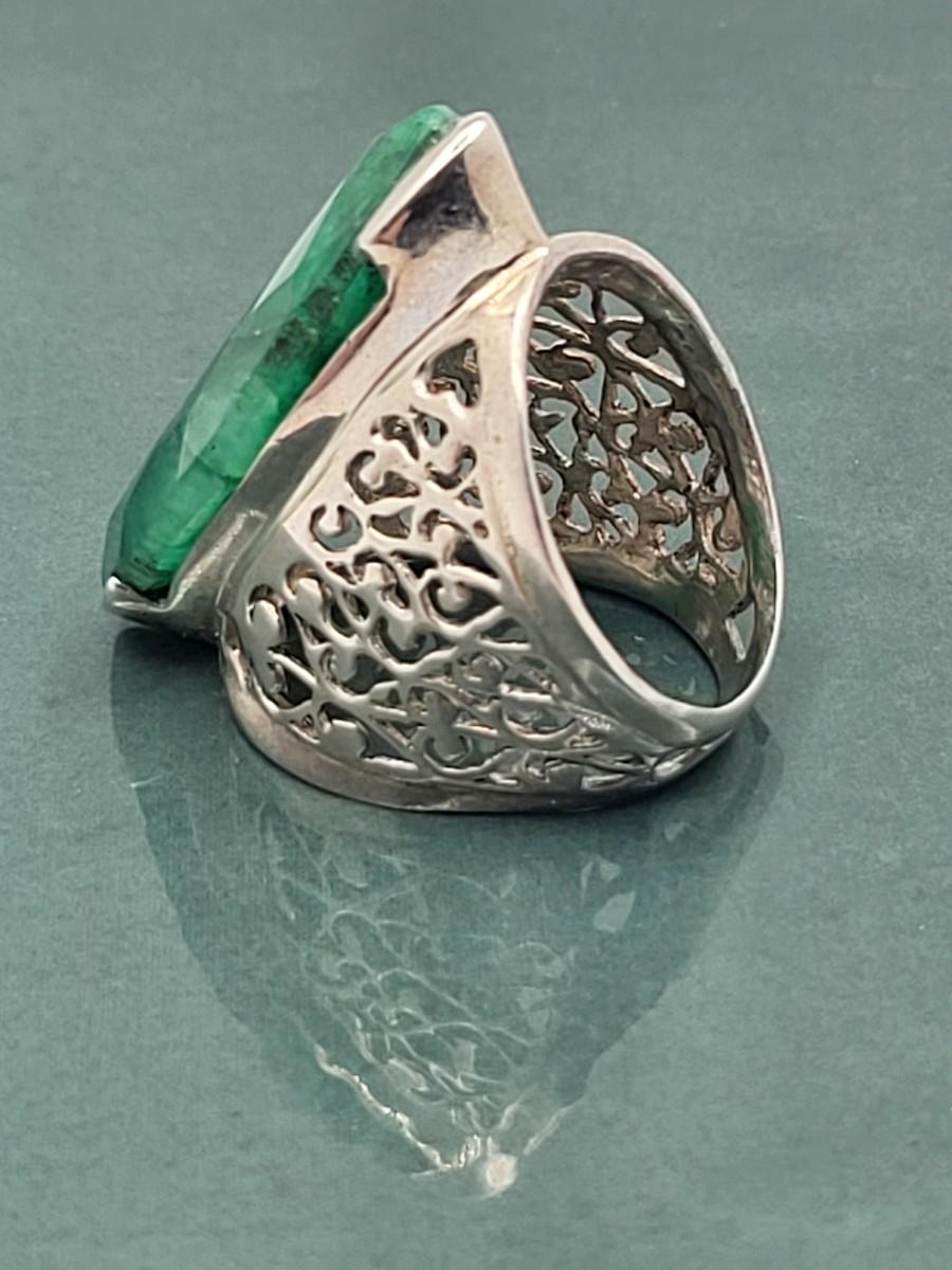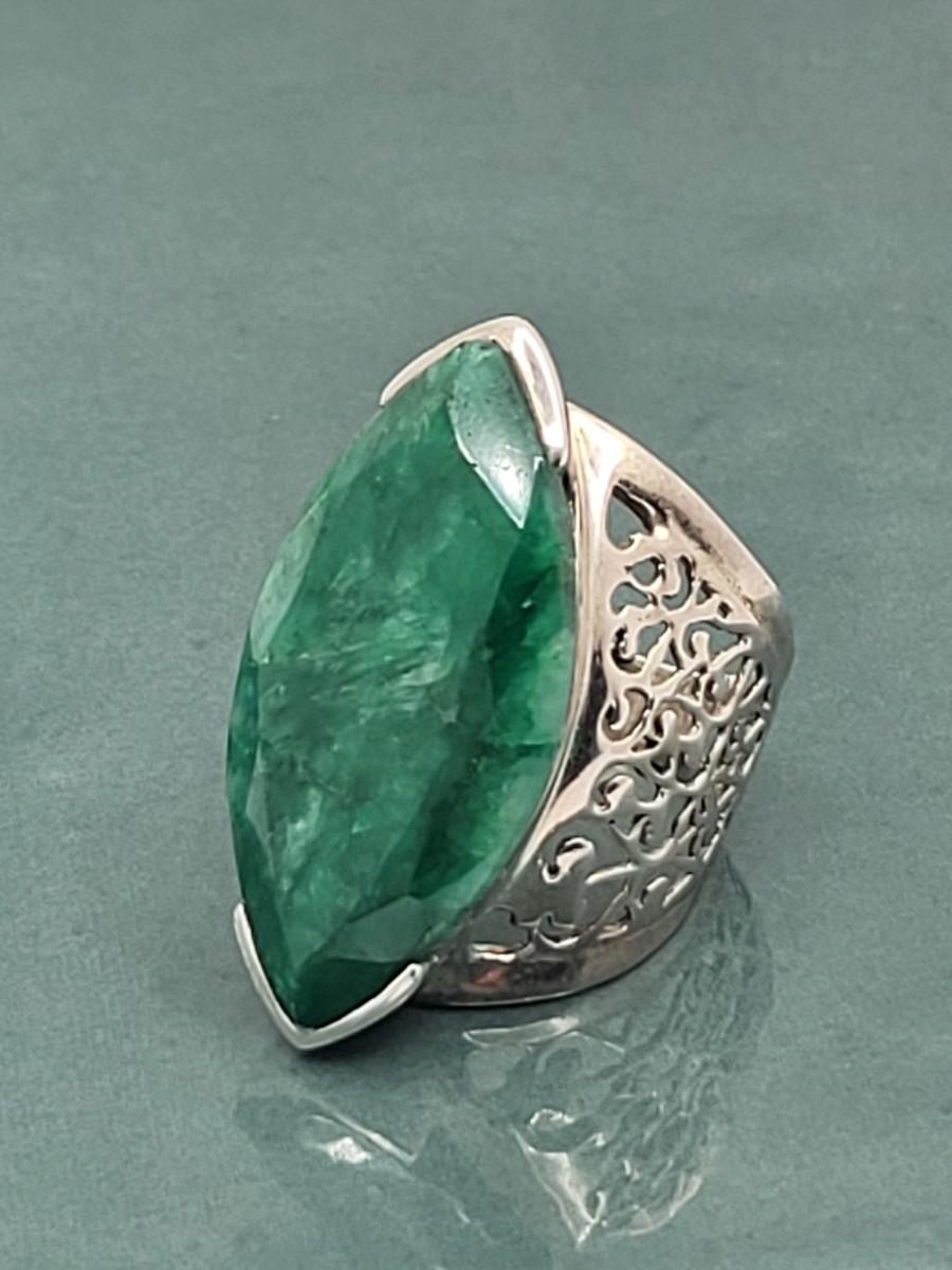 Large vintage emerald (10mm x 20mm) ring, wide open-work shank. 925 (stamp is hard to see). Comfortable to wear. Total weight 13.3gr.