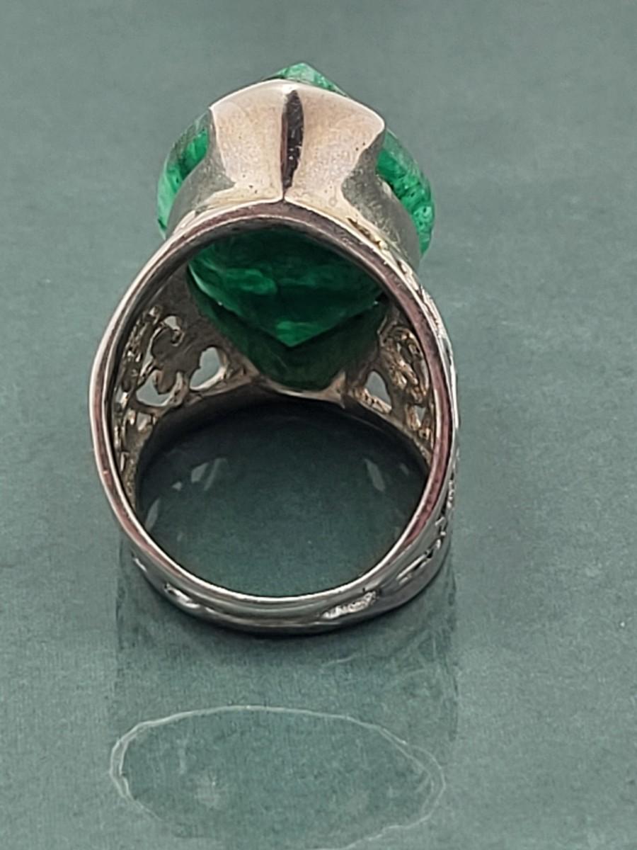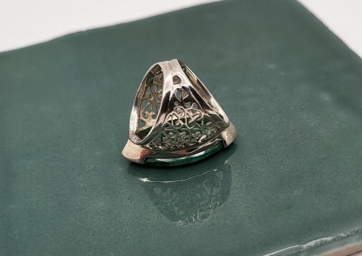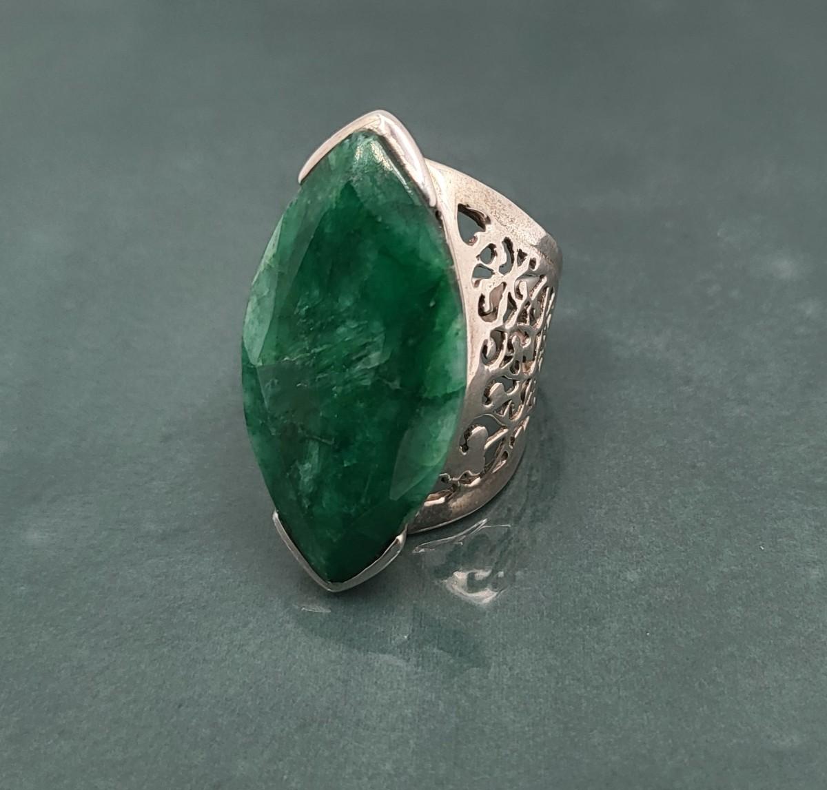 Large vintage emerald (10mm x 20mm) ring, wide open-work shank. 925 (stamp is hard to see). Comfortable to wear. Total weight 13.3gr.