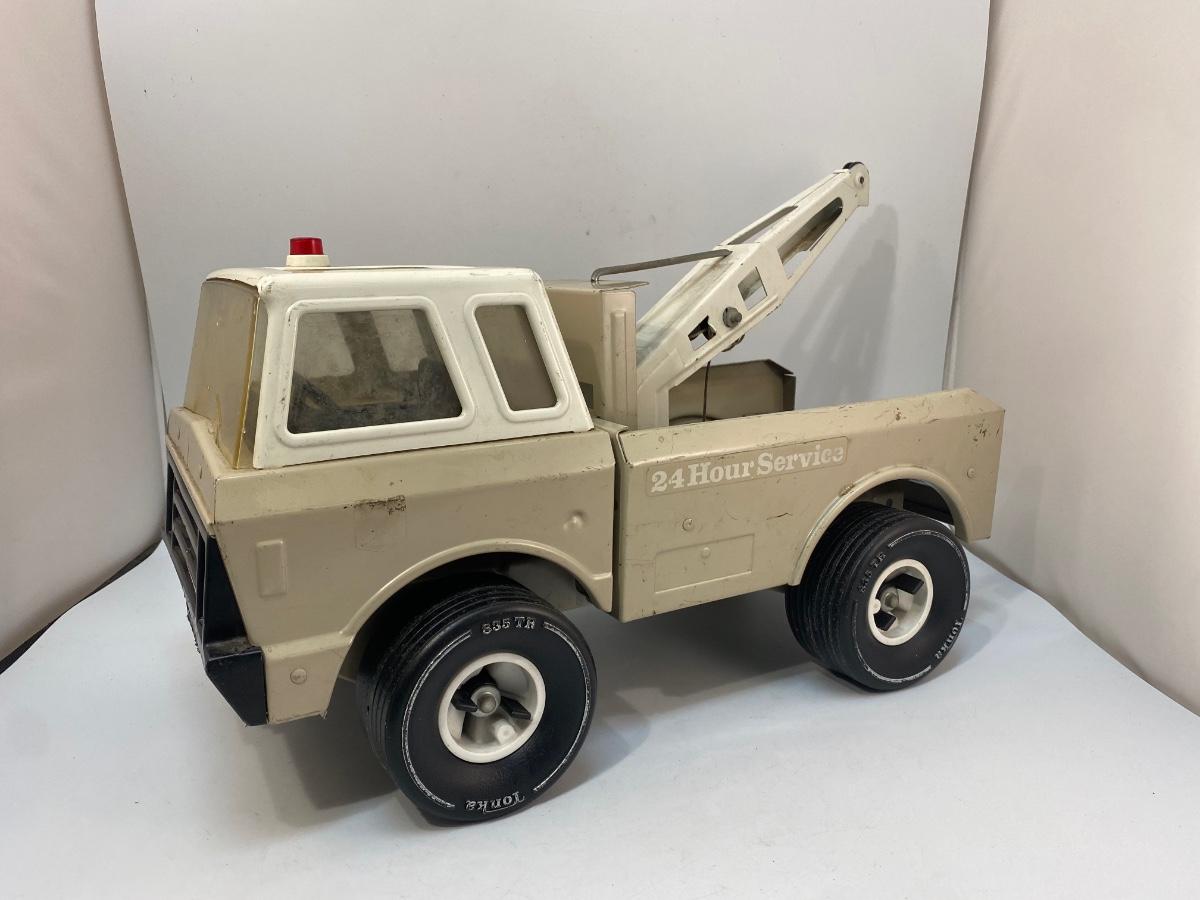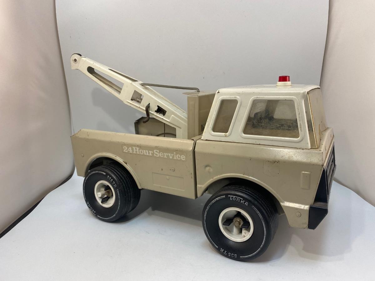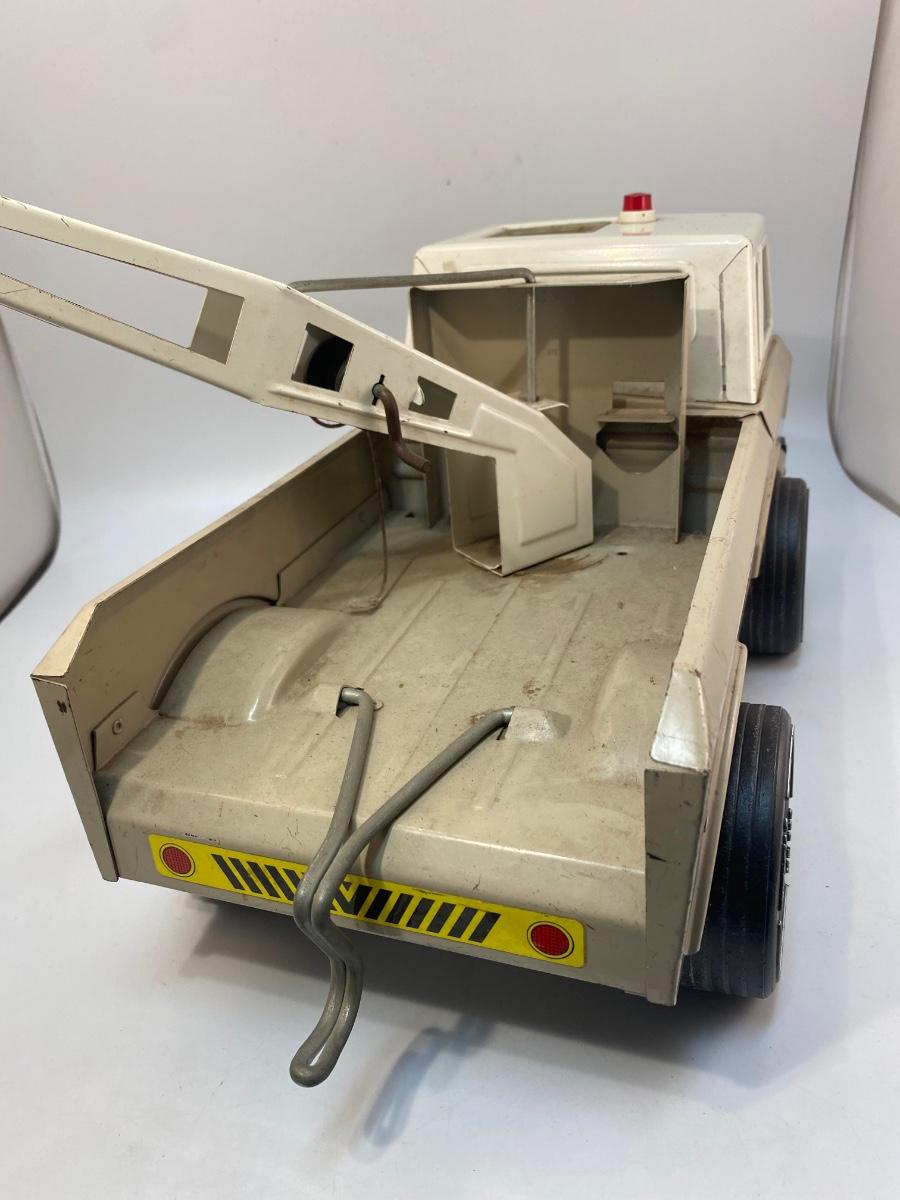 Large Vintage TONKA Metal Tow Truck. Beige and white. In good vintage played with condition. Missing the Chevron logos off doors, the driver and tow line is missing hook.