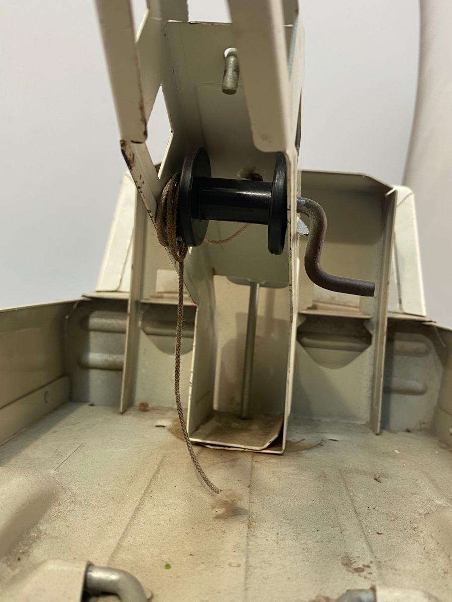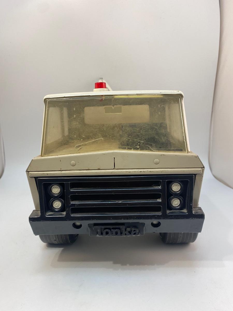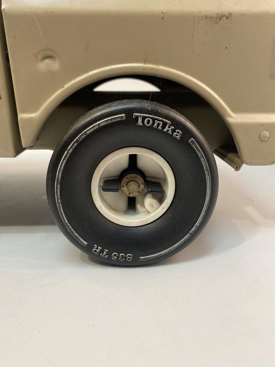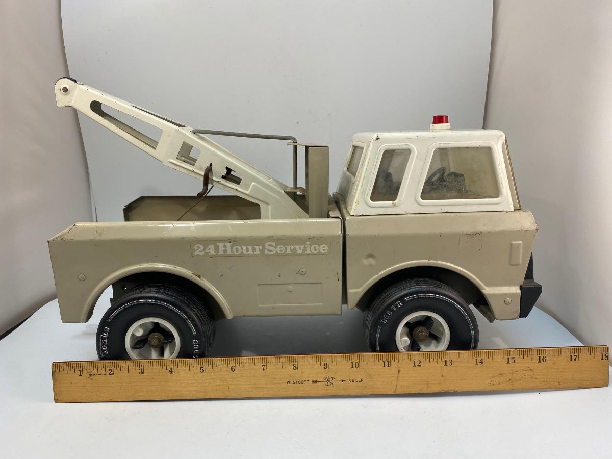 Large Vintage TONKA Metal Tow Truck. Beige and white. In good vintage played with condition. Missing the Chevron logos off doors, the driver and tow line is missing hook.