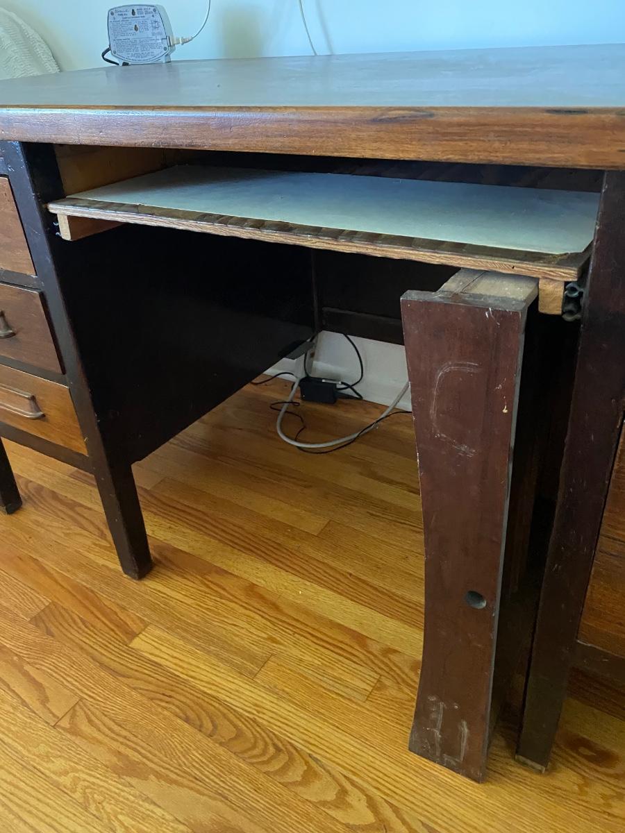Large Vintage Wood Desk. Needs a handle fixed and the center drawer was removed for keyboard use, but drawer can be put back. PICK UP IN ARCADIA ON SATURDAY 04/15 BETWEEN 9A & 11A.