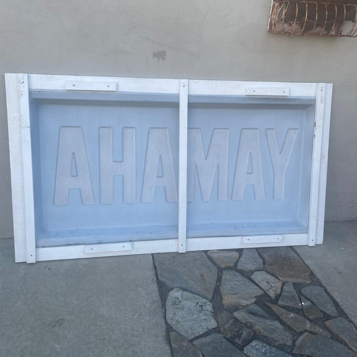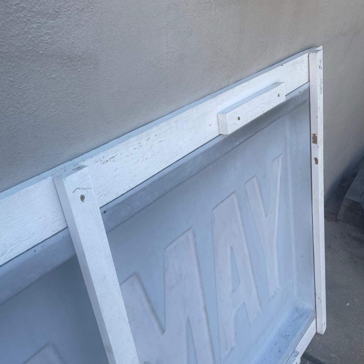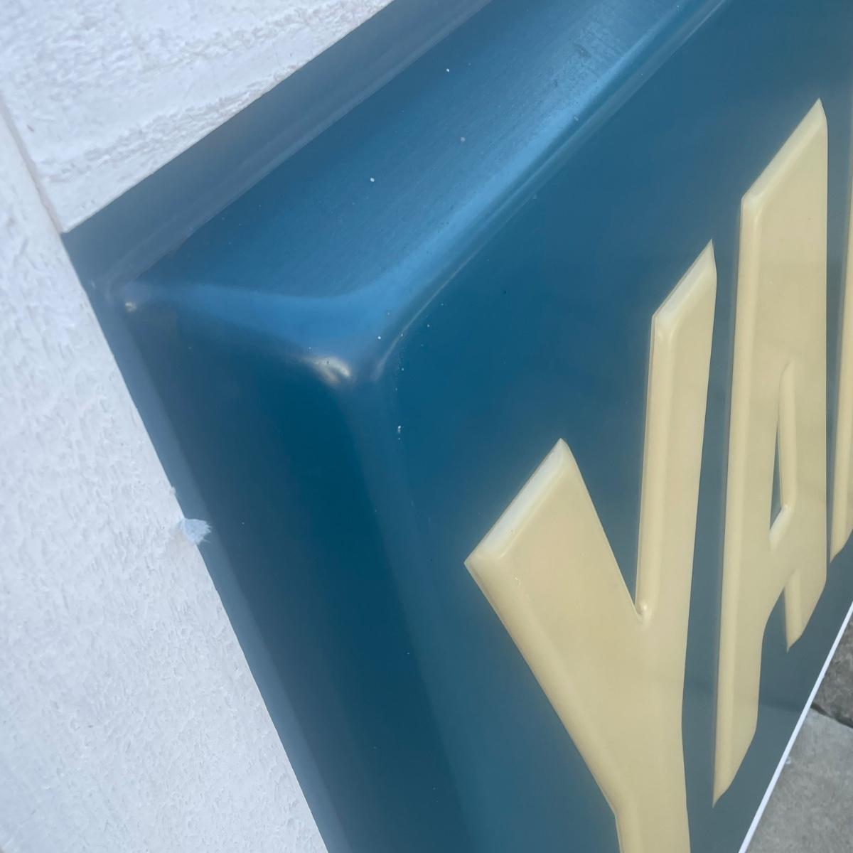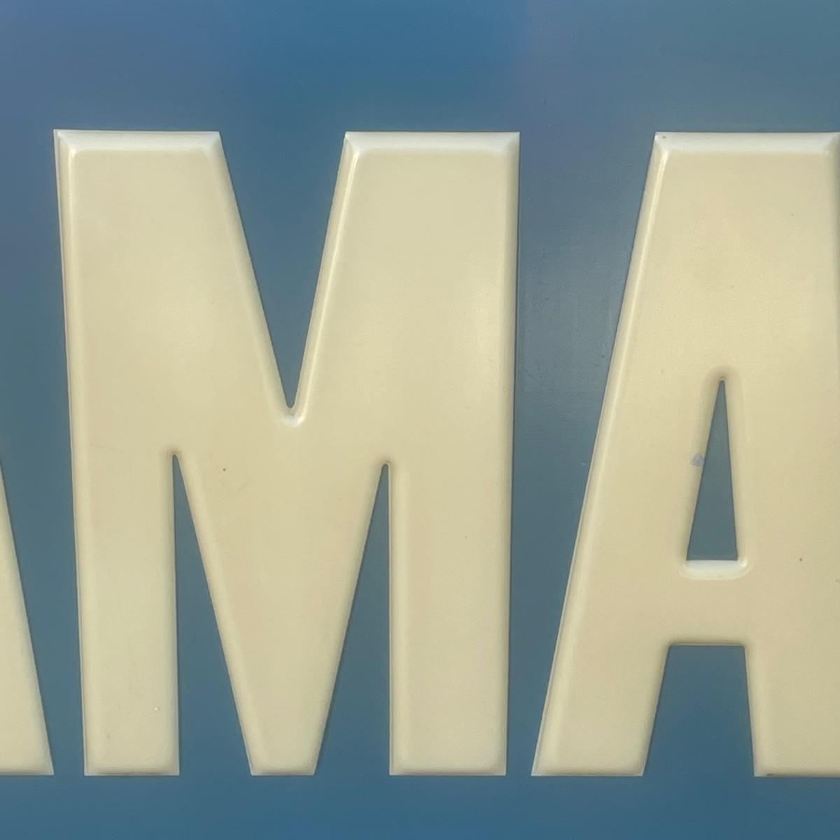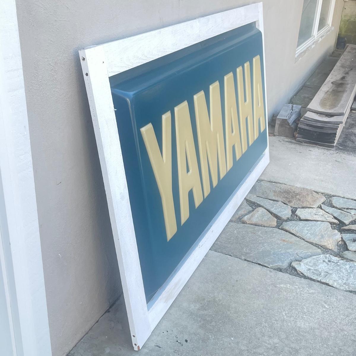 This large vintage plastic Yamaha sign is mounted in a white painted wood frame (note that it does not have a back) that measures 77” wide x 43” tall x 3.5” deep. Item is in very good condition. Hardware would need to be added to hang it.