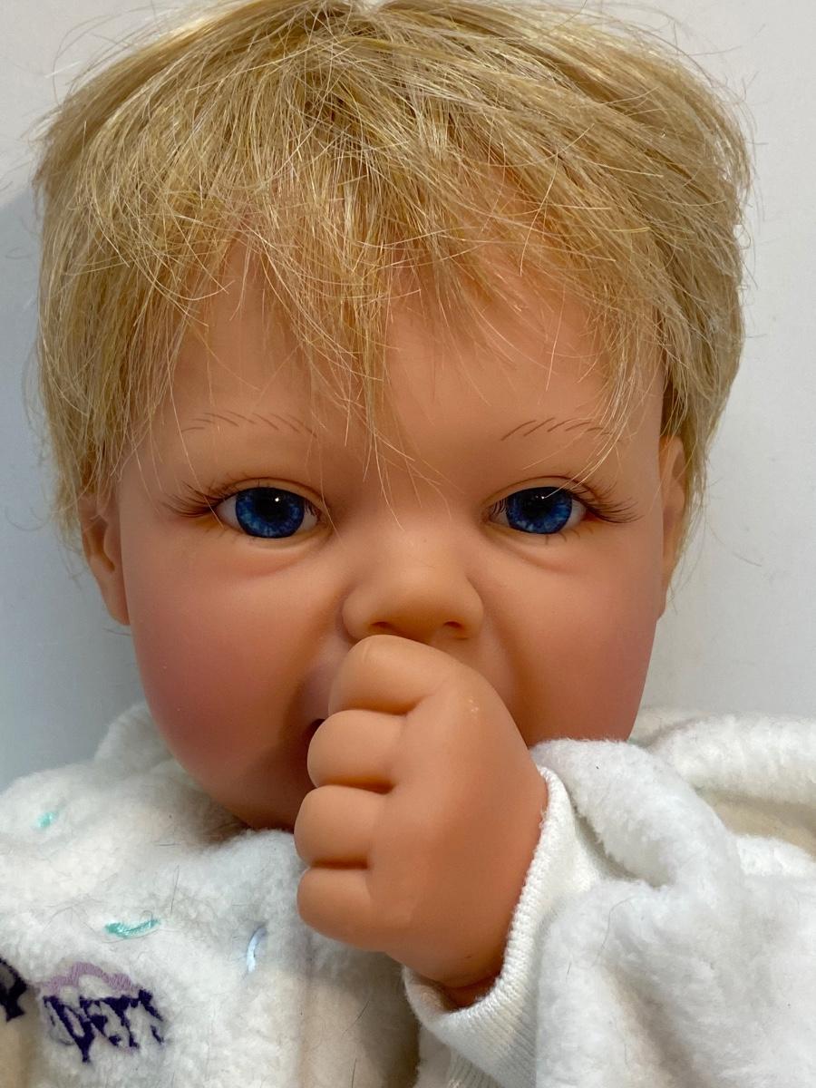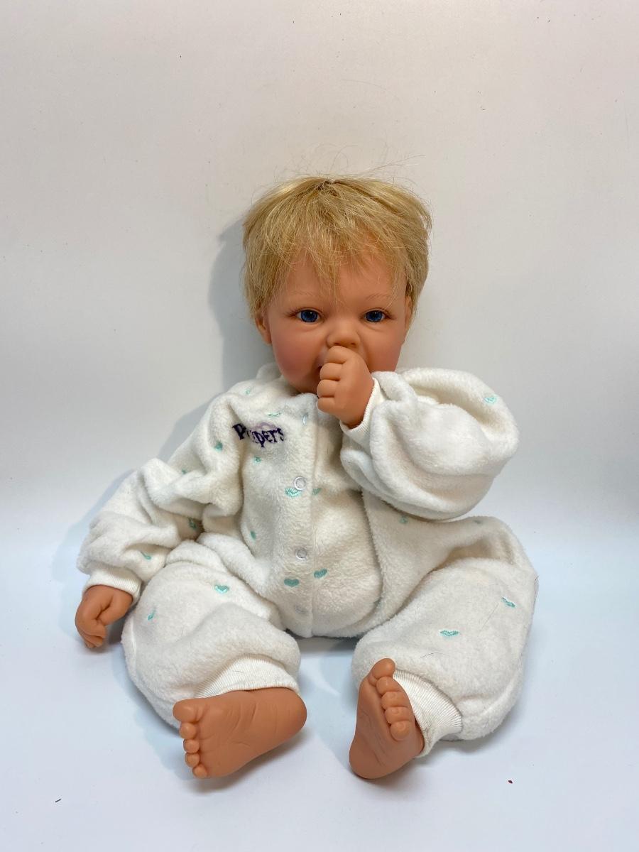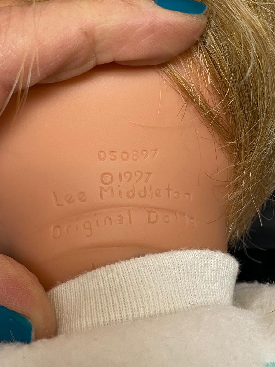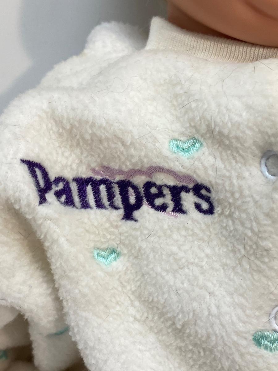 Large squishy soft body baby Reva, a Pampers Kid doll. Vinyl head and limbs can suck thumb. Back of neck marked Lee Middleton Original Dolls. Wearing a Pampers fleece pj onsie. In good condition.