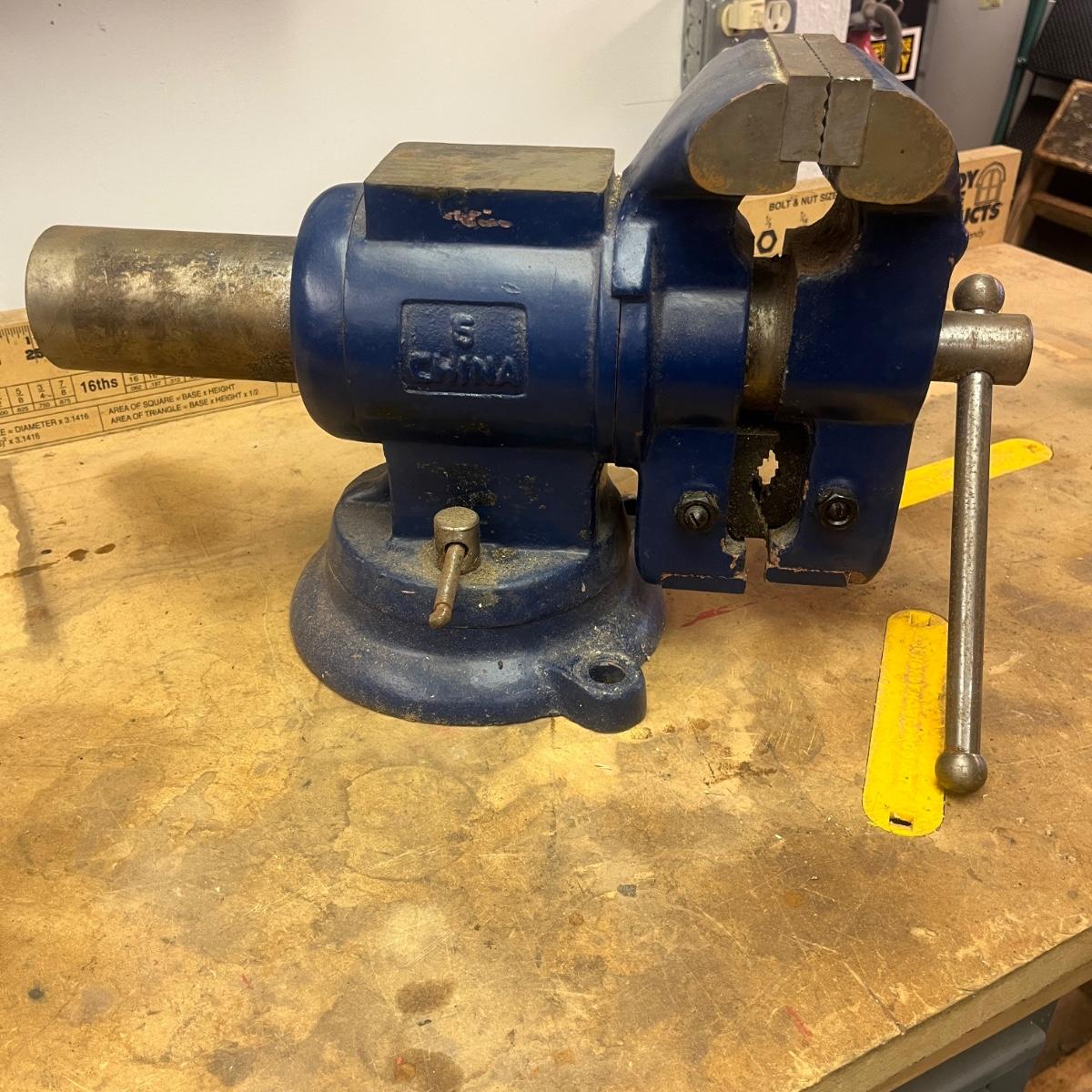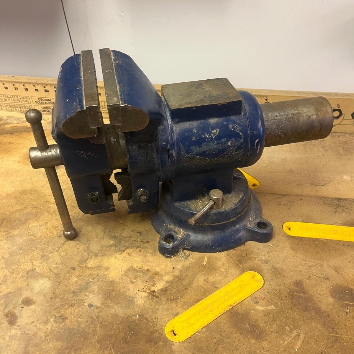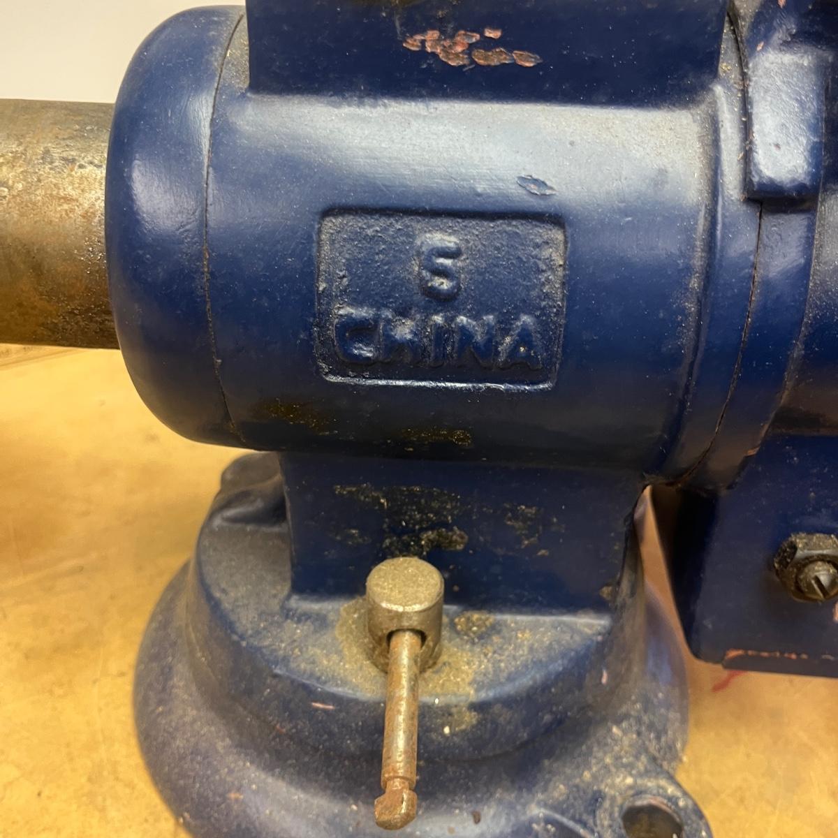 Lot includes a large vise with a swiveling head. Vise measures 17” x 7” x 10.5”H.