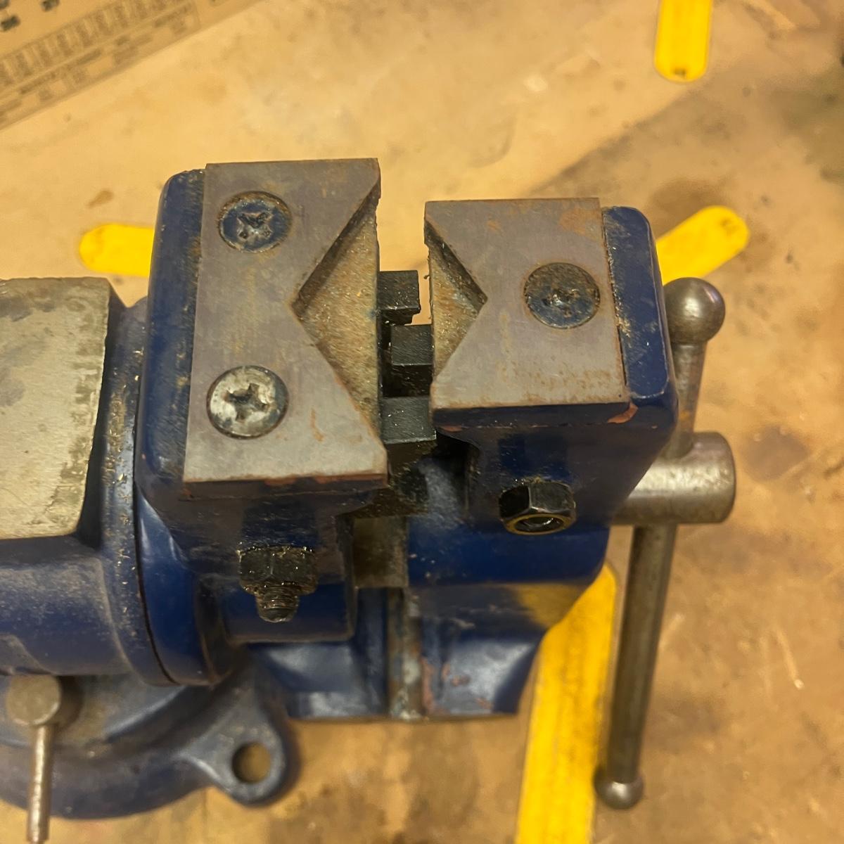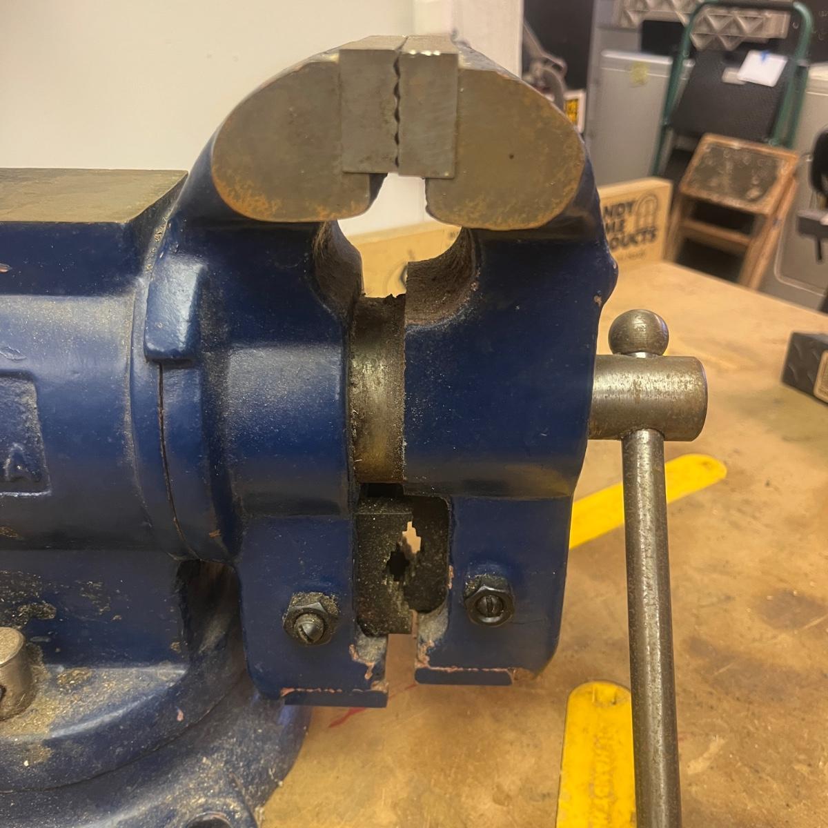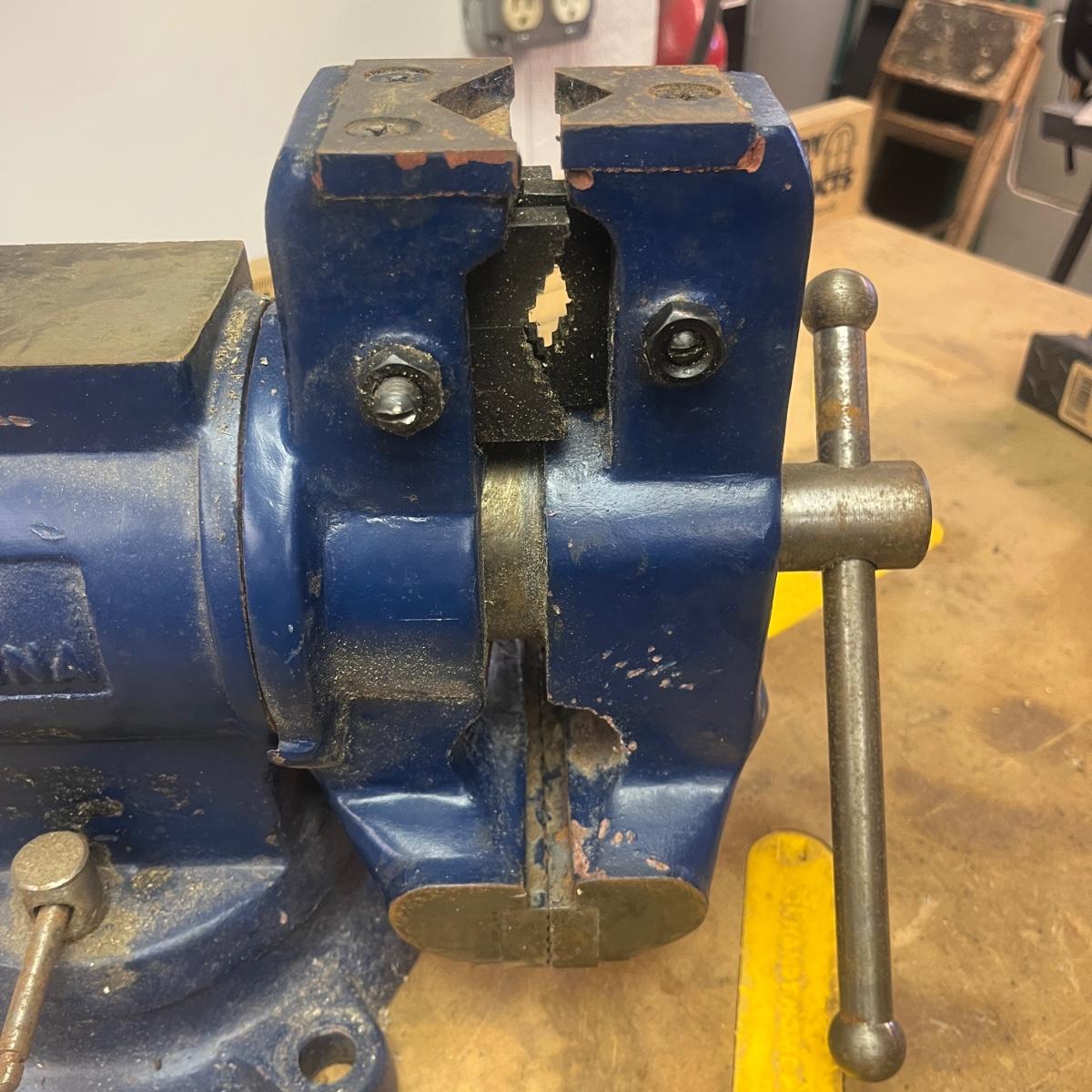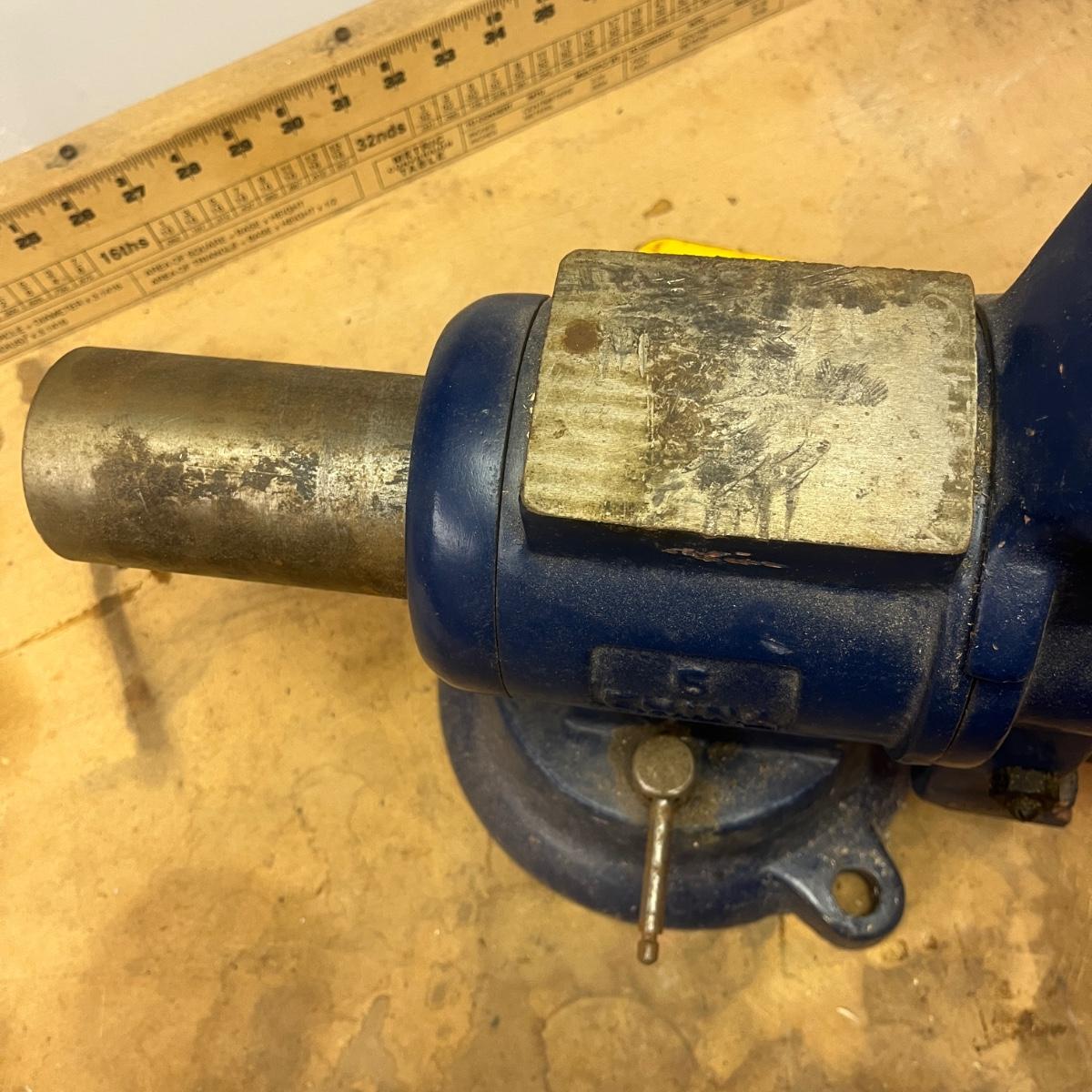 Lot includes a large vise with a swiveling head. Vise measures 17” x 7” x 10.5”H.
