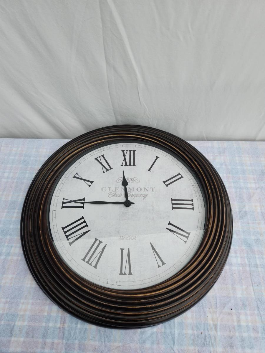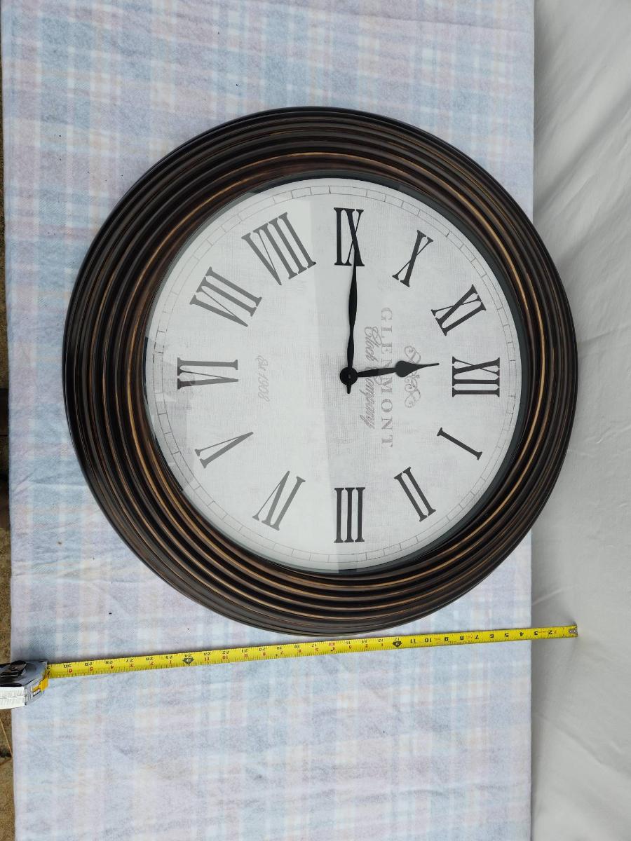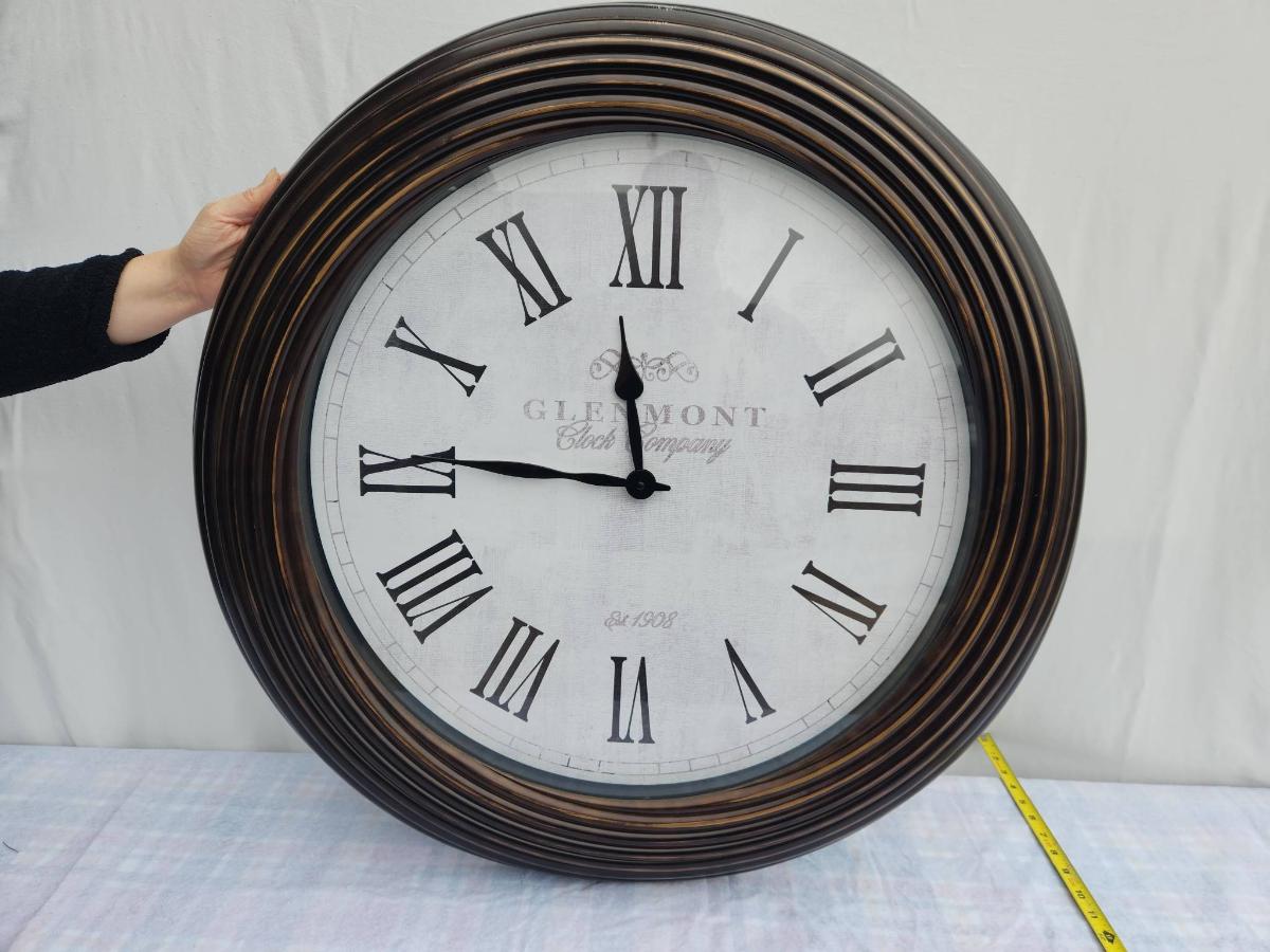 Large round wall clock featuring Roman numeral hour markers and black clock hands on a white face. The clock has a ribbed wooden frame in a dark finish. The face displays the text 'Glasgow, Great George St.' Diameter appears to be around 24 inches, based on the measurement reference visible.