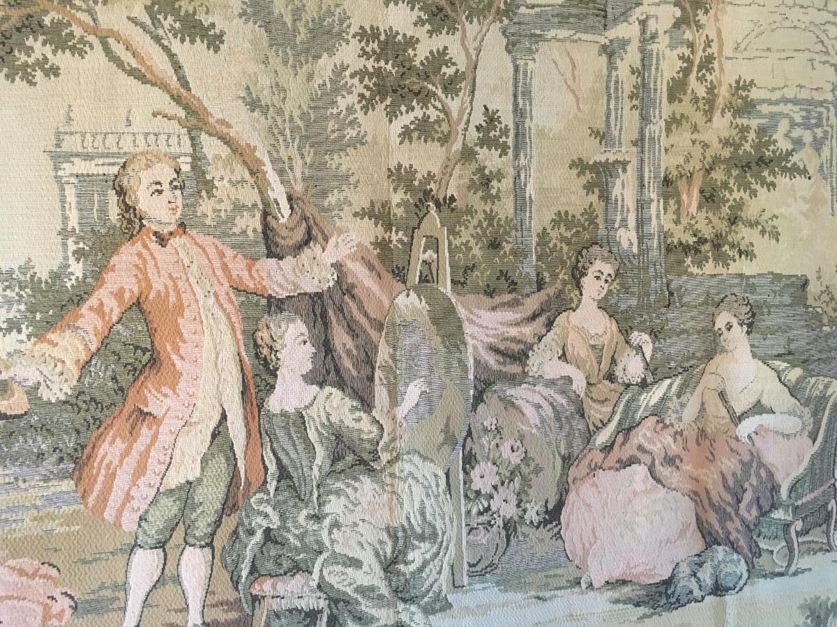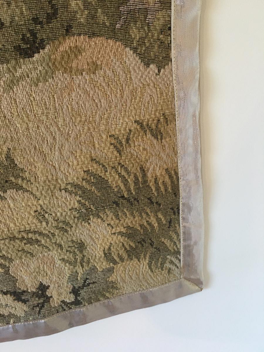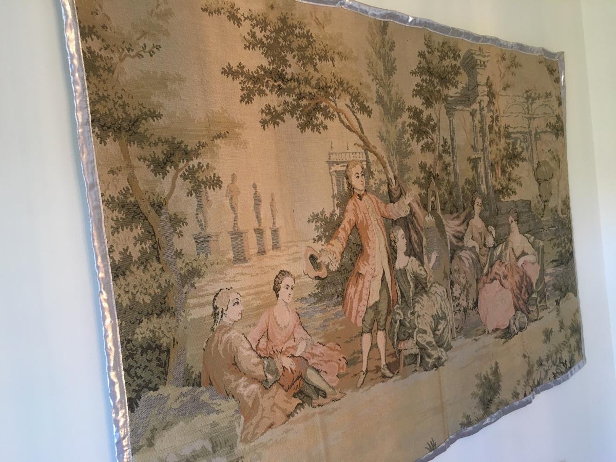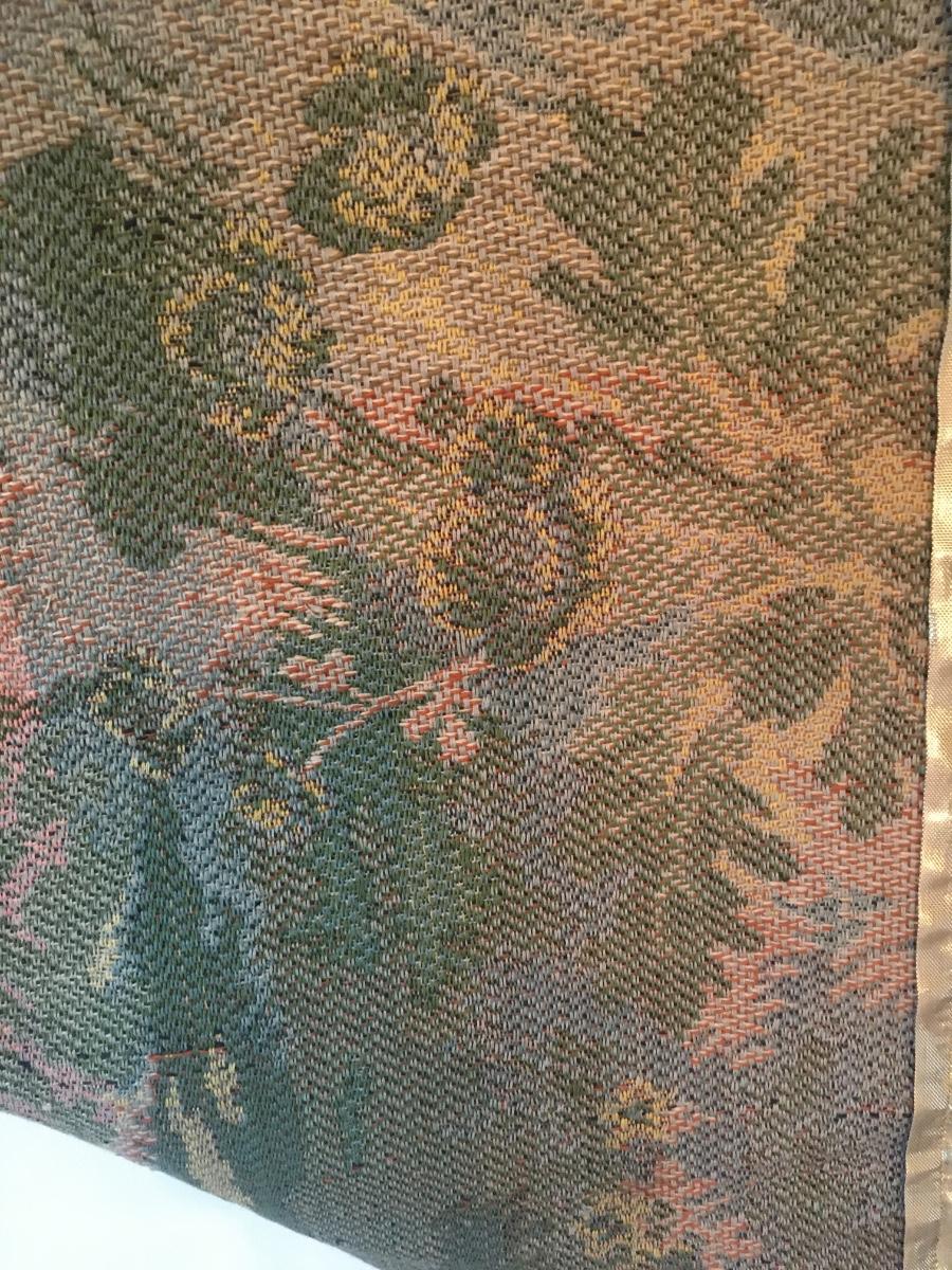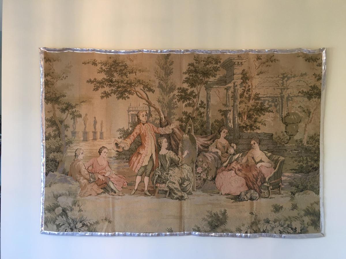 Large wall hanging tapestry lined with metallic trim. Unlabeled. IN excellent condition. Measurements in photos.
