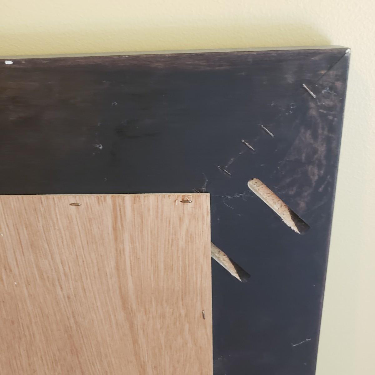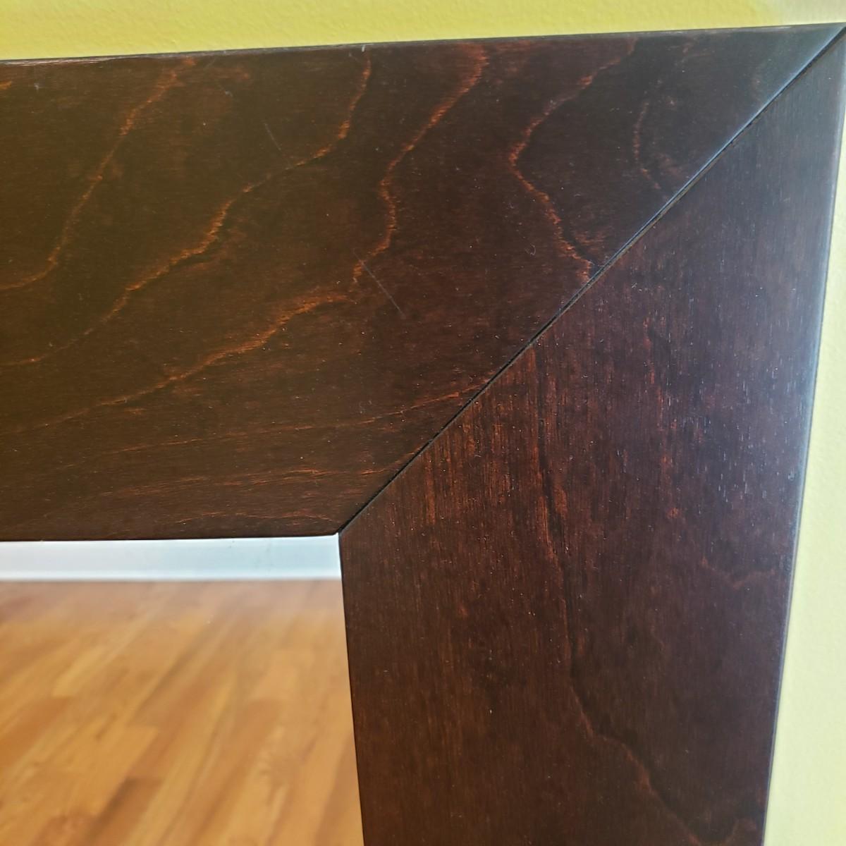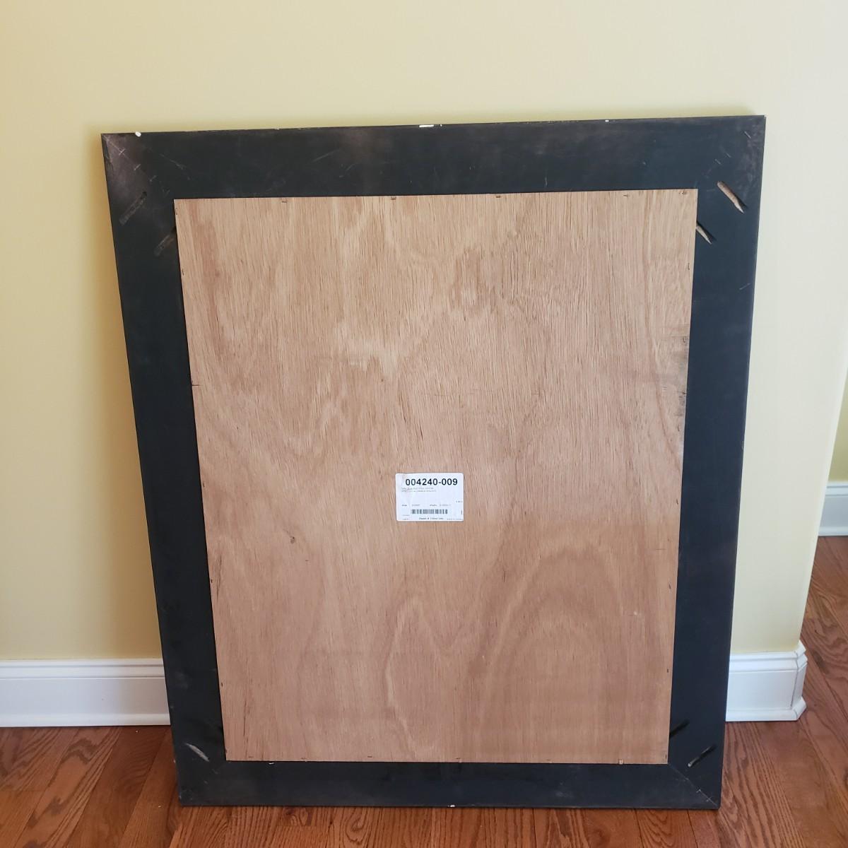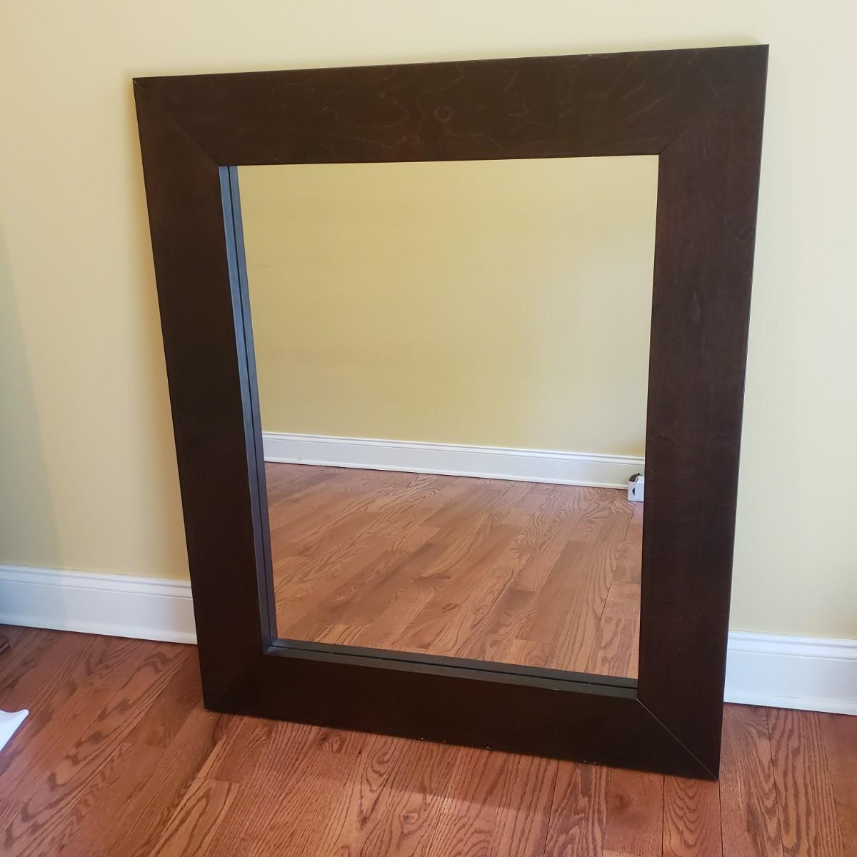 This lot contains a large, heavy walnut finished wooden framed mirror. The mirror measures 35" x 42". There is a mark on the back that is not visible from the front. There is no hardware on the back to hang it.