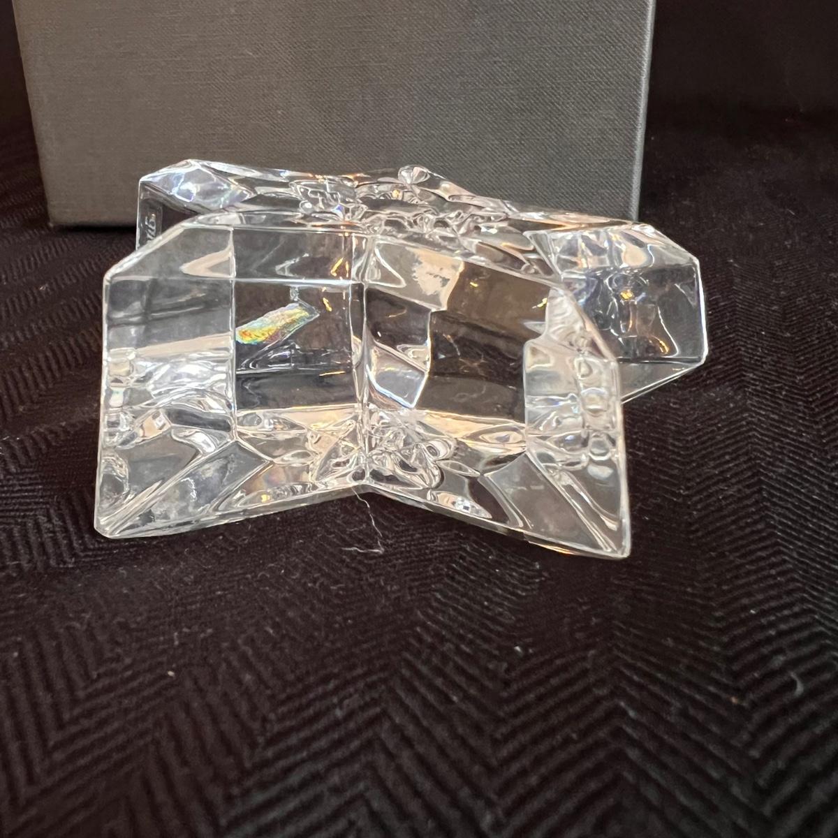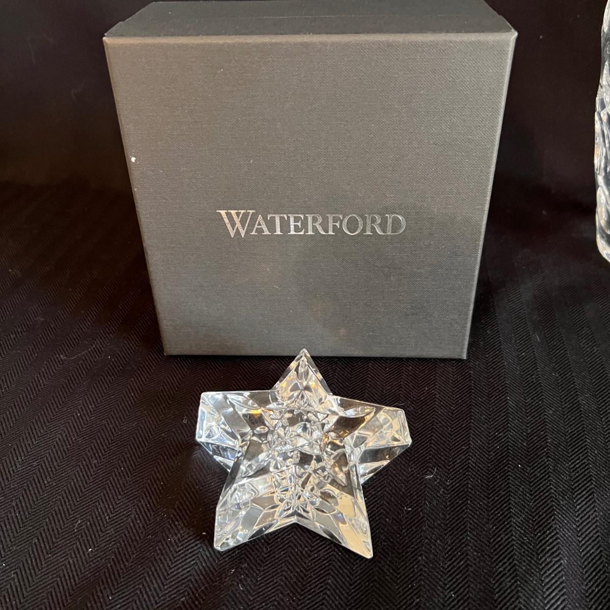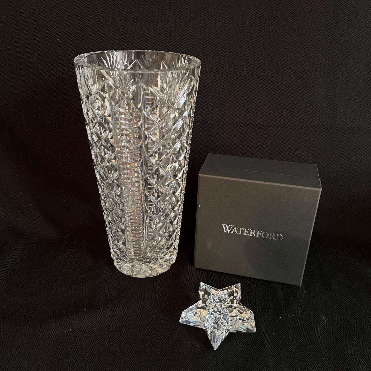 Two Waterford Crystal glass items includes a vase and a decorative star. The large vase is likely their pineapple design and measures 6”D (top) x 12”H. It has a very tiny chip on the rim that is smooth to the touch and very easy to miss. Star comes with its original box and measures 3” x 3” x 1.5”H.