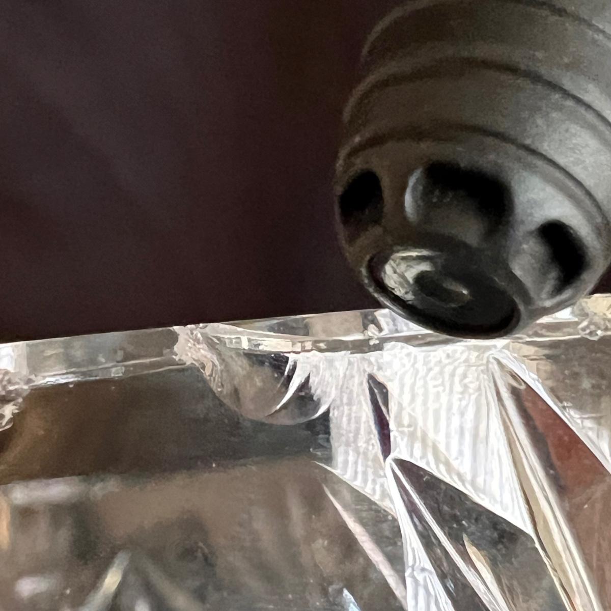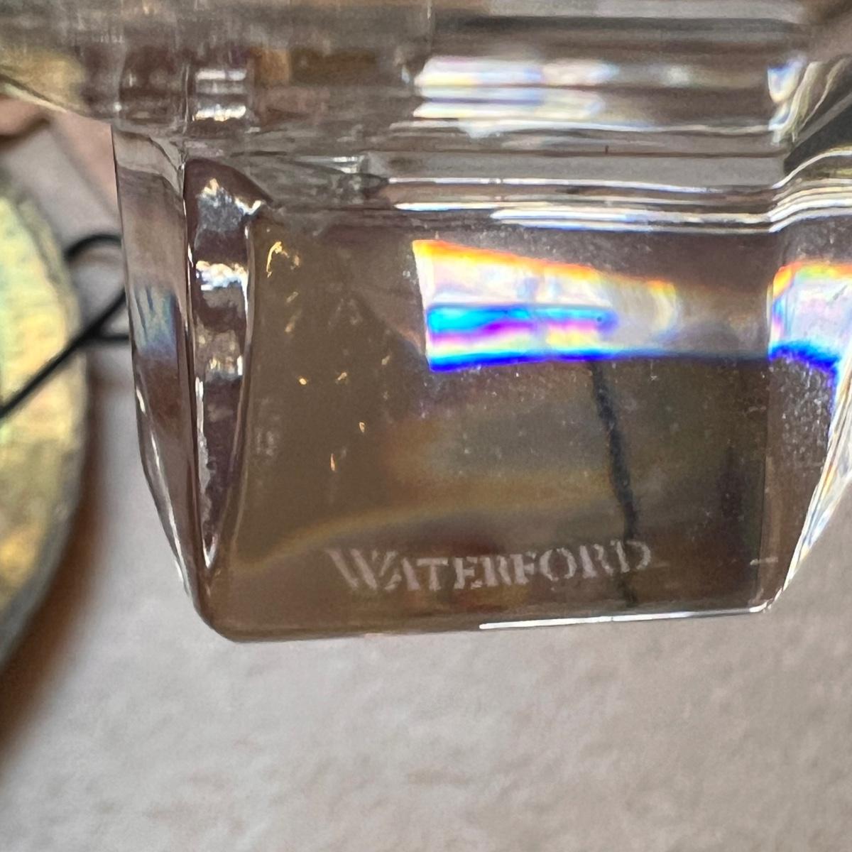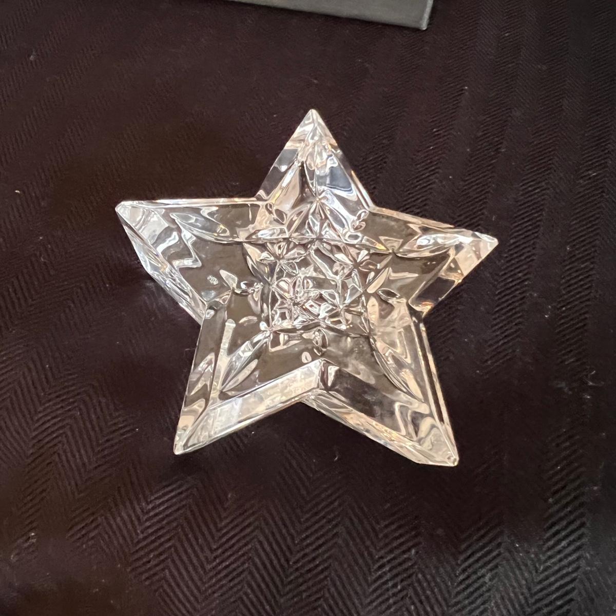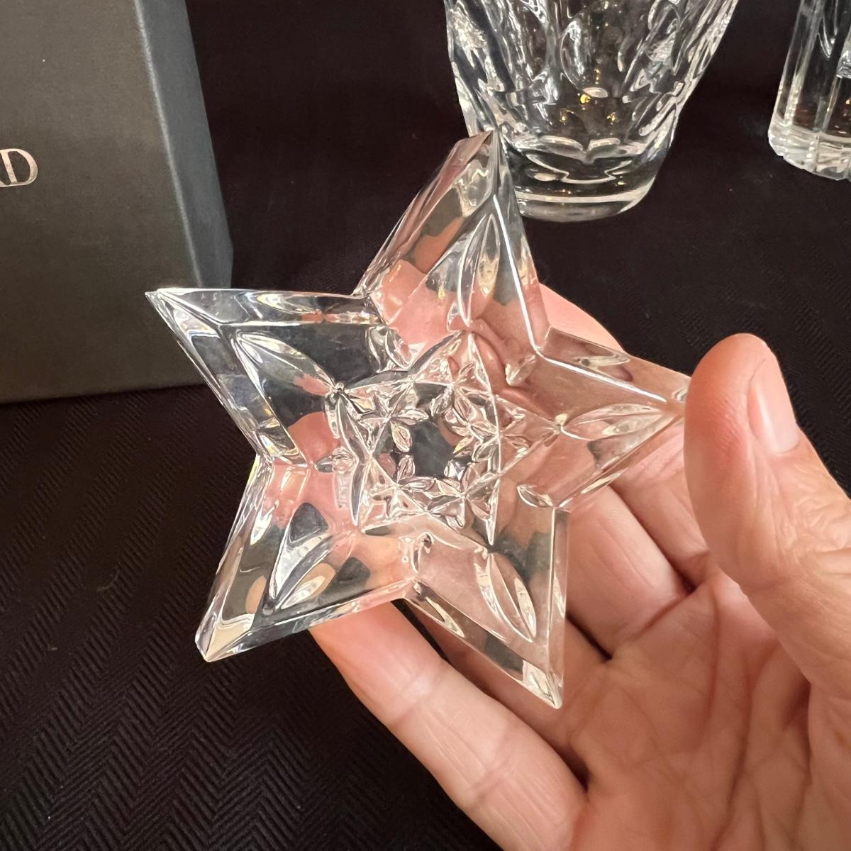 Two Waterford Crystal glass items includes a vase and a decorative star. The large vase is likely their pineapple design and measures 6”D (top) x 12”H. It has a very tiny chip on the rim that is smooth to the touch and very easy to miss. Star comes with its original box and measures 3” x 3” x 1.5”H.