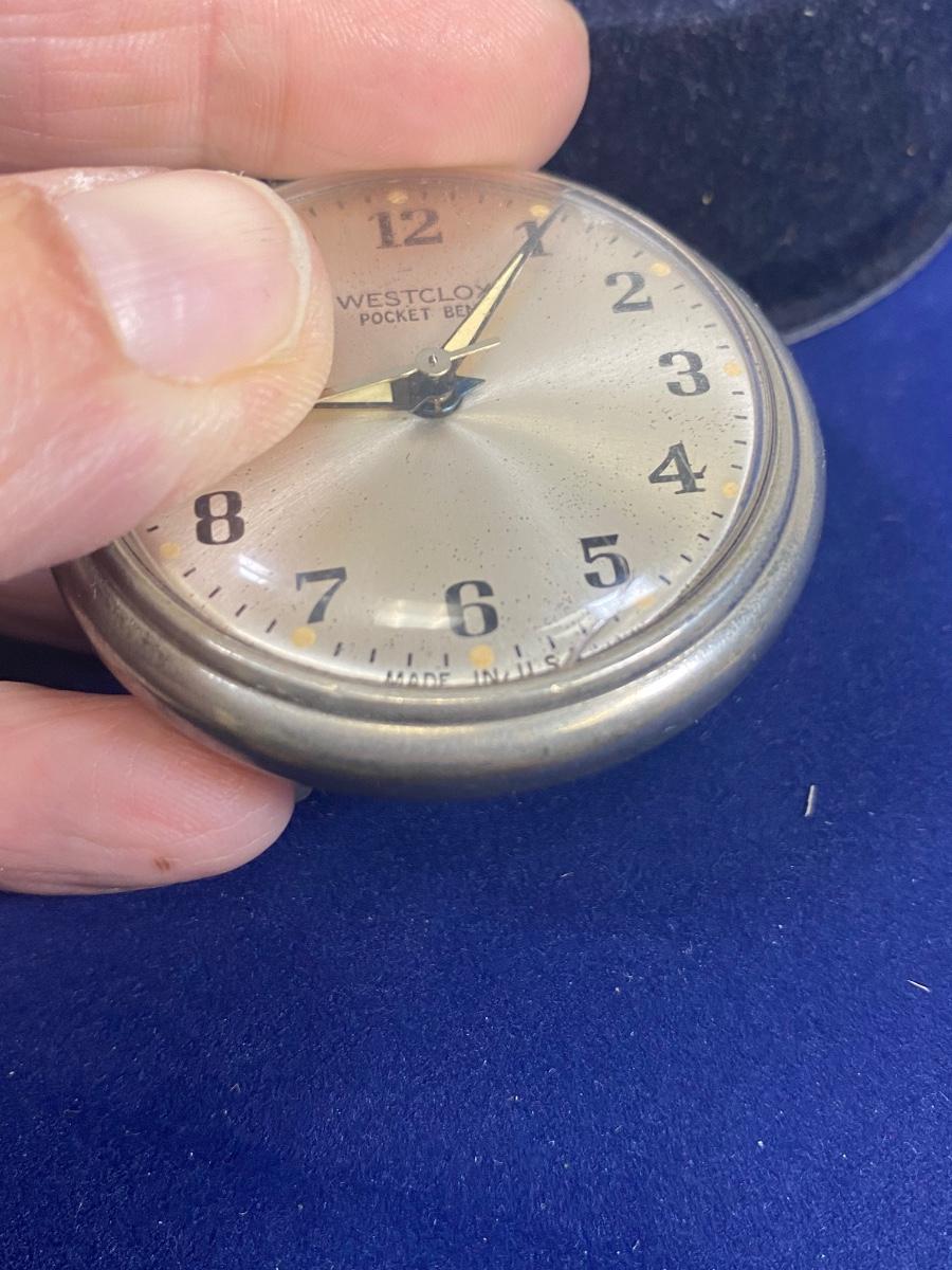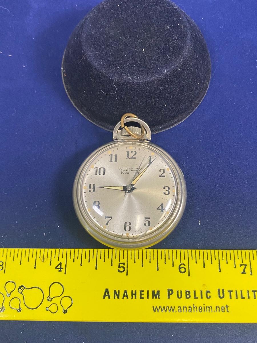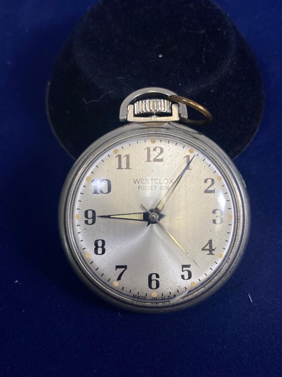 Large Westclox Pocket Ben Pocket Watch. Watch does wind and is running. Some light scratches from use. 2" size.