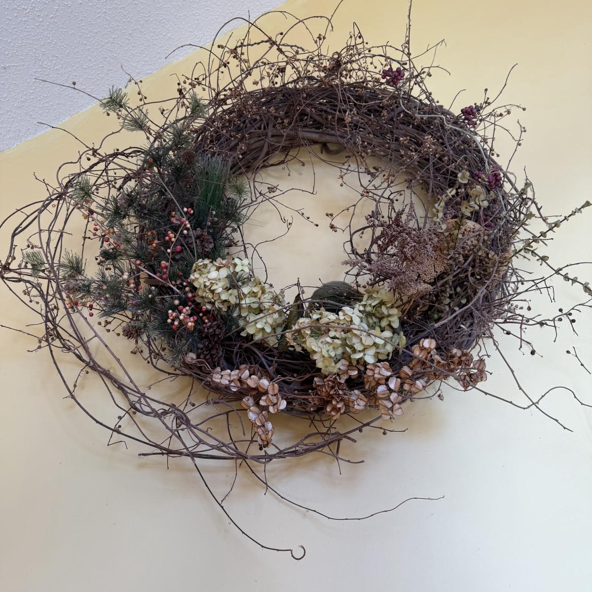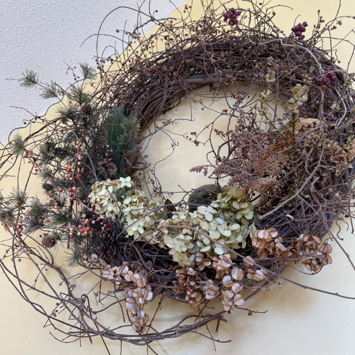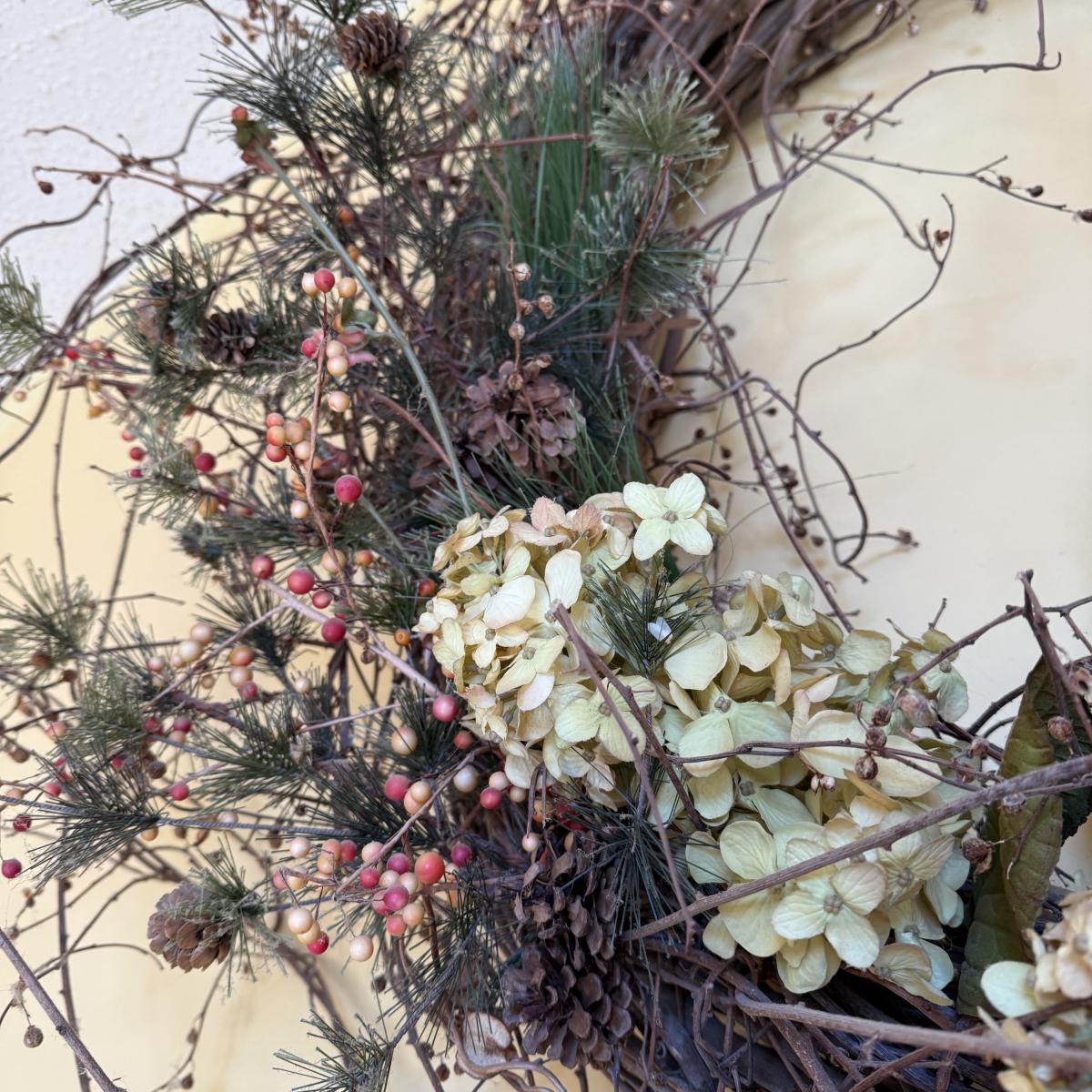 This lot contains a whimsical, large decorative wreath. The base measures approximately 29”D, however there are a few wispy branches that sprawl a bit further out, see pictures for details. While some of it does appear to be made out of real, dried raw material such as the base is made out of real branches, some of the decorative accents are faux flowers. Local pickup only.