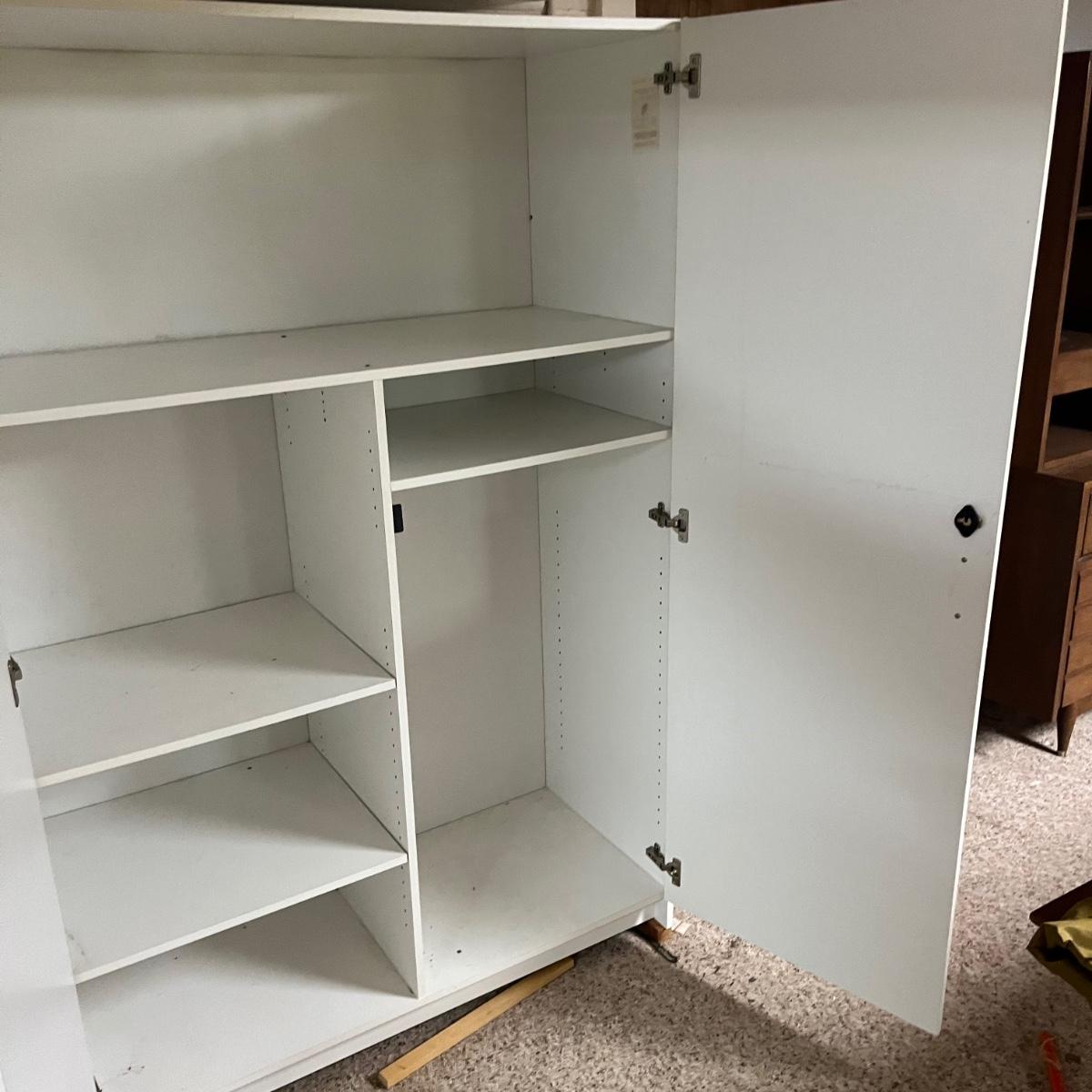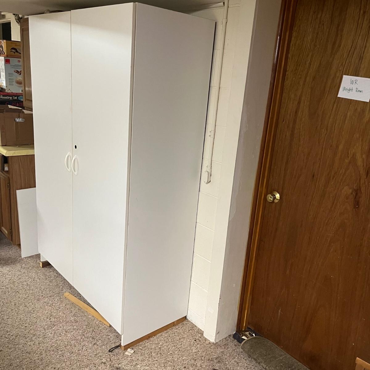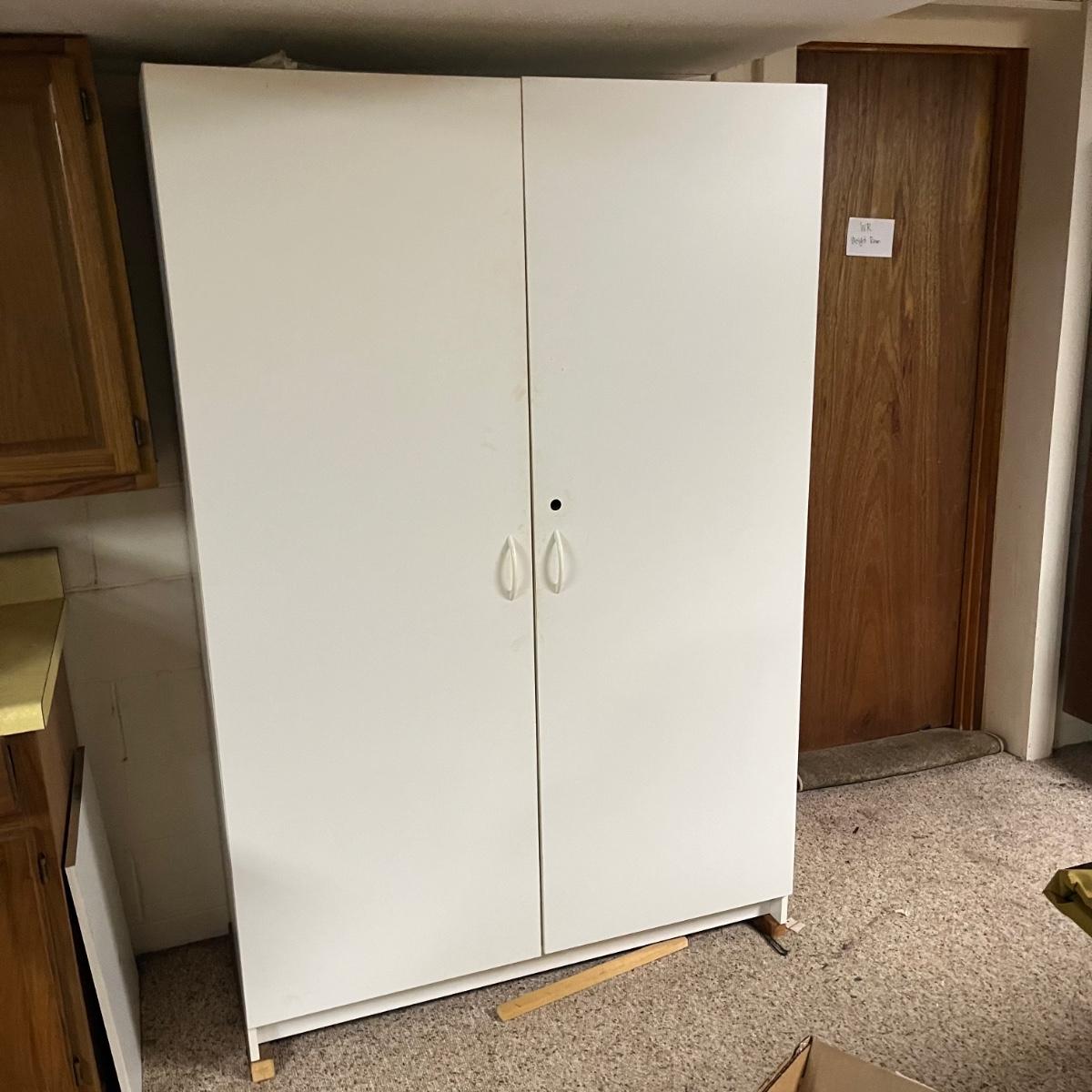 Lot includes a large white cabinet with adjustable shelves. Cabinet measures 48” x 20” x 72.5”. Cabinet does not have its key. It is made from pressed wood.