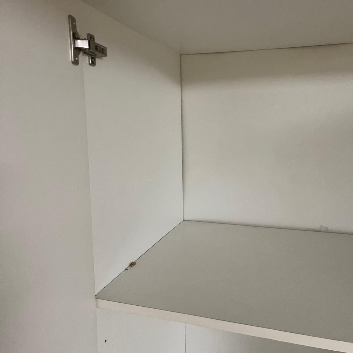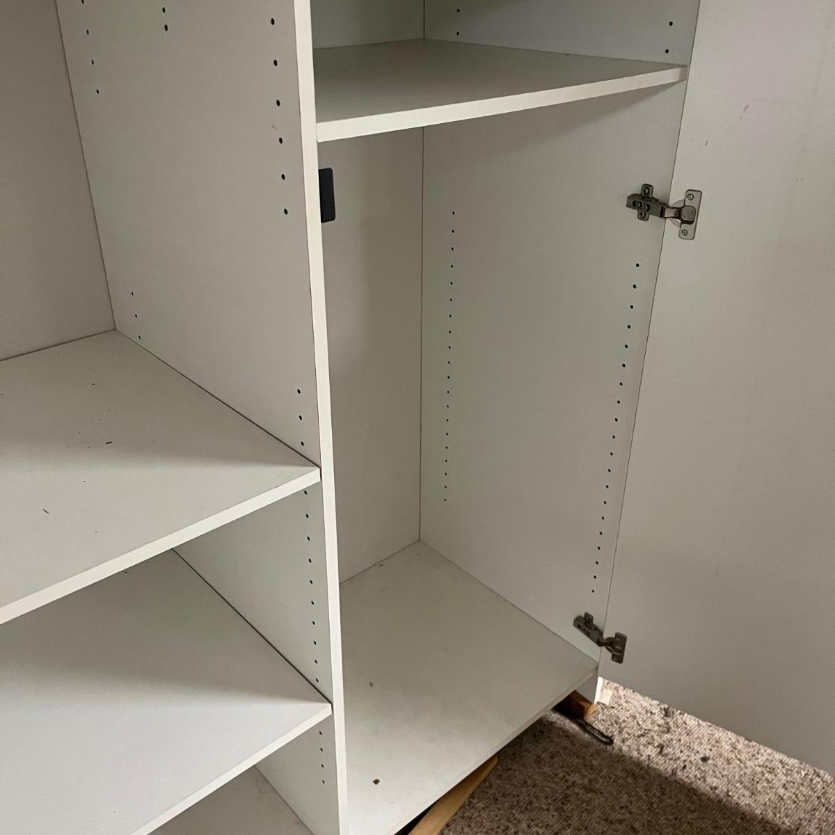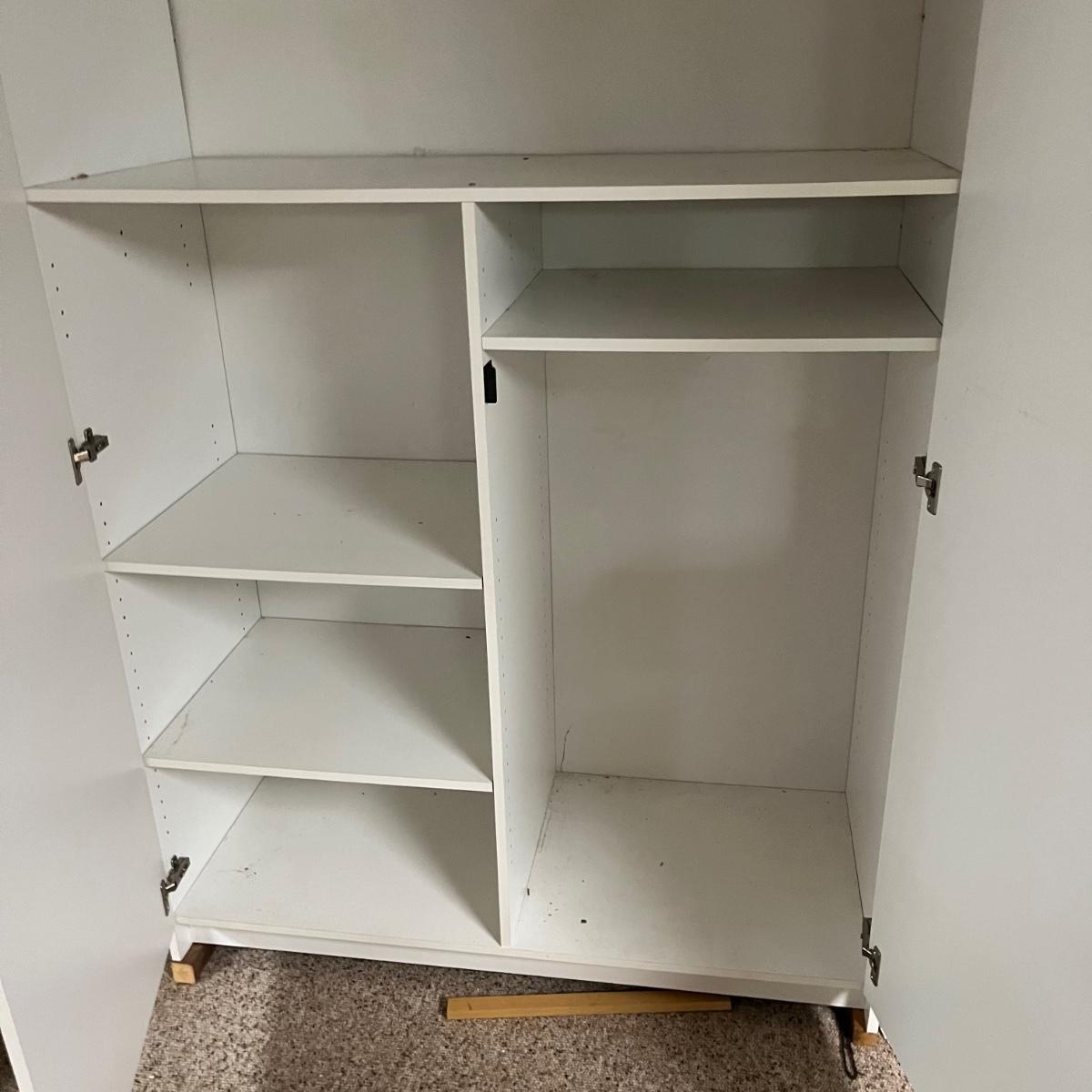Lot includes a large white cabinet with adjustable shelves. Cabinet measures 48” x 20” x 72.5”. Cabinet does not have its key. It is made from pressed wood.