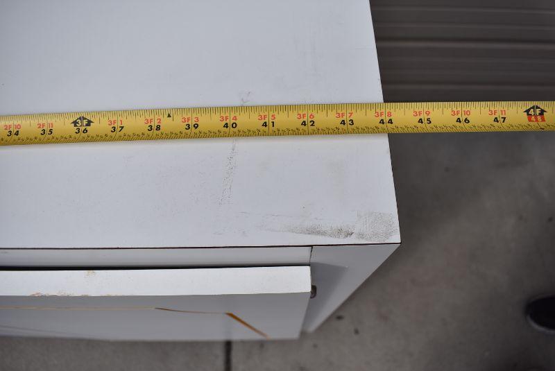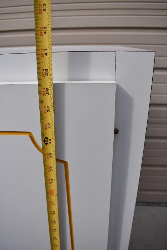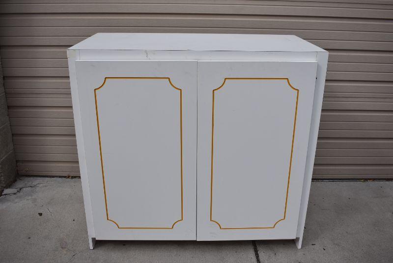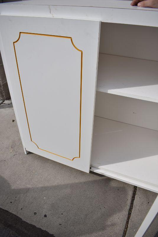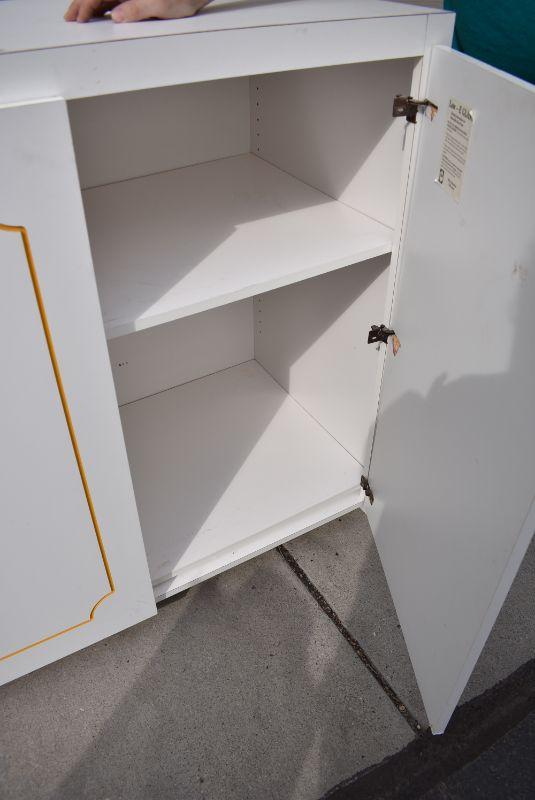 Large White Cabinet with Yellow Accents, 2 inside shelves, damaged hinges