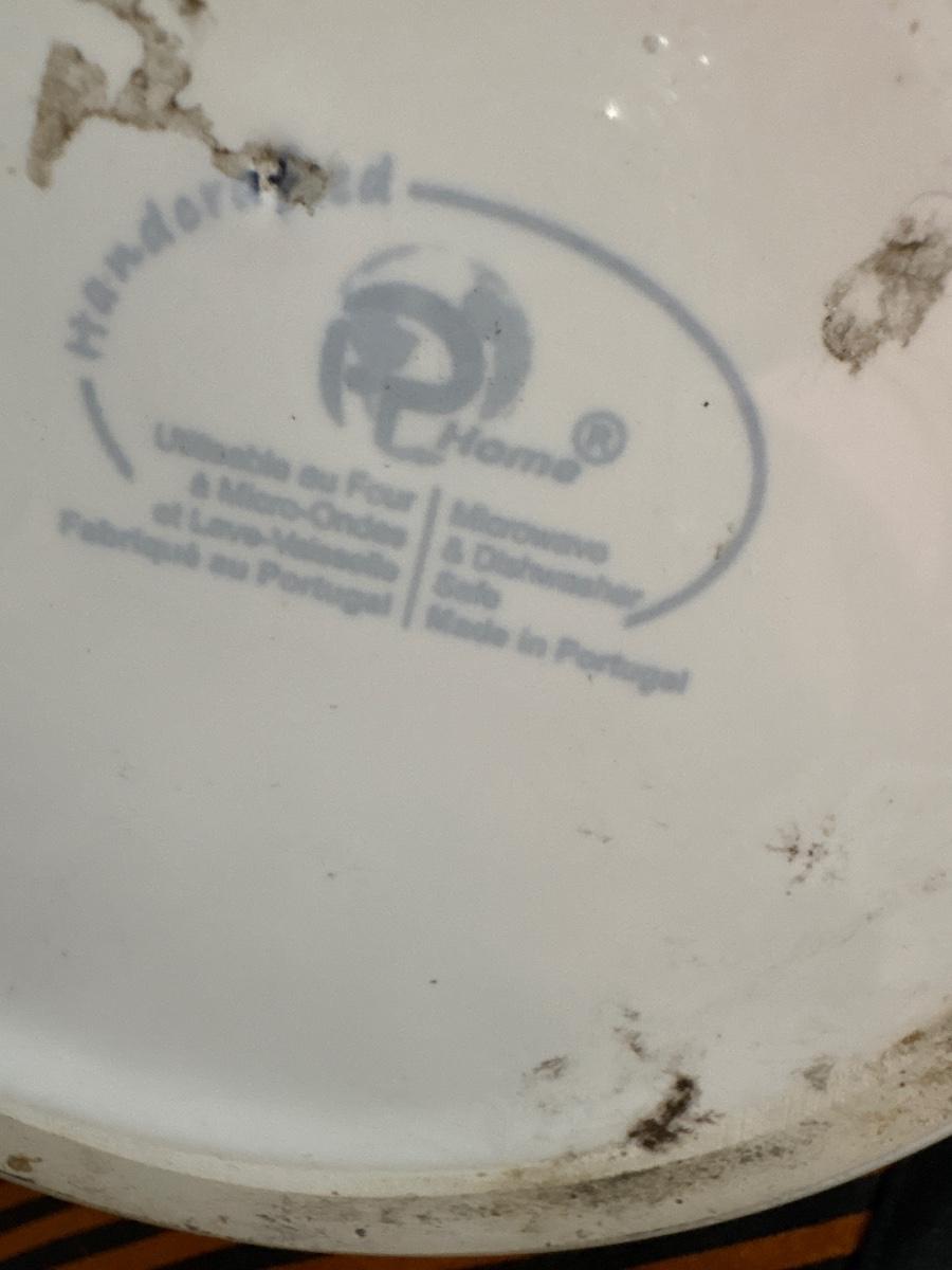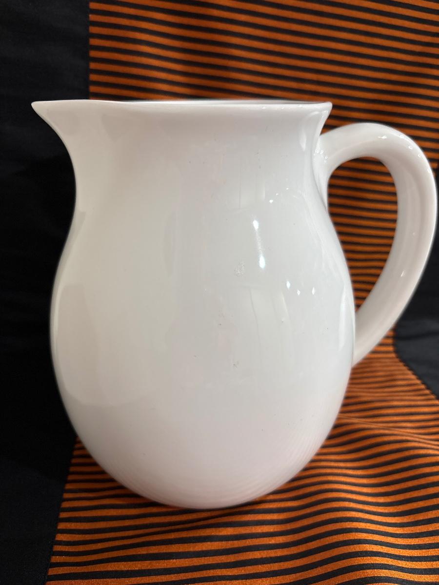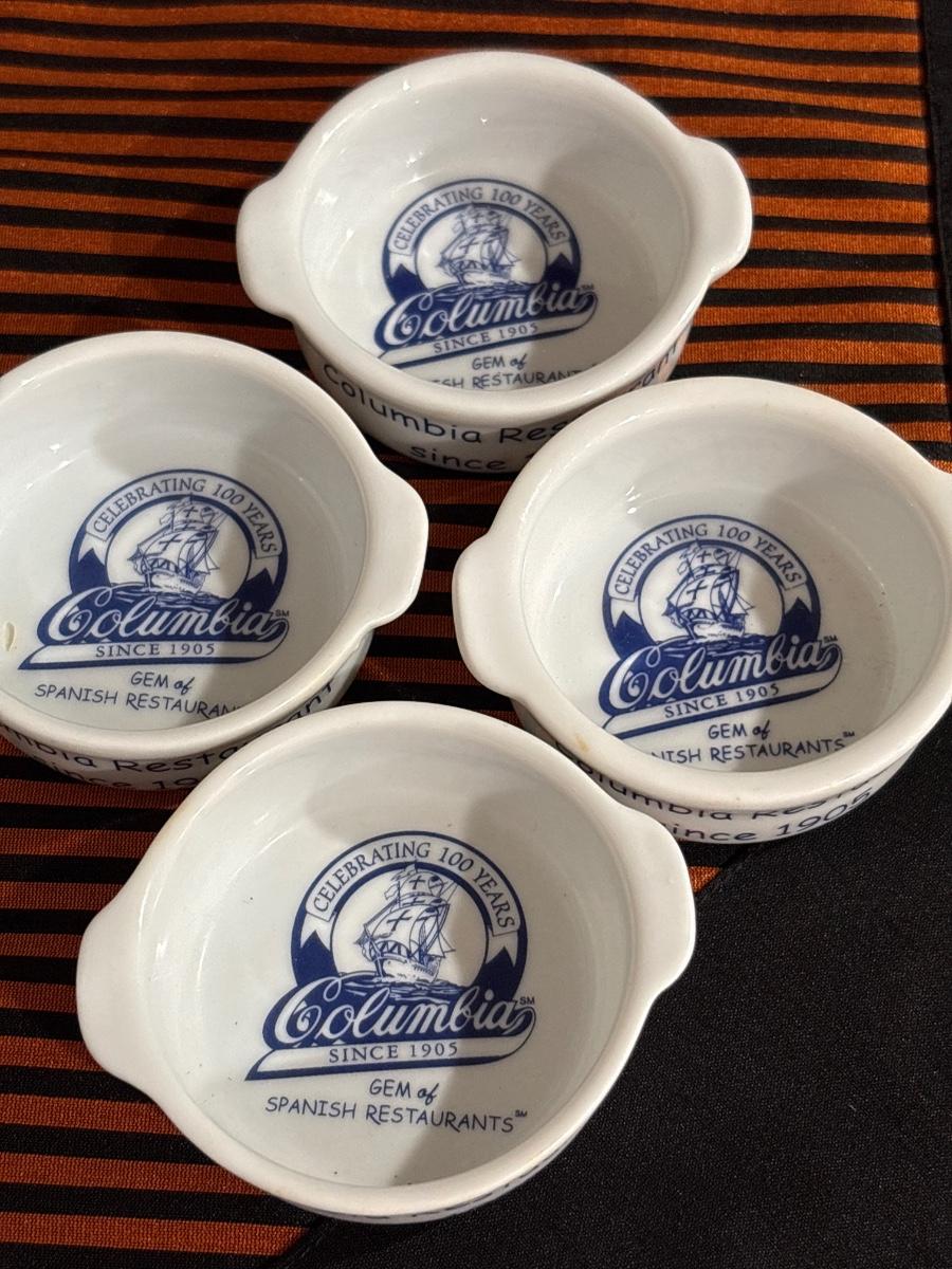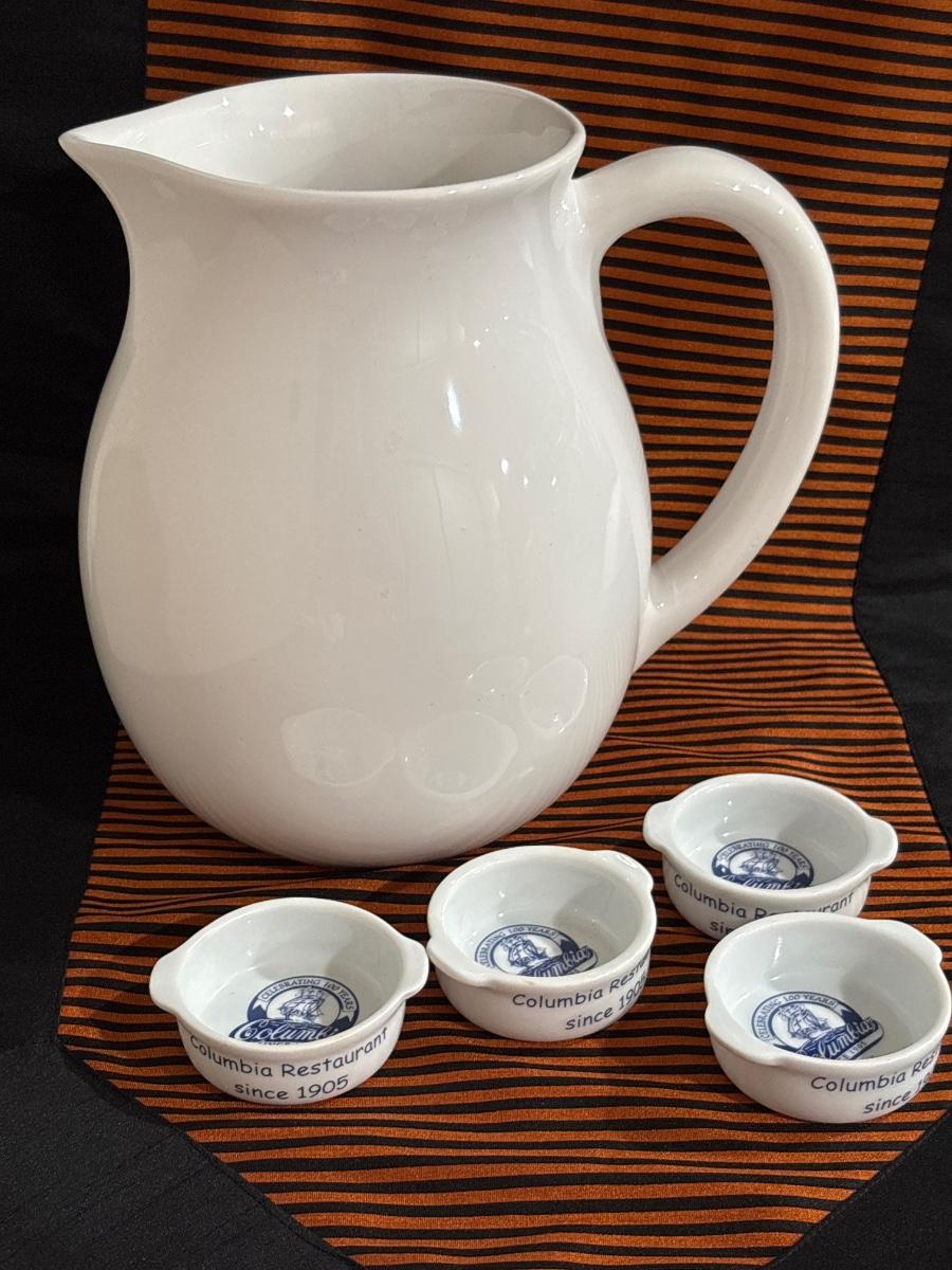 White ceramic pitcher 8” H. Set of four dipping dishes 2.5” A collectible from Columbia Spanis Restaurant.