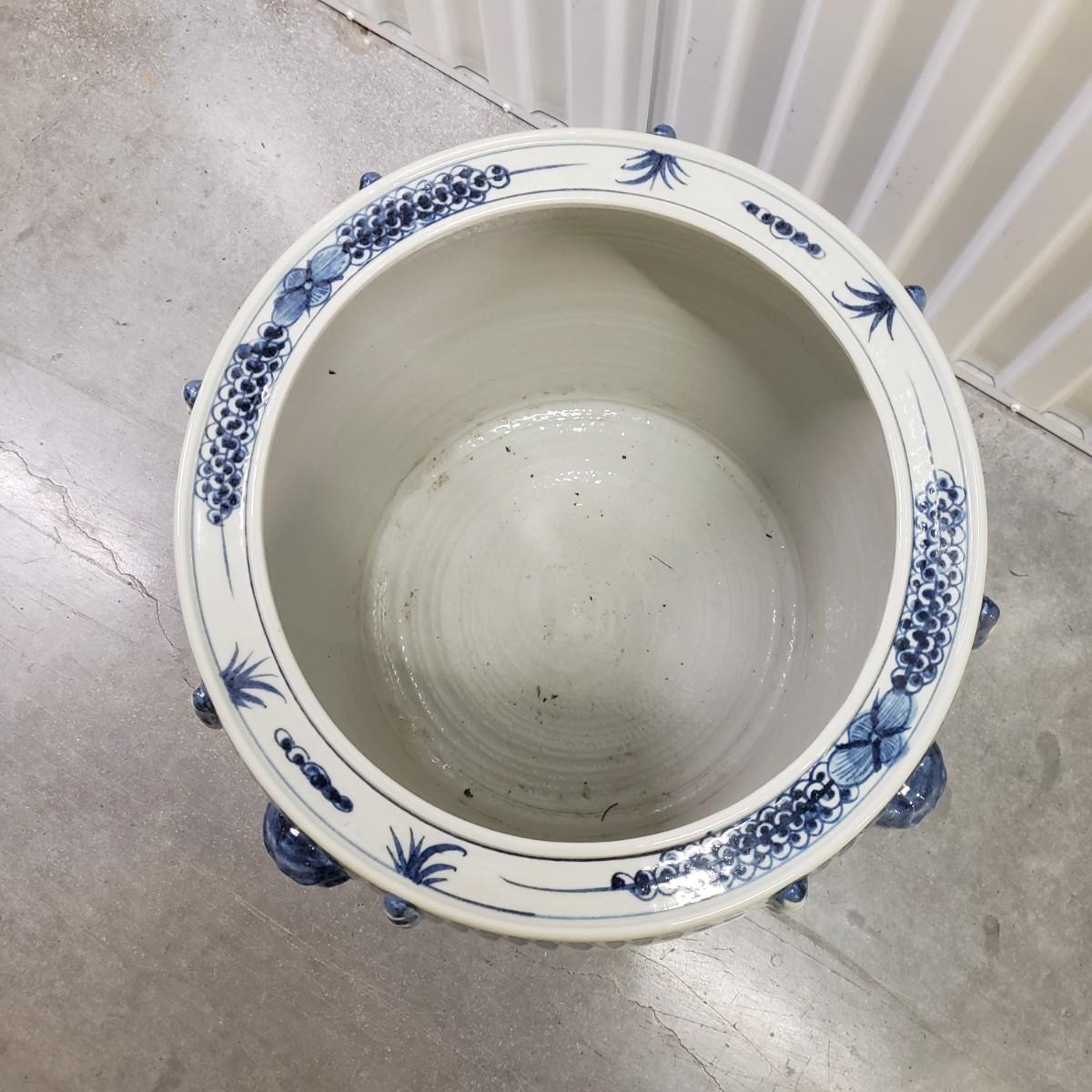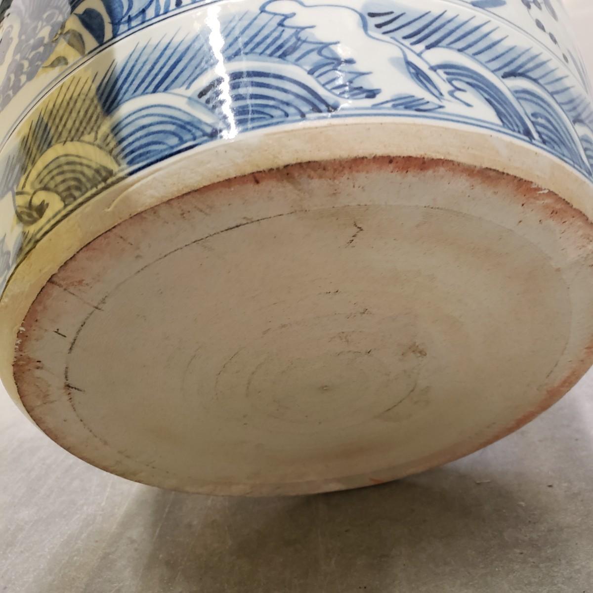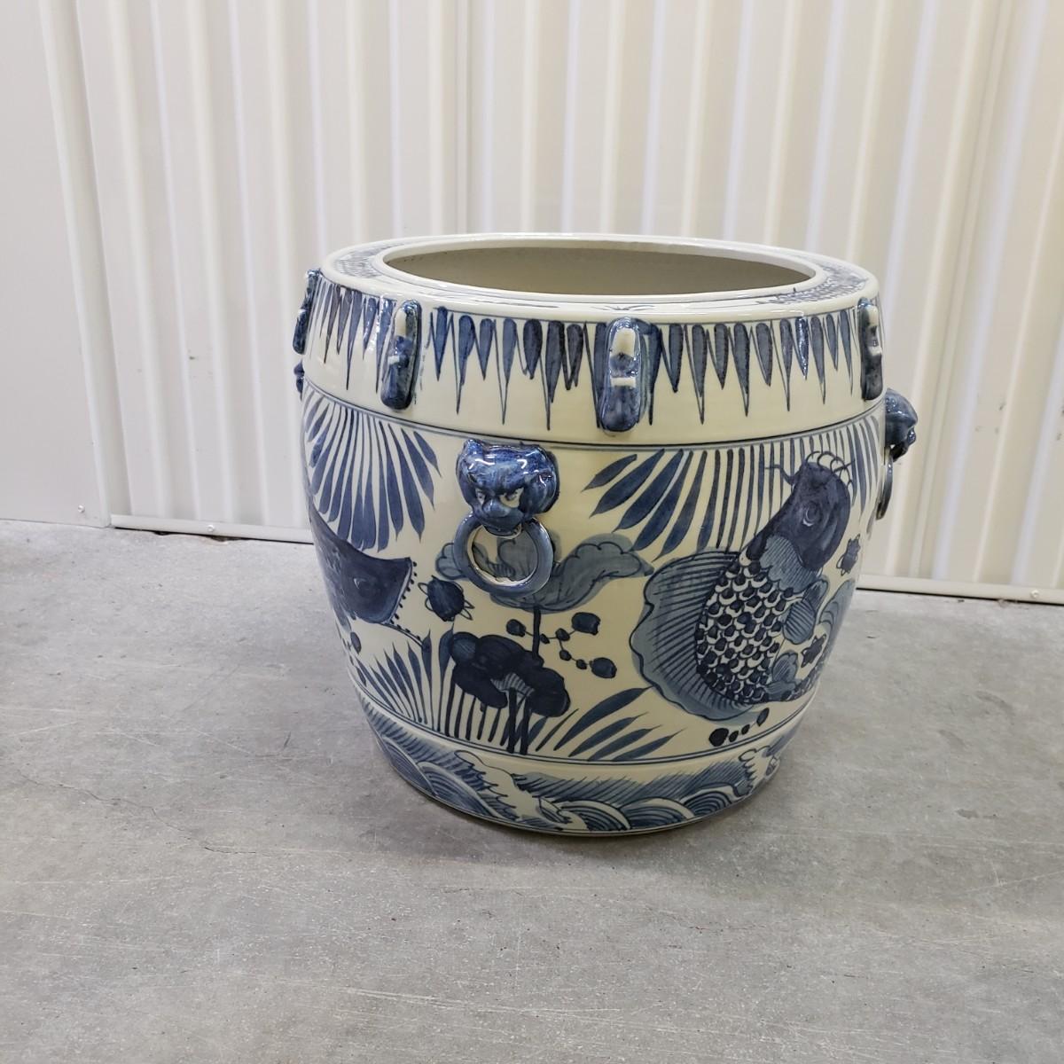 This heavy, large, ceramic Asian pot measures approximately 18" x 18" H. The blue painting of Koi and flowers are beautifully done. The dragon heads with a ring in their mouth are three dimensional.