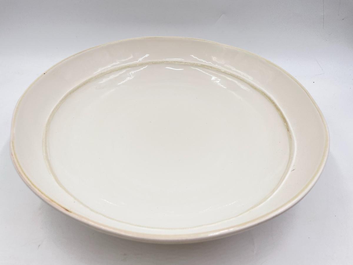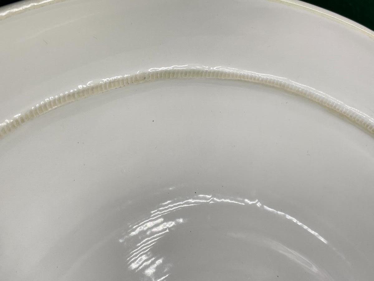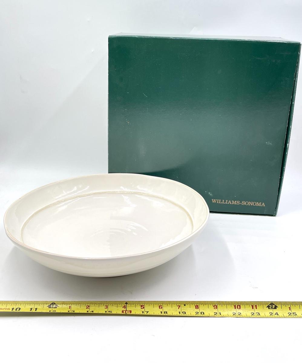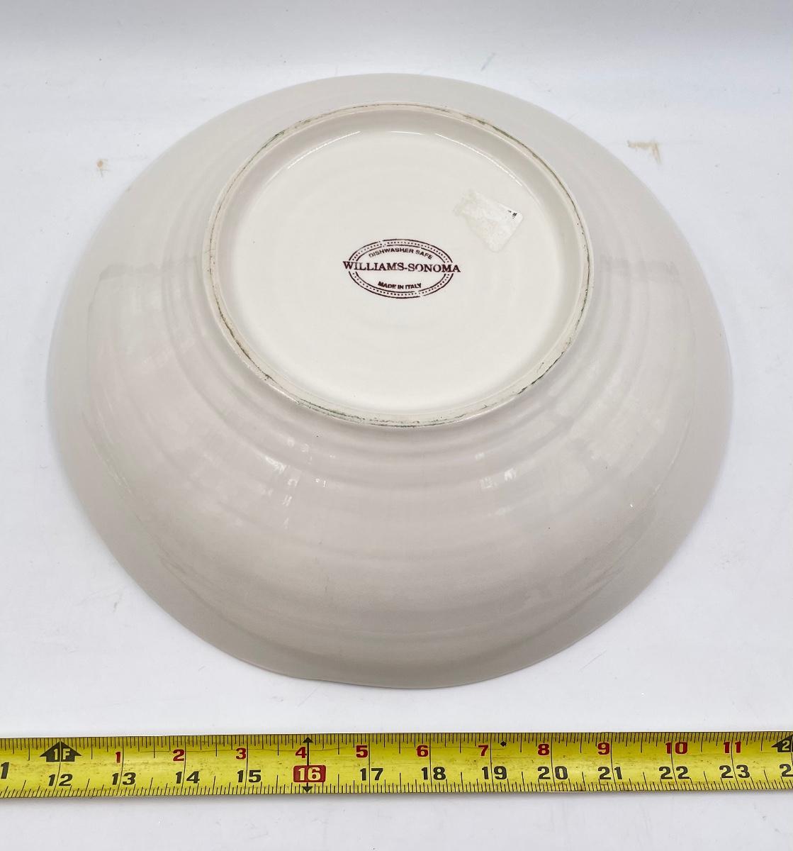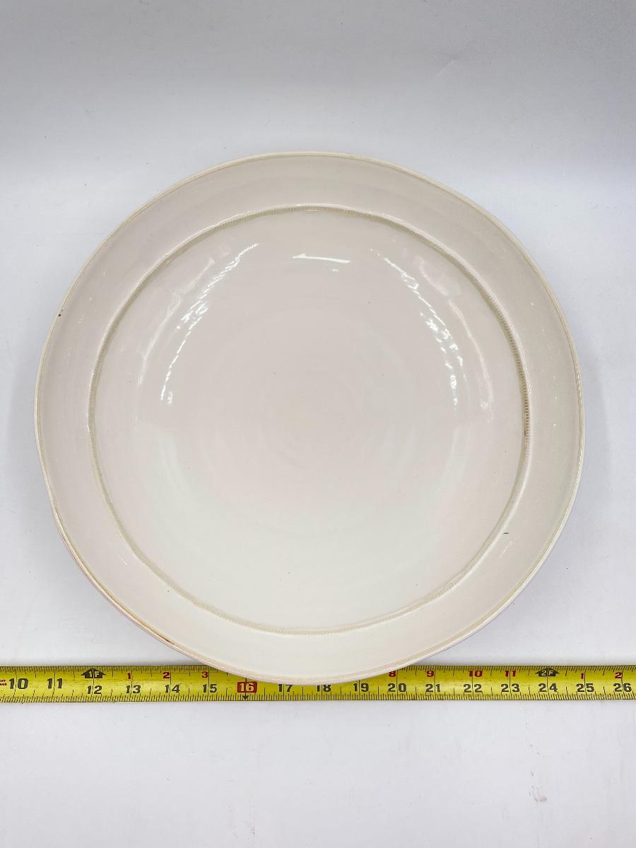 In great condition! This is a nice and sturdy bowl, possibly porcelain? Approx 14” in diameter.