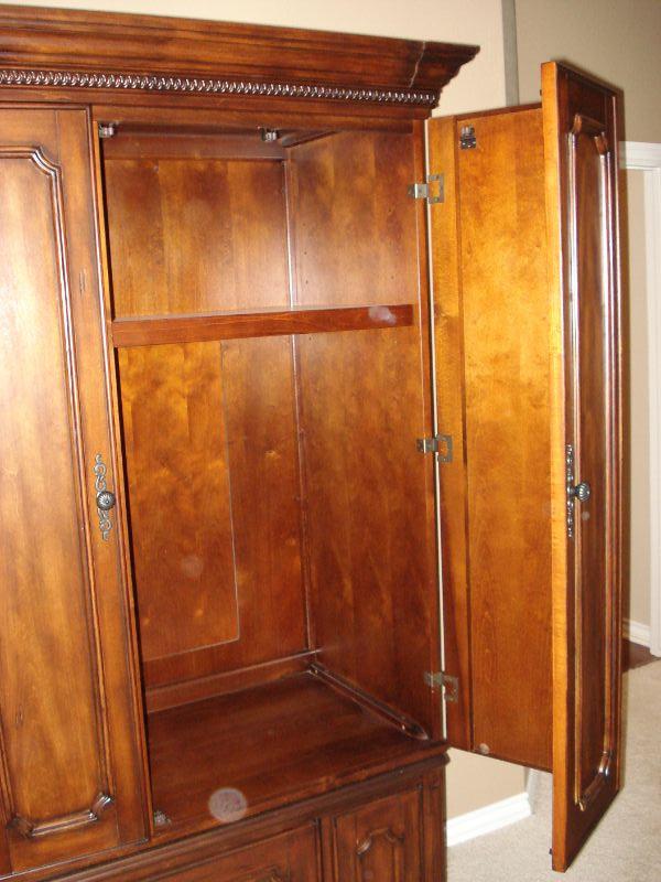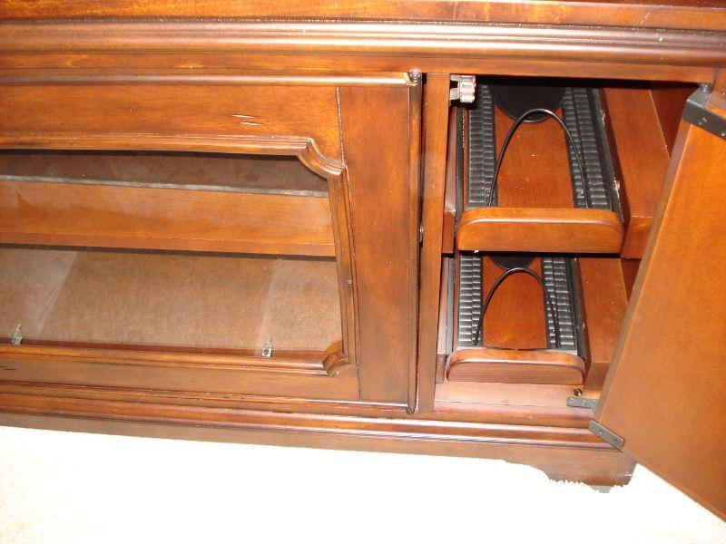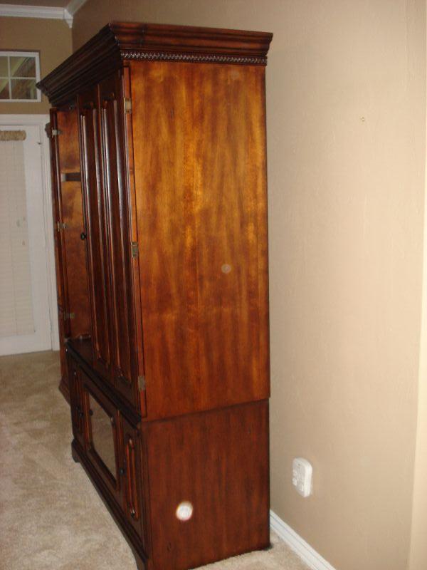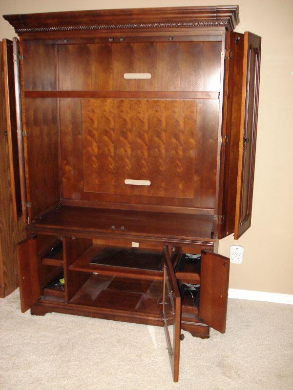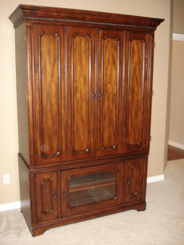 This is one of the nicest TV armoires I've seen around with nice wood and sturdy doors. Doors will fold all the way back around side. Holders for CD's in bottom on side doors, glass in center bottom for dust protection on electronics. 78" tall x 21" deep by 50" wide. Bring help and a handcart in moving this. Excellent or like new condition.