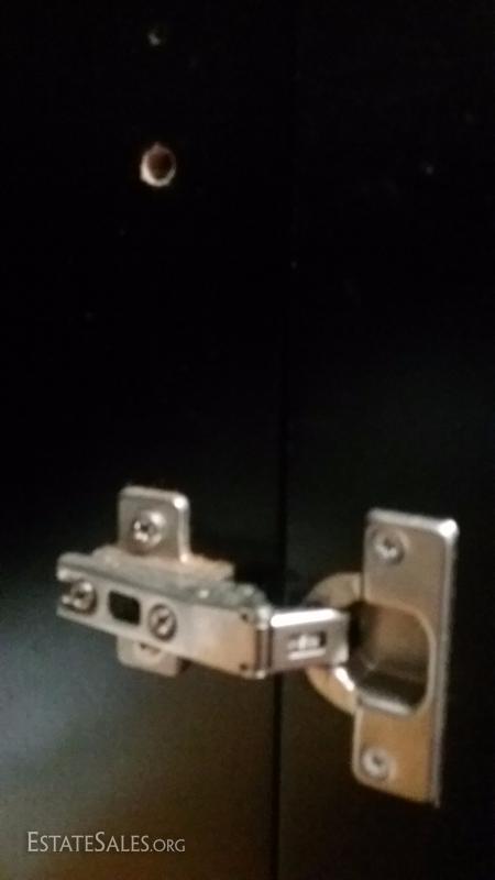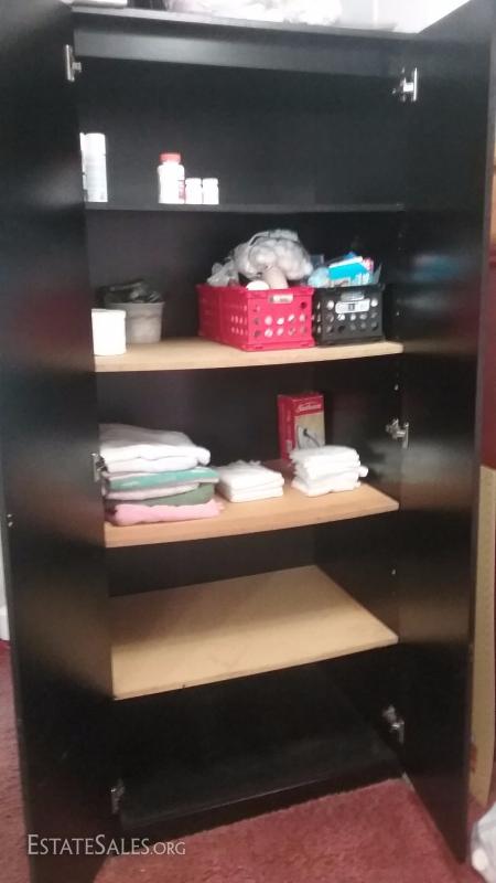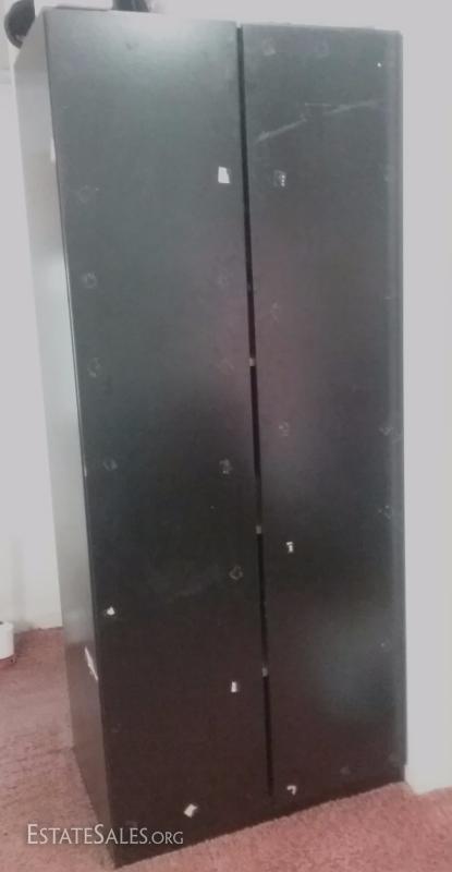 Solid wood. 32" wide, 22 1/2" deep, 6 1/2 feet tall. Adjustable shelves. Glue spots on front from removing broken mirrors. SPECIAL ARRANGEMENTS REQUIRED FOR PICKUP. UNIT IS HEAVY. LOADING ASSISTANCE IS NOT AVAILABLE.