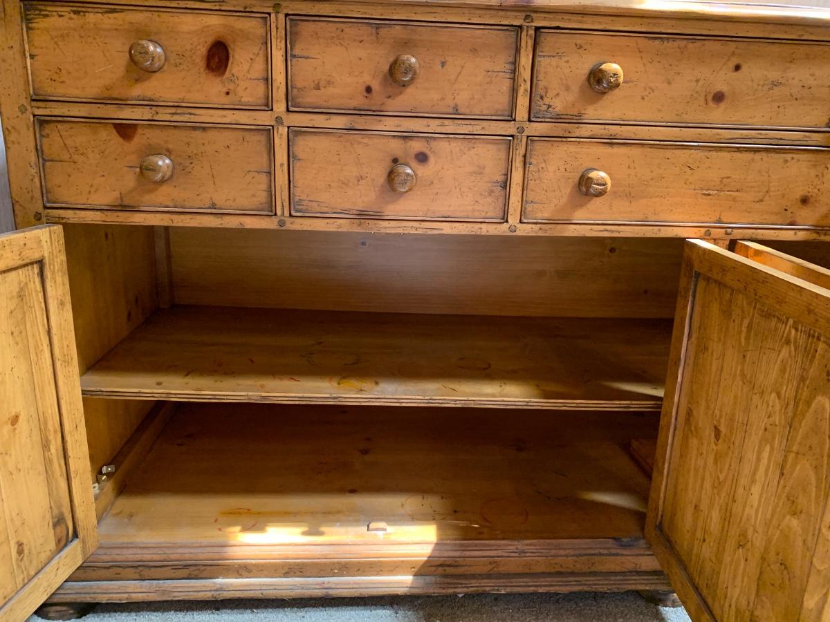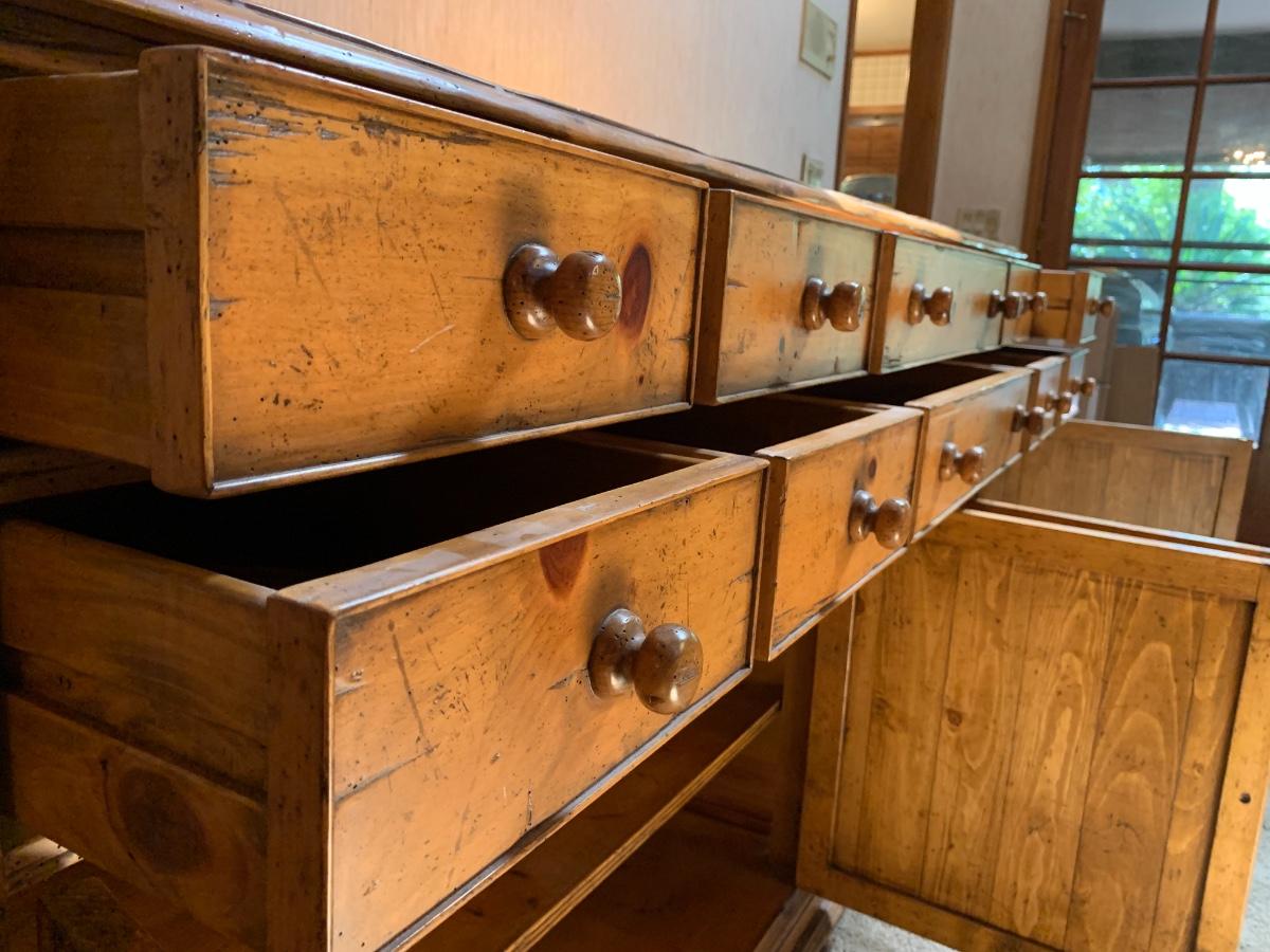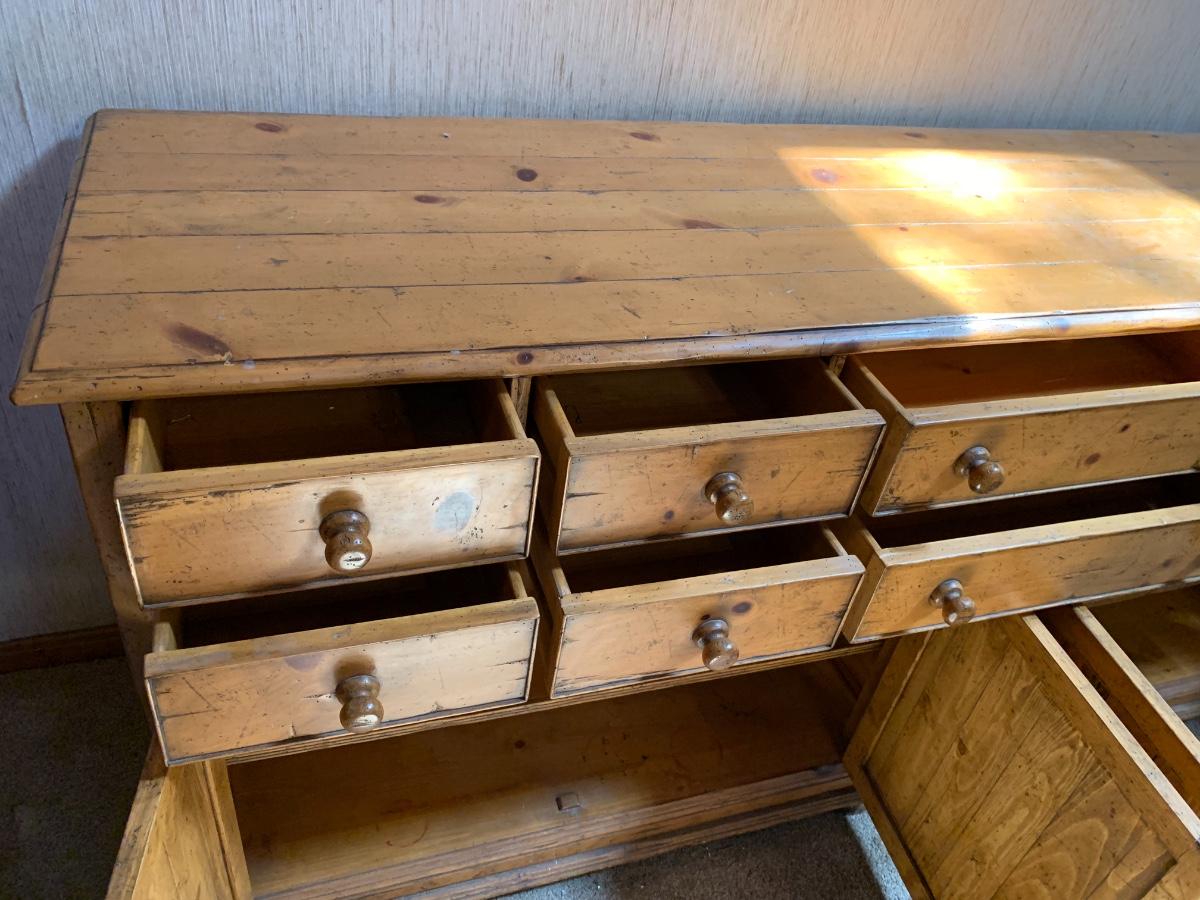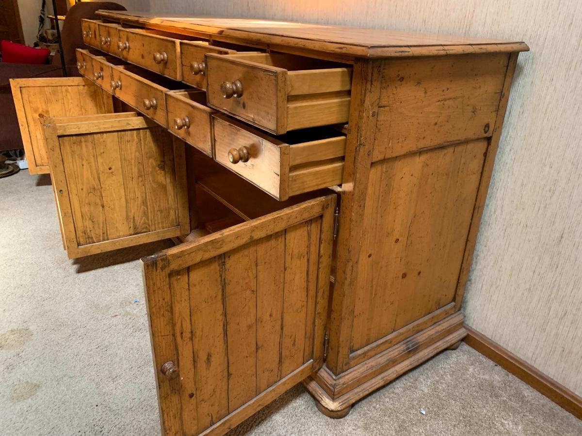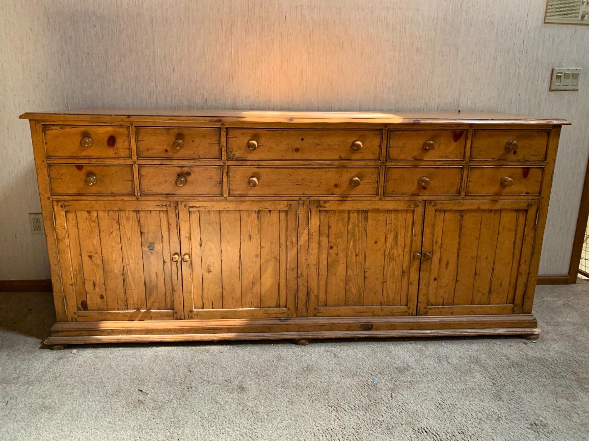 7’ long, 3’ 3” tall, 1’ 11” deep - distressed pine wood buffet. 10 drawers and 4 cabinets. Some staining on the inside of one cabinet. Appears to be from candle wax which may be removable.