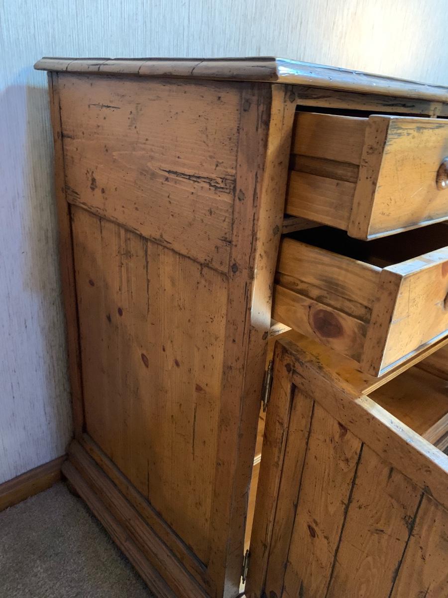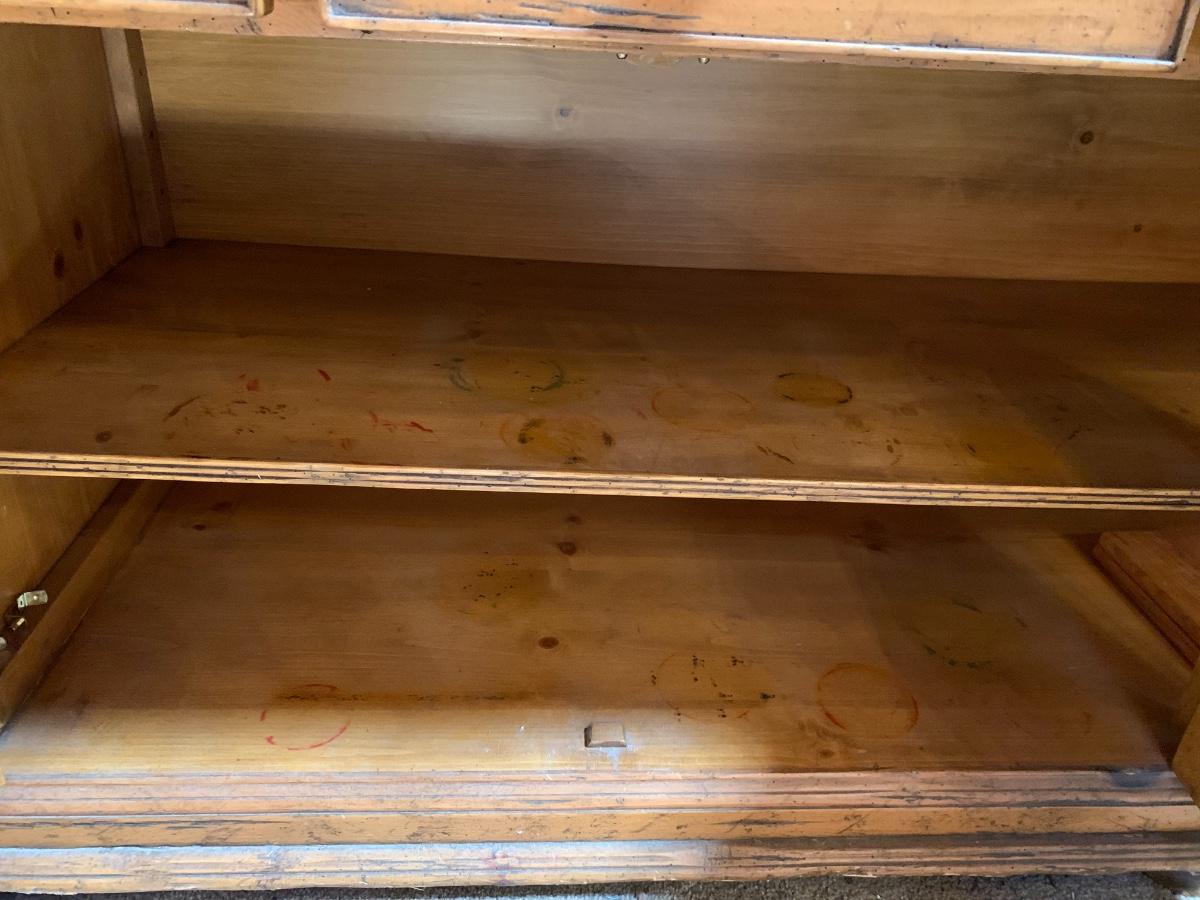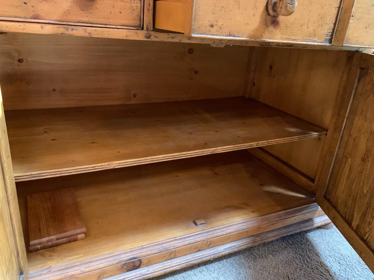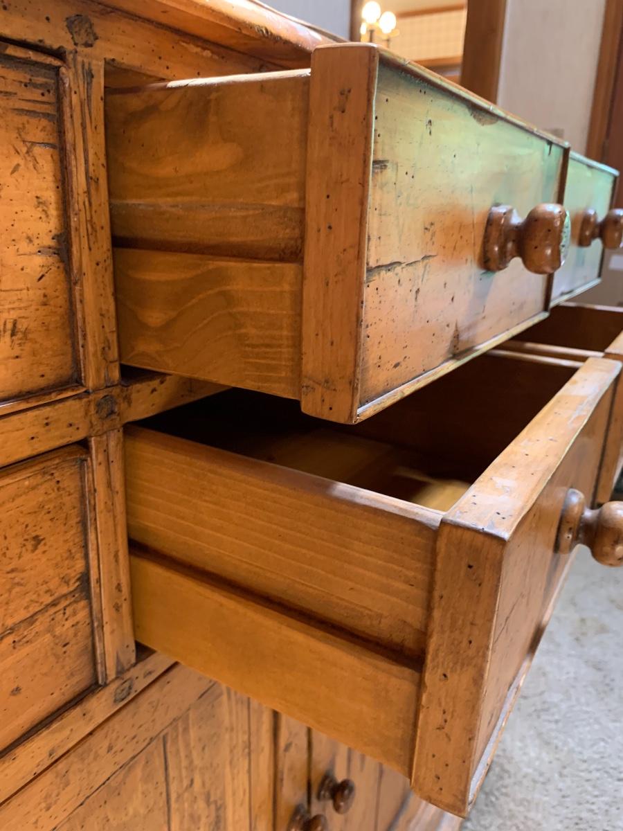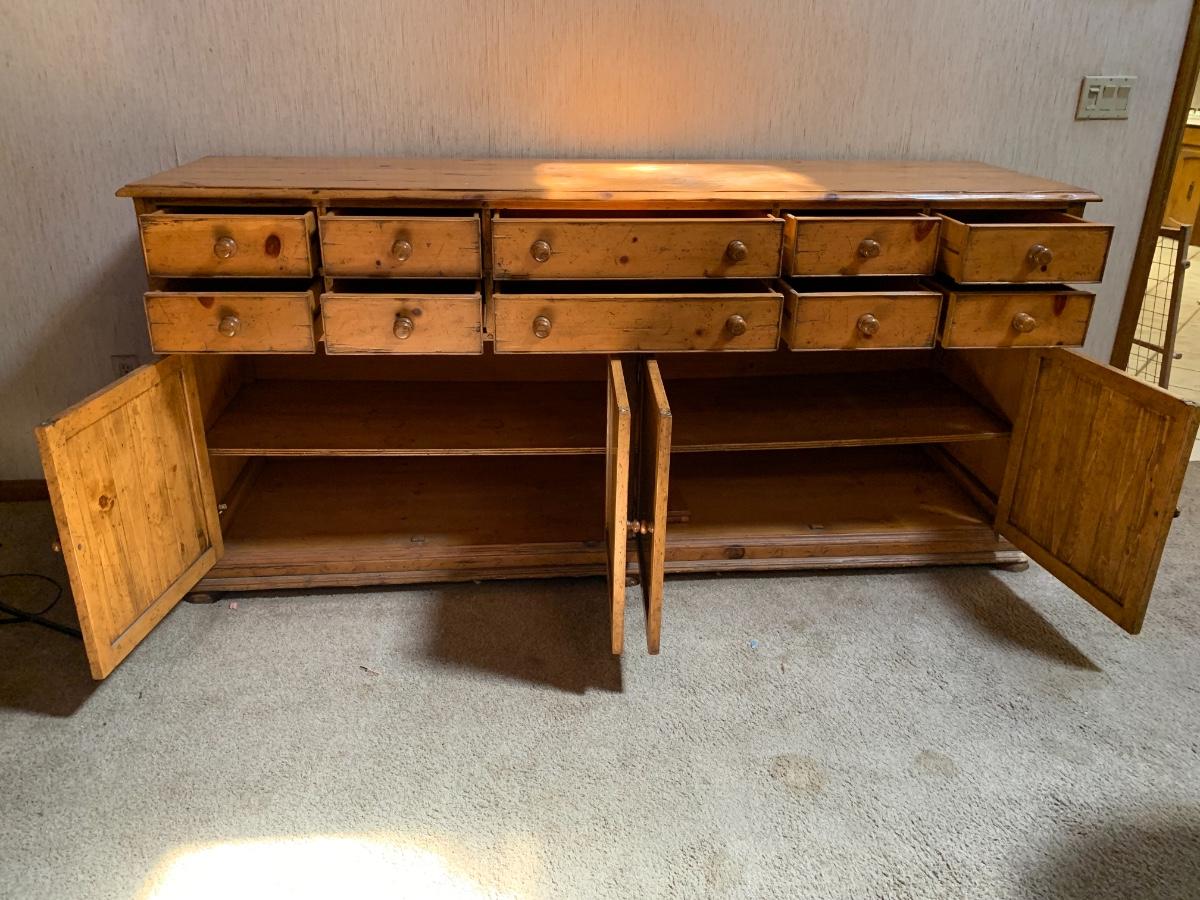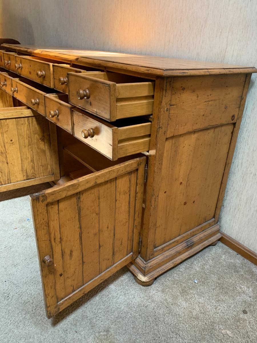 7’ long, 3’ 3” tall, 1’ 11” deep - distressed pine wood buffet. 10 drawers and 4 cabinets. Some staining on the inside of one cabinet. Appears to be from candle wax which may be removable.