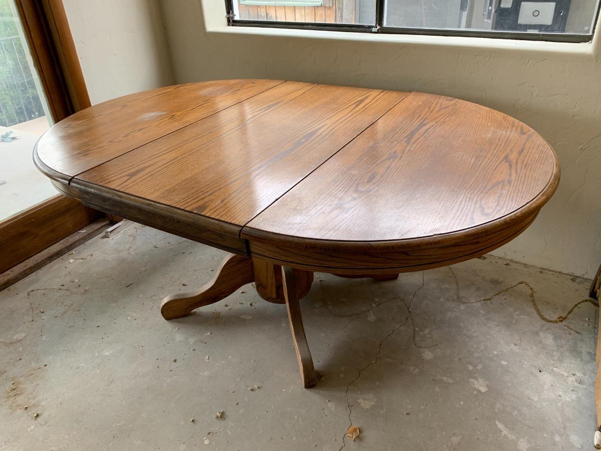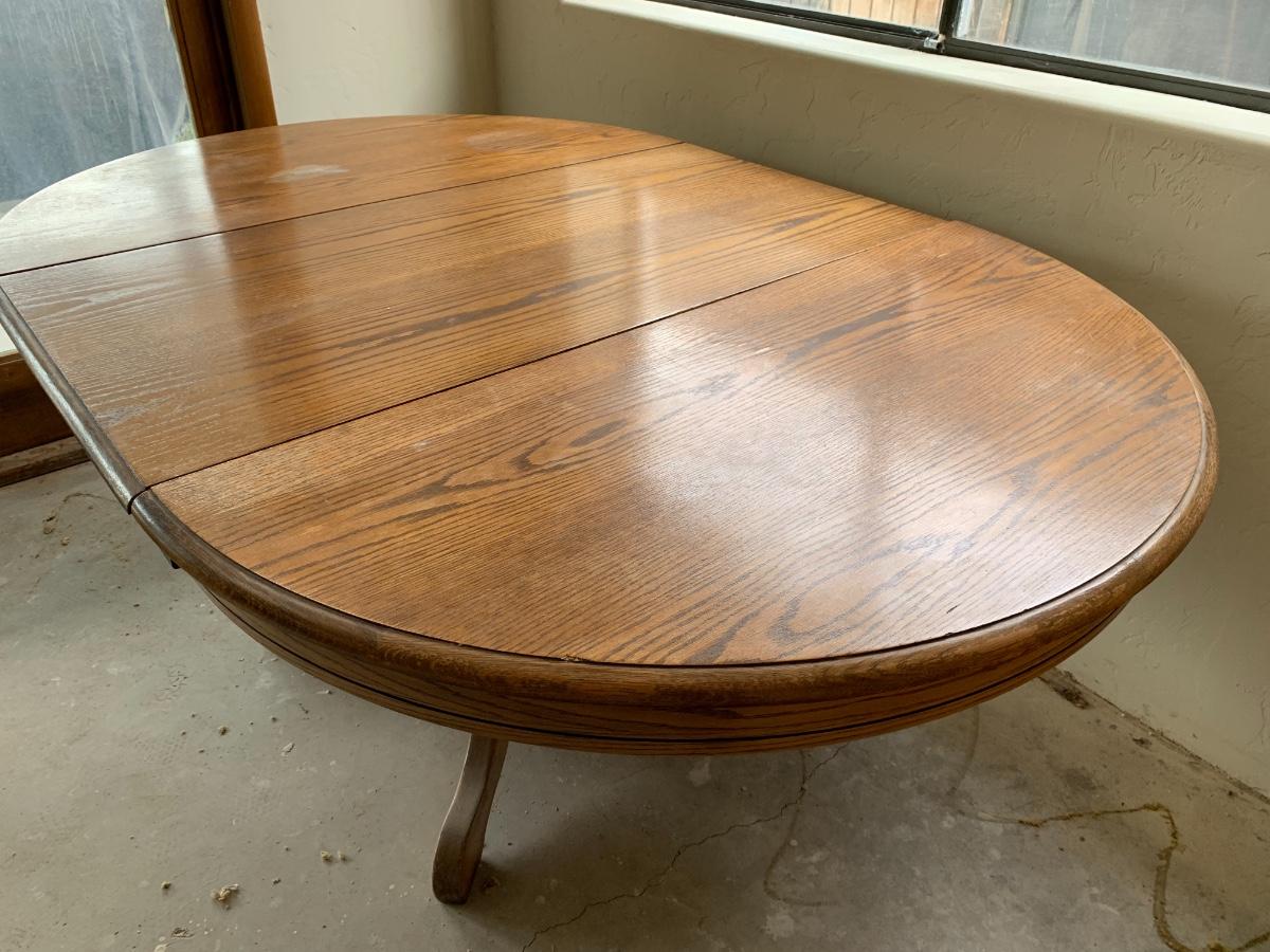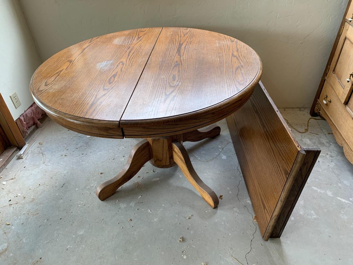 Large wooden kitchen table in fair condition, does not close (gaps in between leafs and table) entirely with some obvious wear to the top *no chairs included* (with leaf 6 feet in length, w/o leaf diameter is 4 feet, width- 47 inches, height- 30 inches)