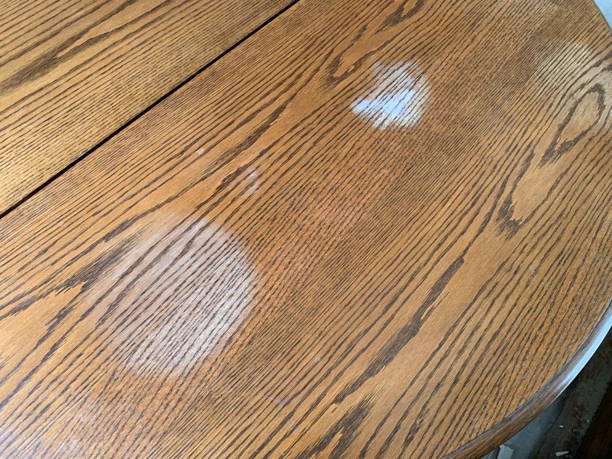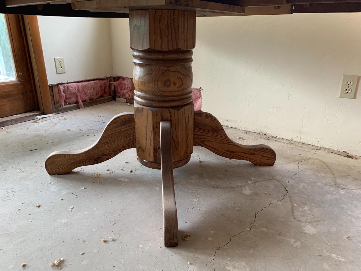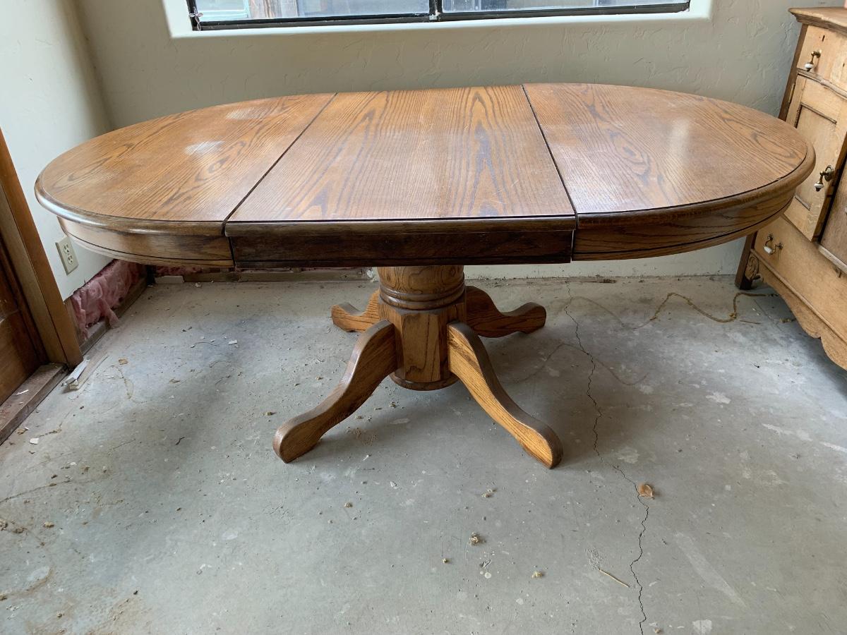 Large wooden kitchen table in fair condition, does not close (gaps in between leafs and table) entirely with some obvious wear to the top *no chairs included* (with leaf 6 feet in length, w/o leaf diameter is 4 feet, width- 47 inches, height- 30 inches)