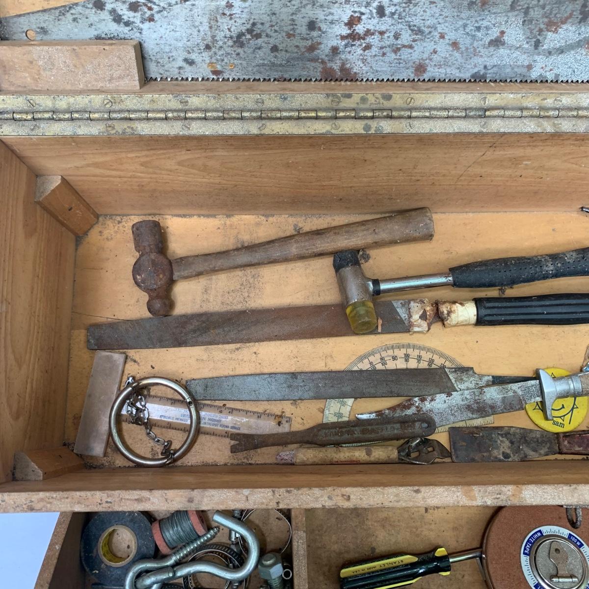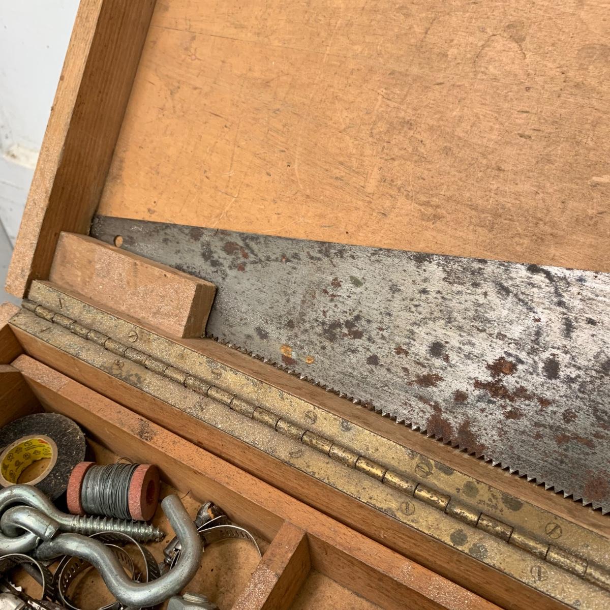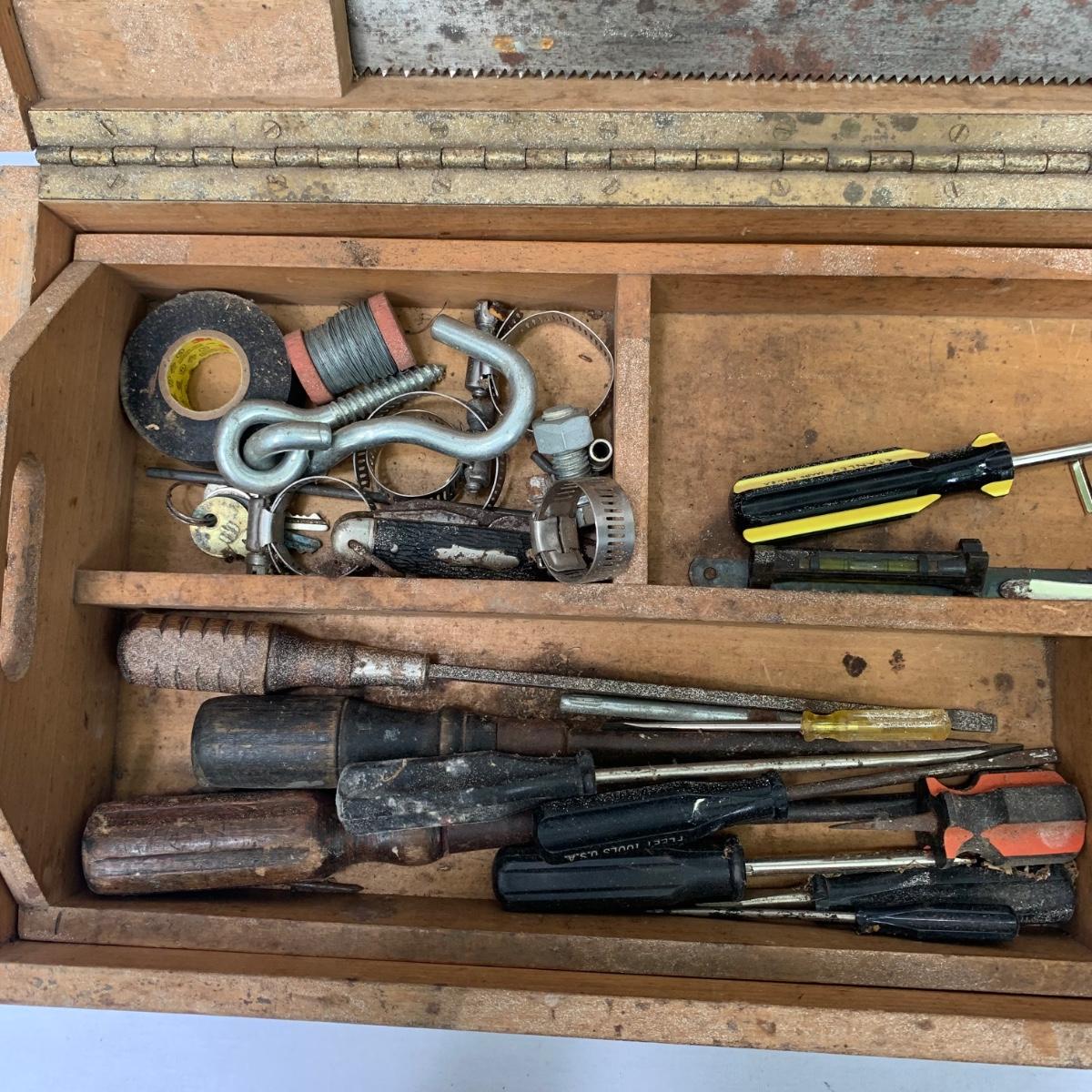 This large wood toolbox measures 30.5” x 10” x 8.5”. It has a metal handle and latch that is a bit rusty, but functional. All the contents in the toolbox are part of this lot, including a saw, screwdrivers, wrenches, a vintage tape measure, files, hammers, and more. The tray removes to reveal another compartment in the bottom of the toolbox. Local pickup only.