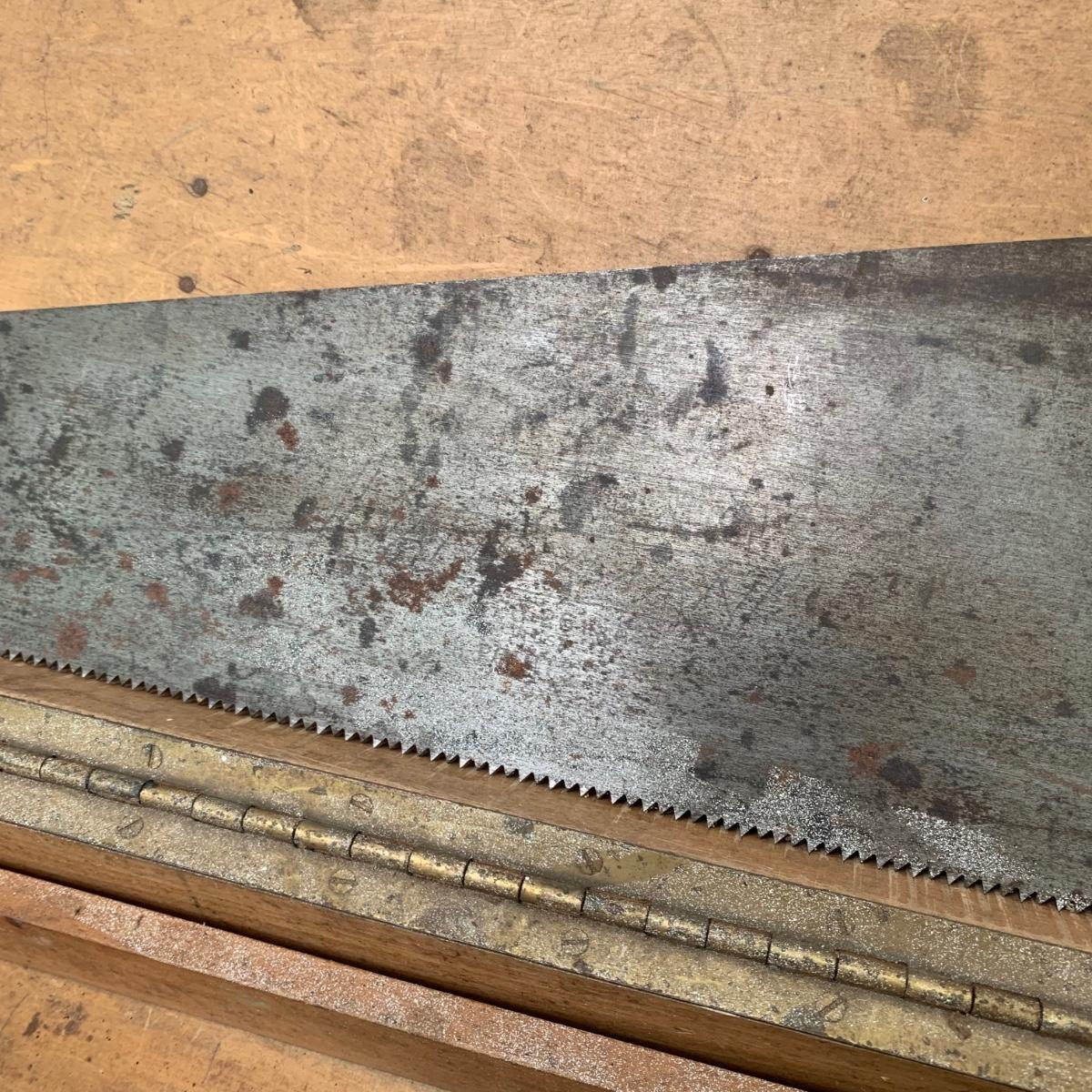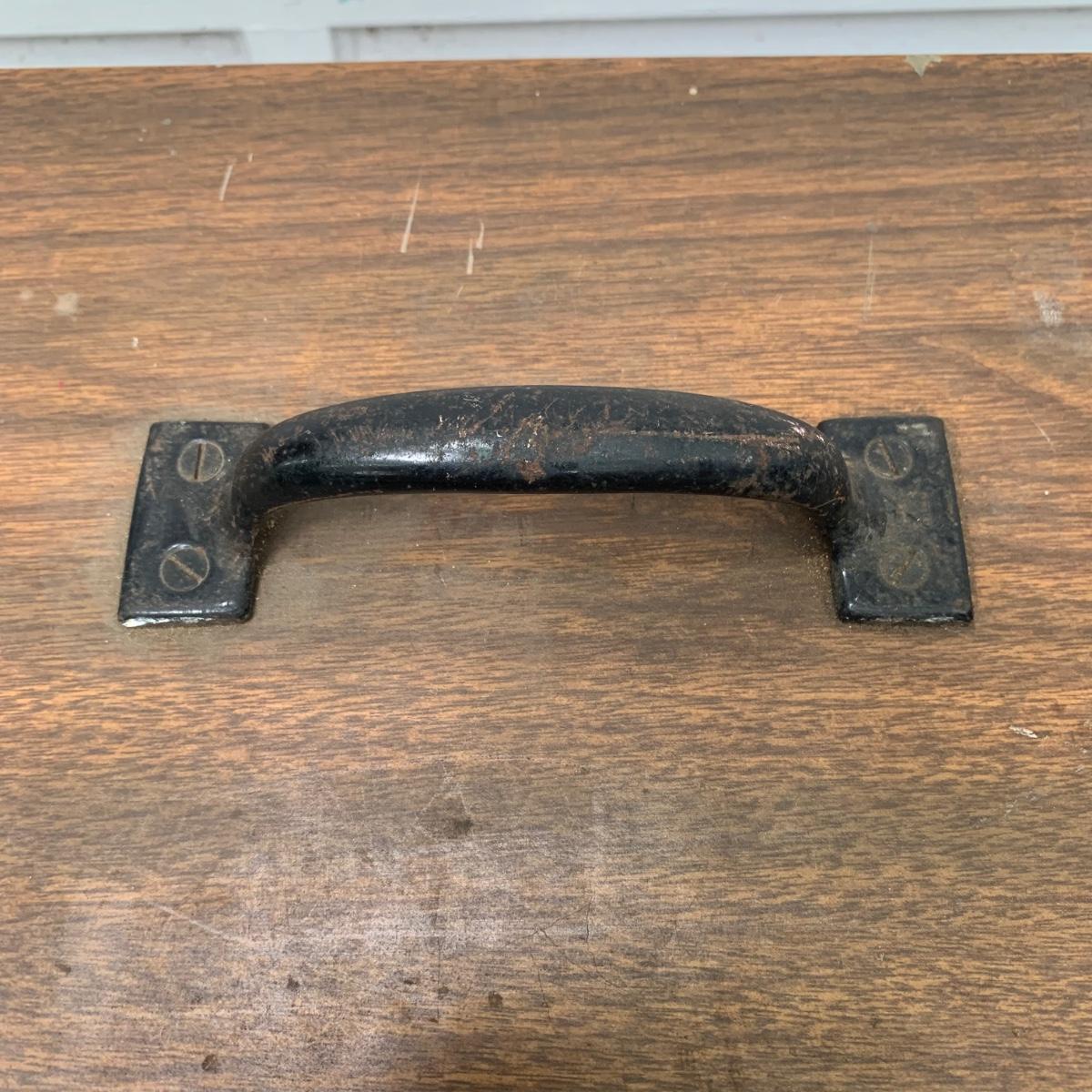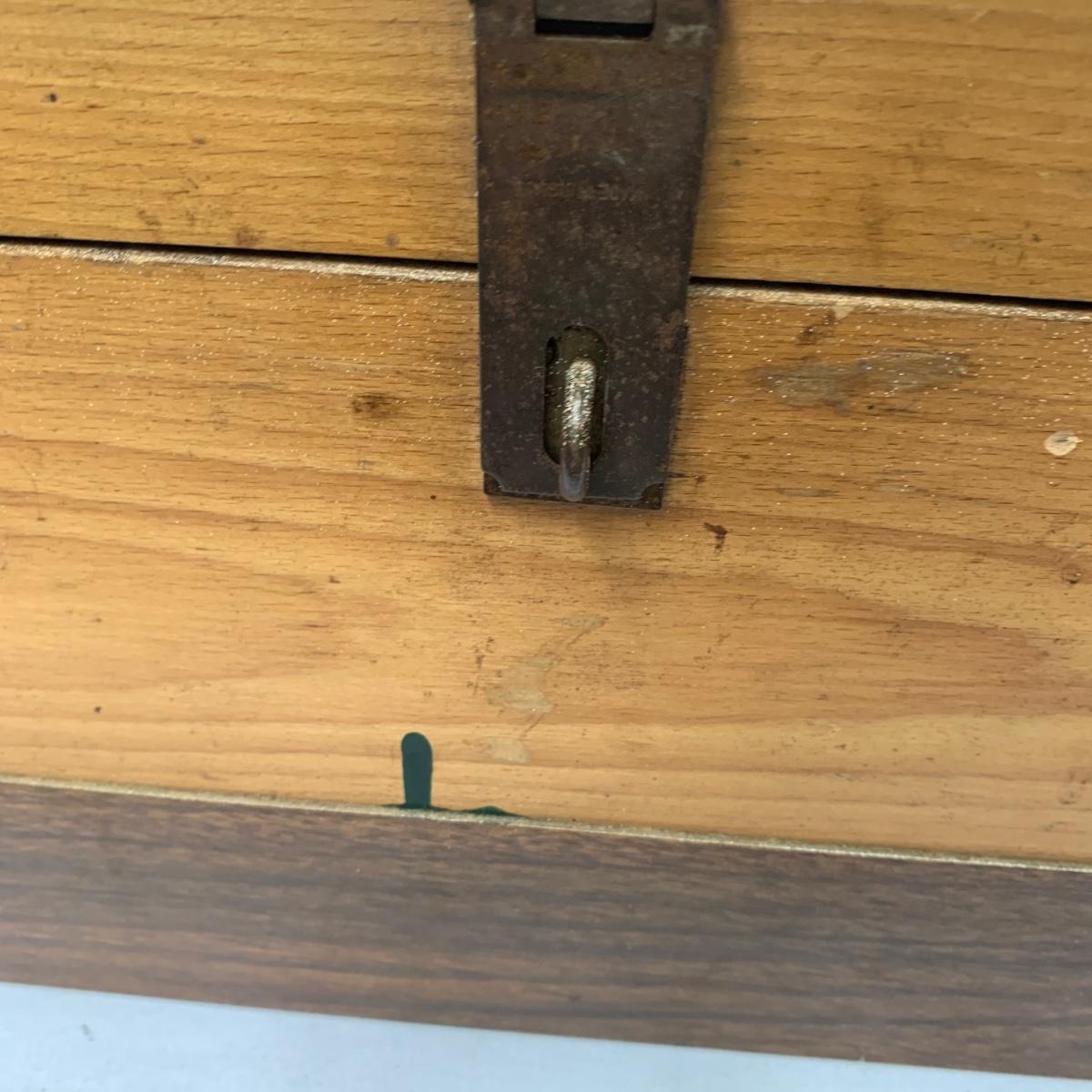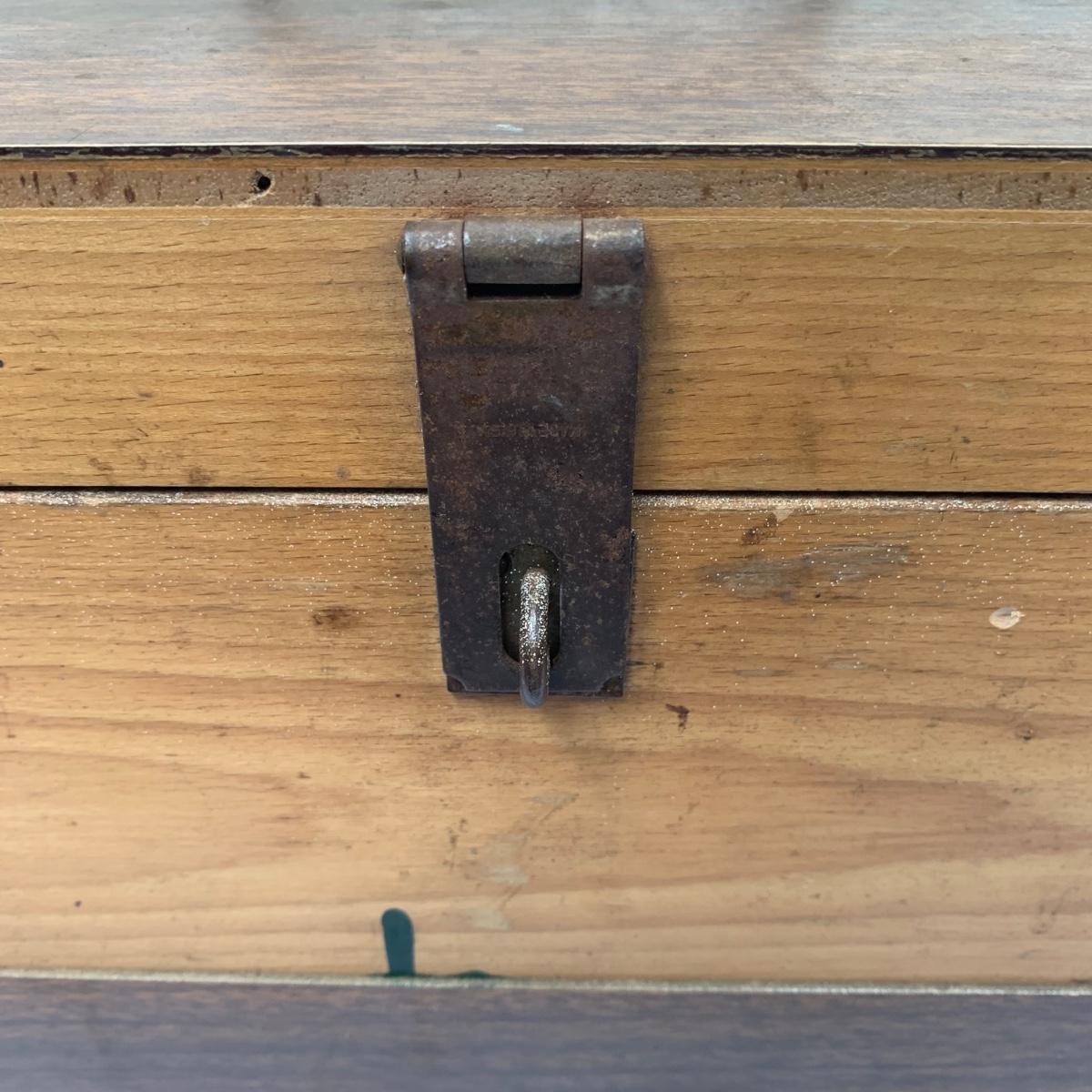 This large wood toolbox measures 30.5” x 10” x 8.5”. It has a metal handle and latch that is a bit rusty, but functional. All the contents in the toolbox are part of this lot, including a saw, screwdrivers, wrenches, a vintage tape measure, files, hammers, and more. The tray removes to reveal another compartment in the bottom of the toolbox. Local pickup only.