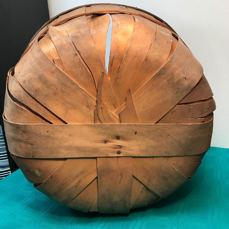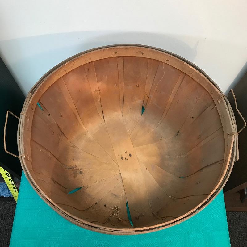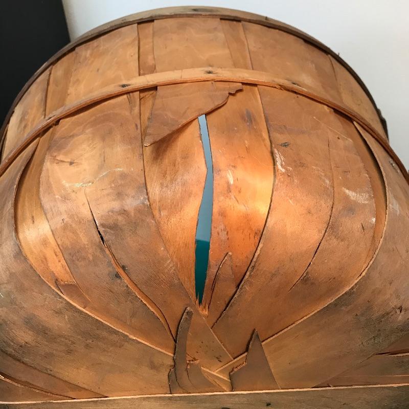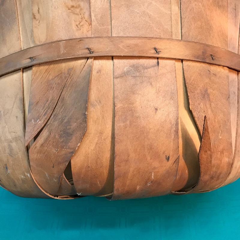 Basket has a couple of damaged spots where the slats are broken; see pictures. Opening of the basket measures approximately 17 1/8“ in diameter, and stands approximately 11 7/8“ tall.