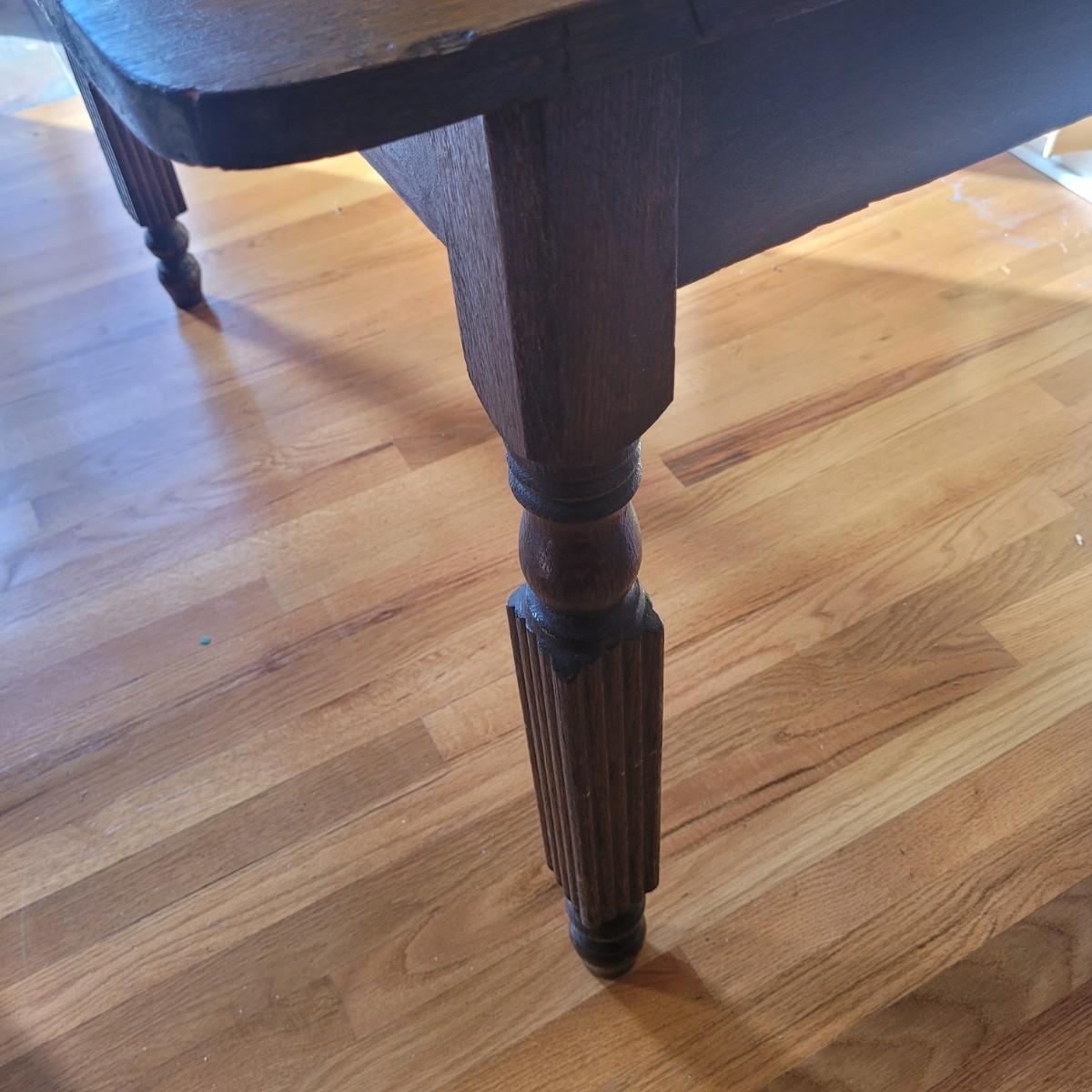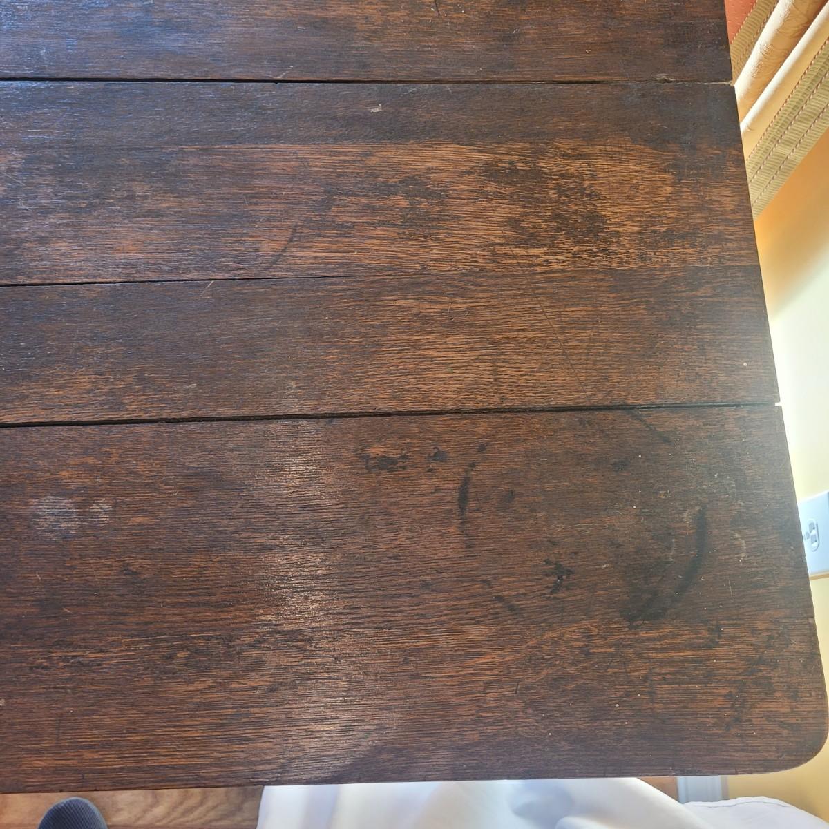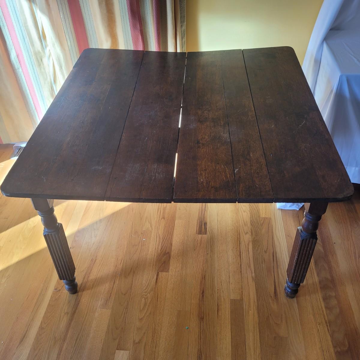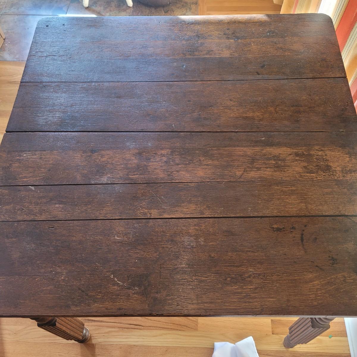 Large solid wood dining table. Appears to be oak. Has some spots and wear on the top surface. Some legs have scratches and scuffs. Measurements are 41" x 42" x 29"H.