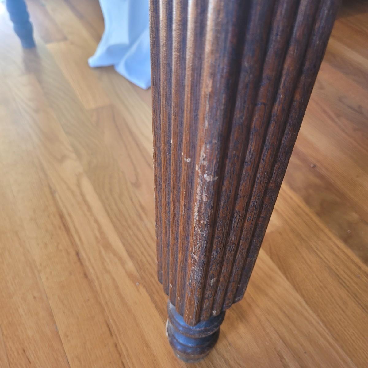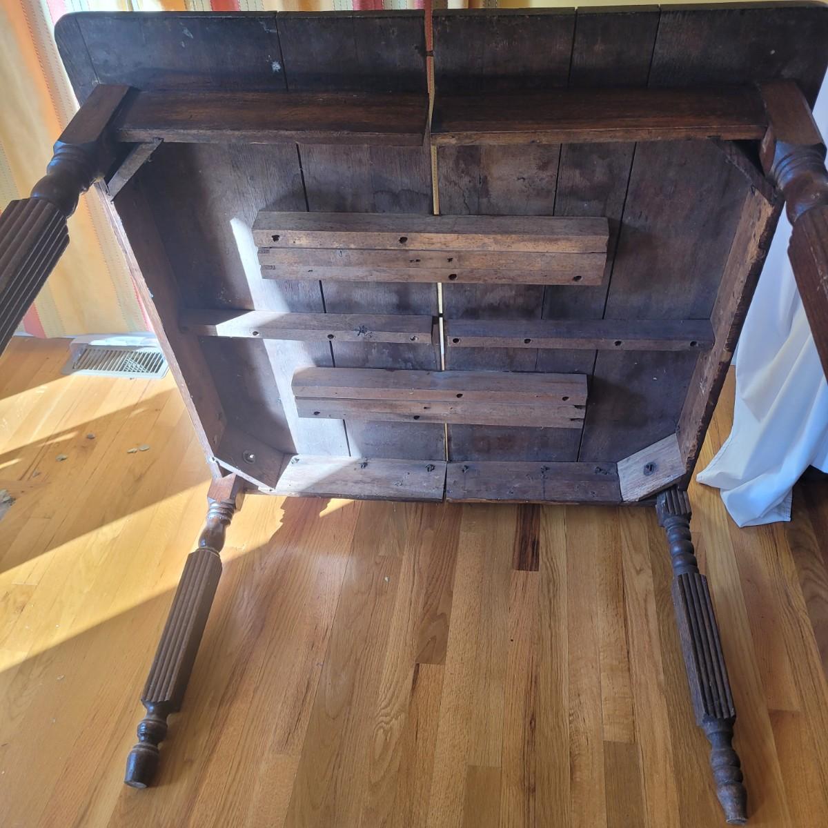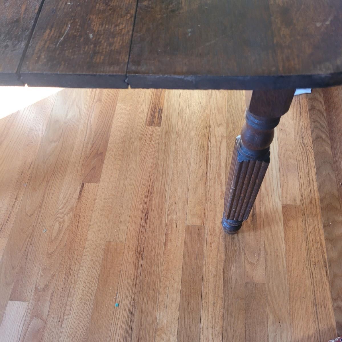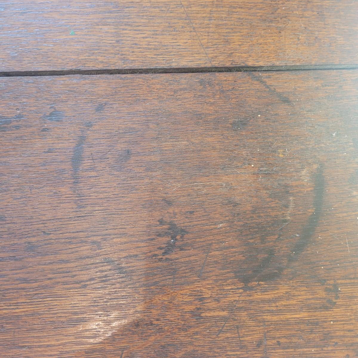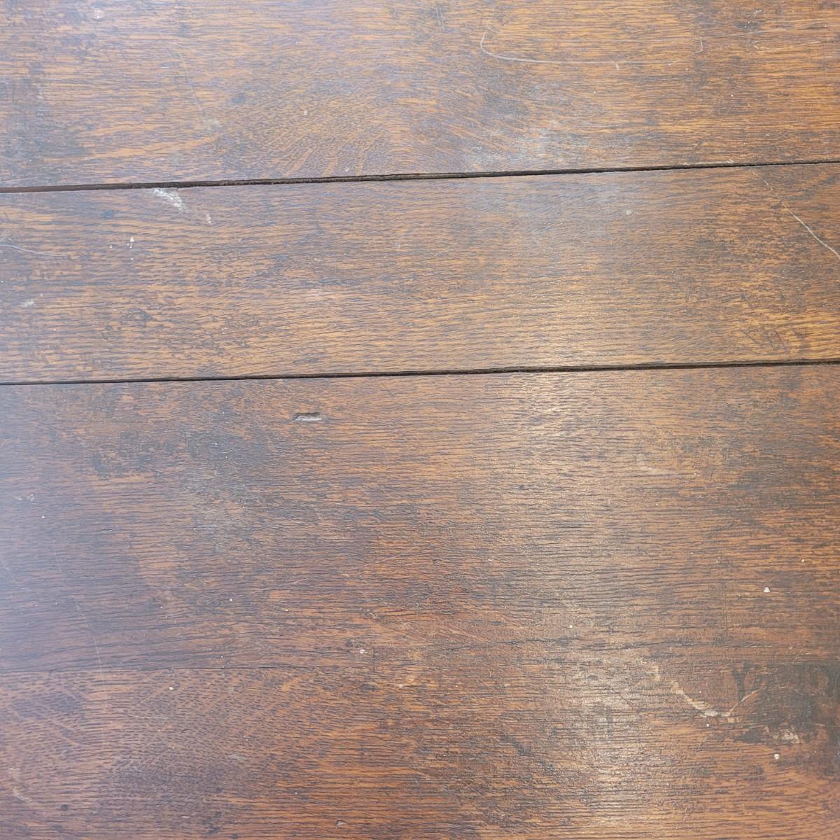 Large solid wood dining table. Appears to be oak. Has some spots and wear on the top surface. Some legs have scratches and scuffs. Measurements are 41" x 42" x 29"H.