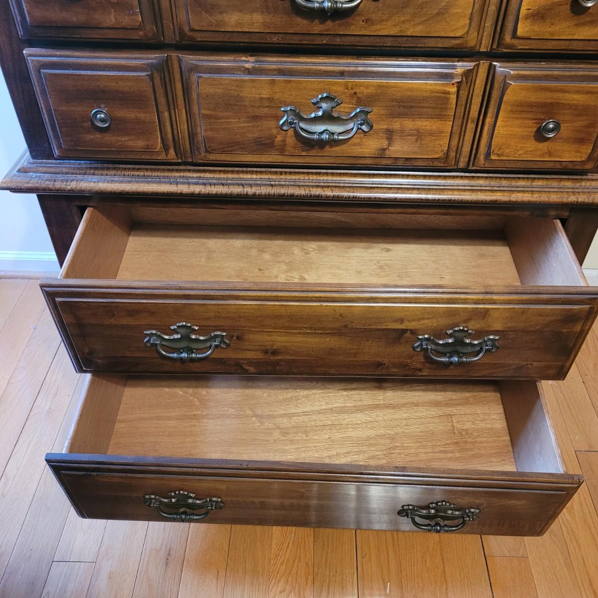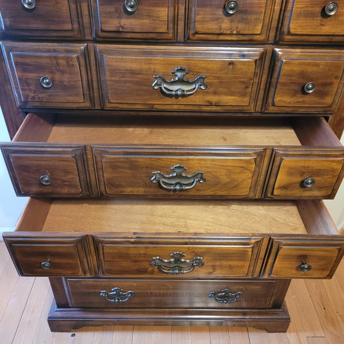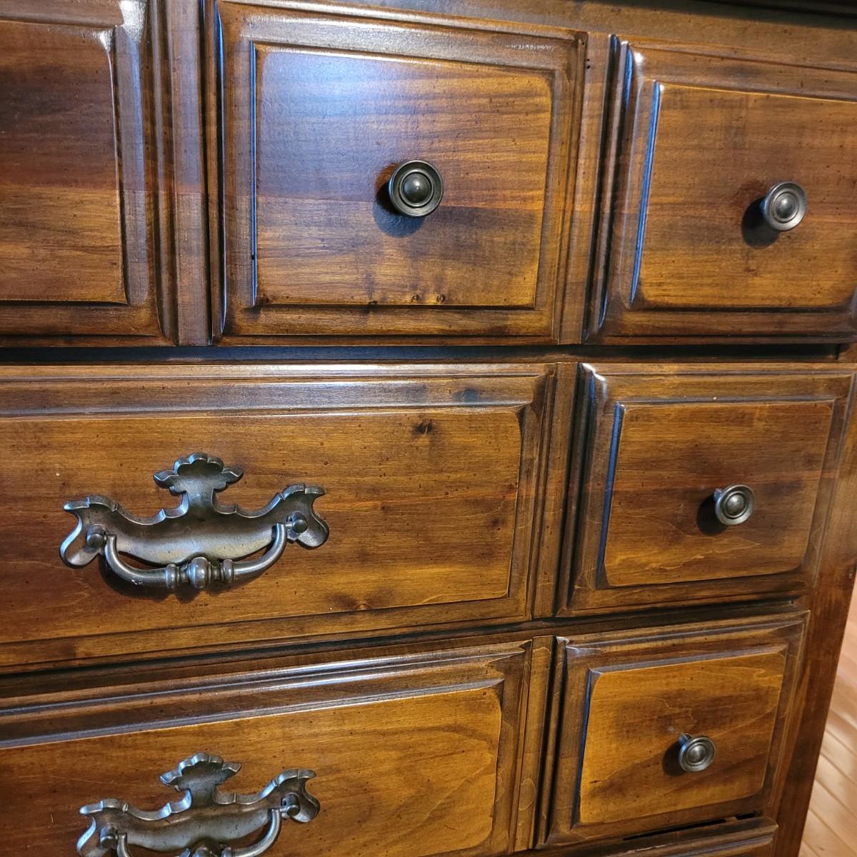 This matching furniture set includes a large six drawer dresser and a pair of three drawer nightstands. Dresser measures approximately 40” x 21” x 57.5”H and nightsands 25” x 16” 25.5”H. Local pickup only. Winning bidder must bring assistance to help move and load this item due to its weight and size.