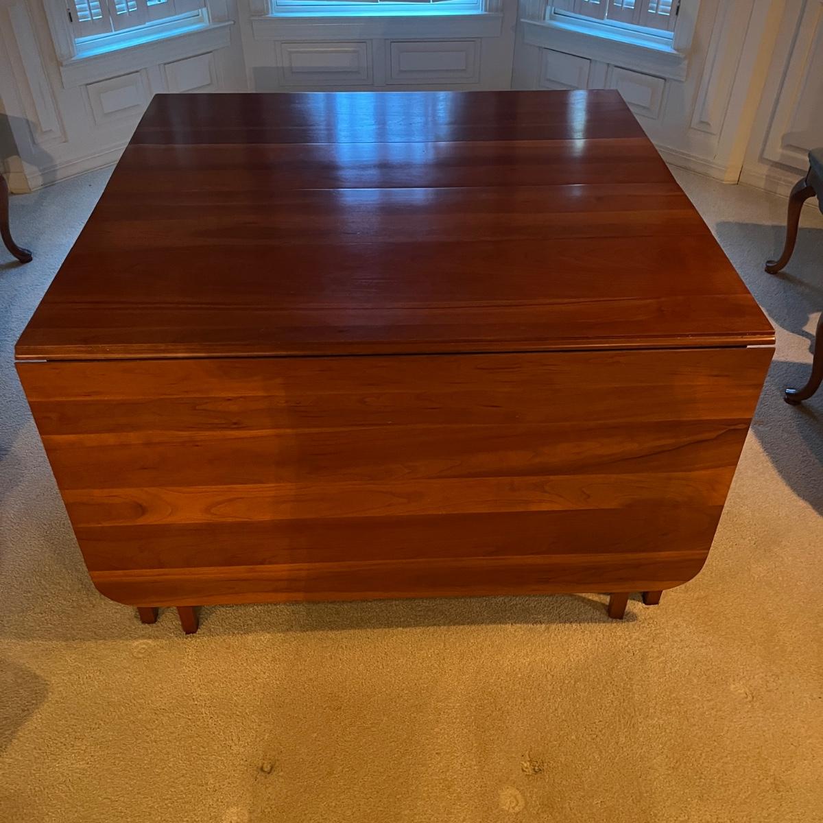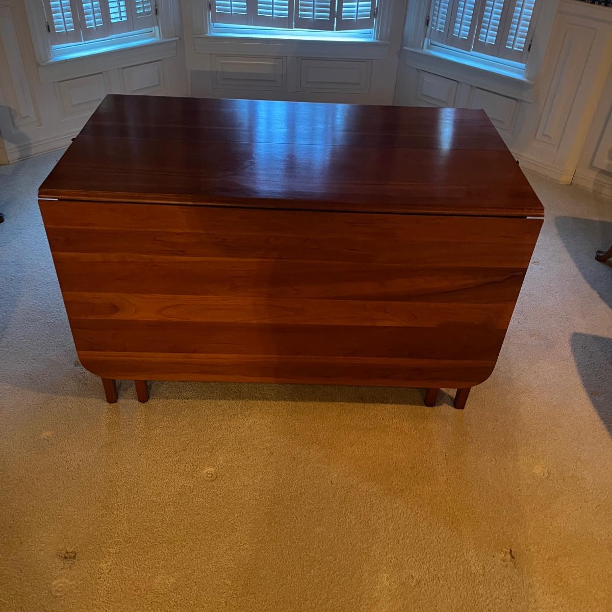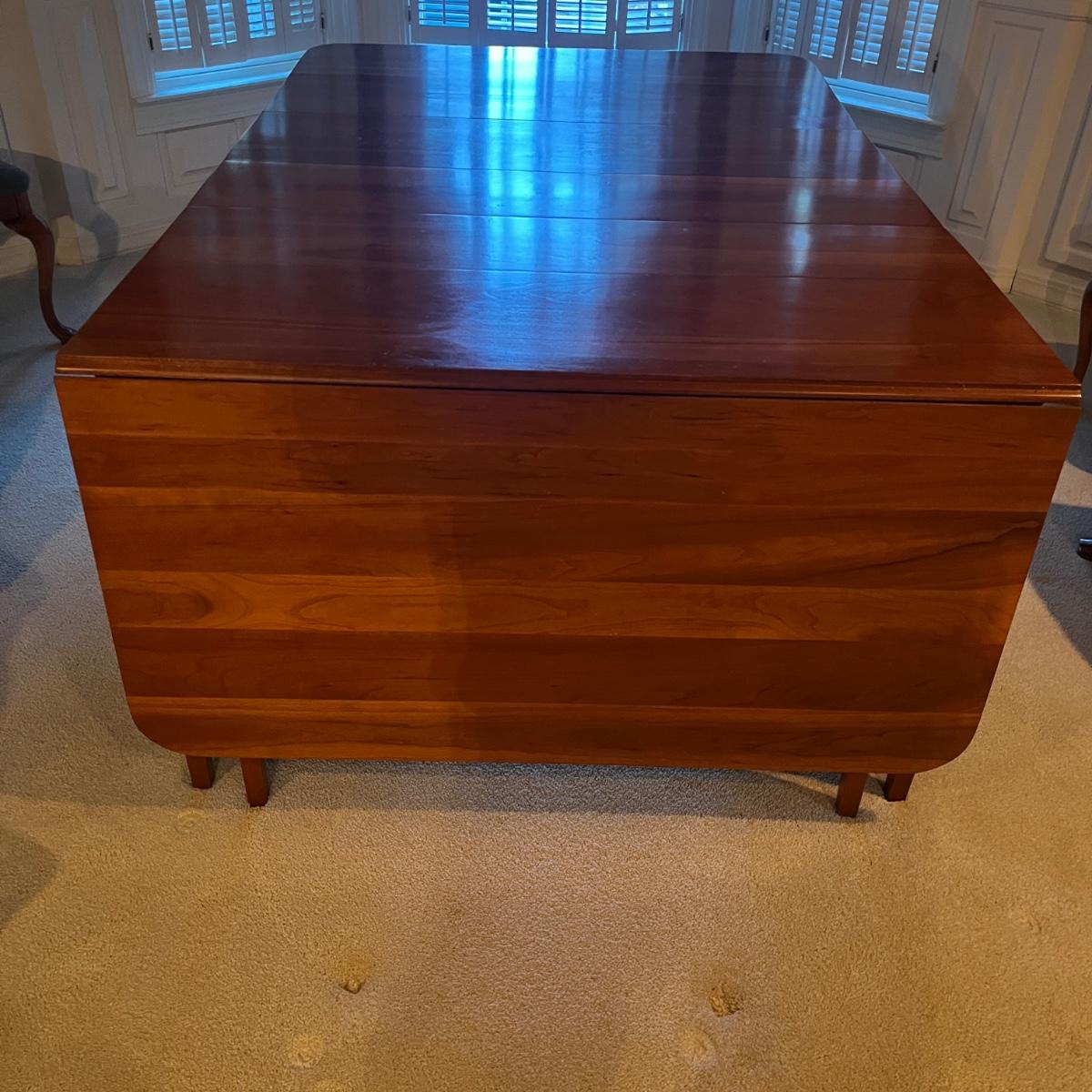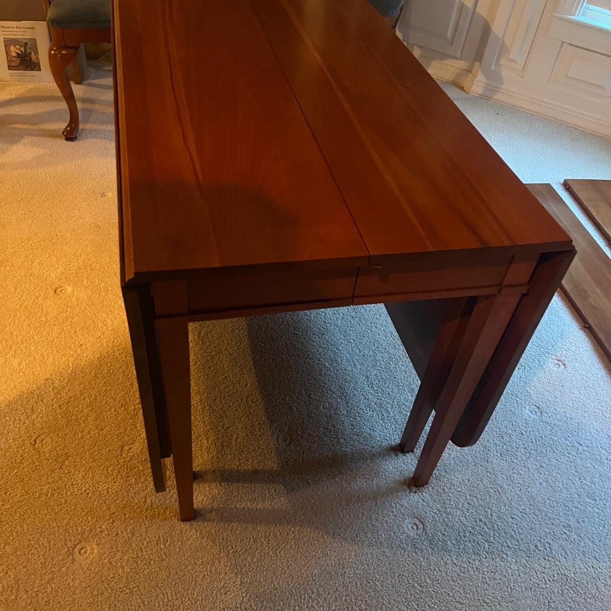 Lot includes a large drop leaf dining table with two extra traditional leaves. Table measures 89” x 46” x 28.5”H with outside leaves inserted and side leaves raised and then 26” x 46” x 28.5” with leaves out and dropped.