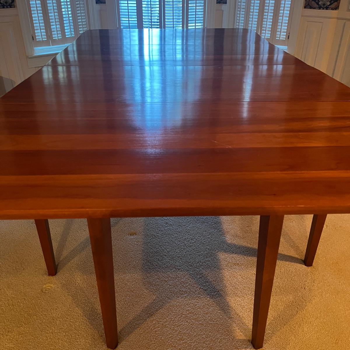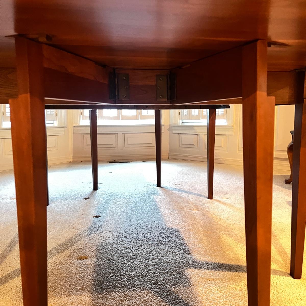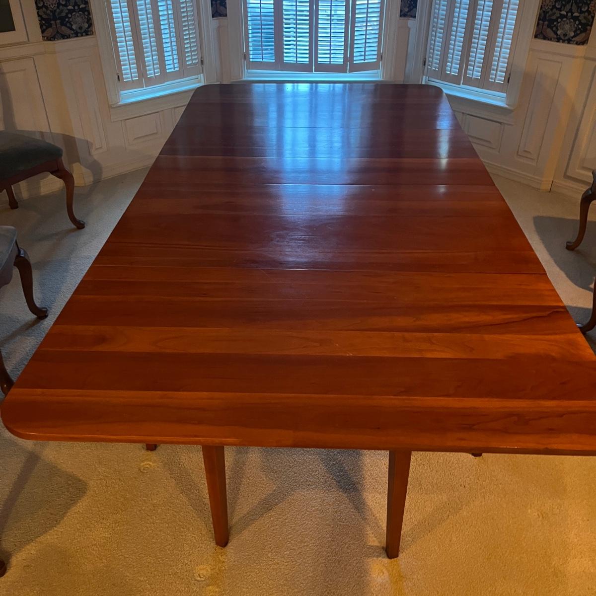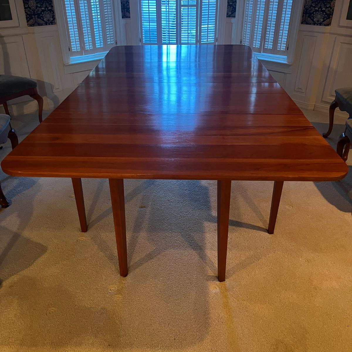 Lot includes a large drop leaf dining table with two extra traditional leaves. Table measures 89” x 46” x 28.5”H with outside leaves inserted and side leaves raised and then 26” x 46” x 28.5” with leaves out and dropped.