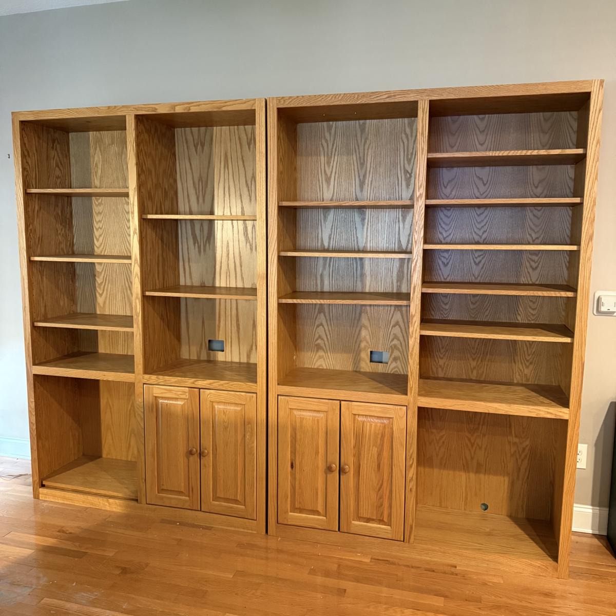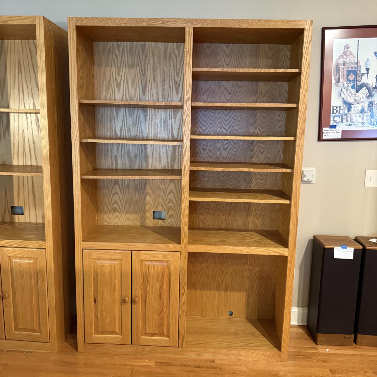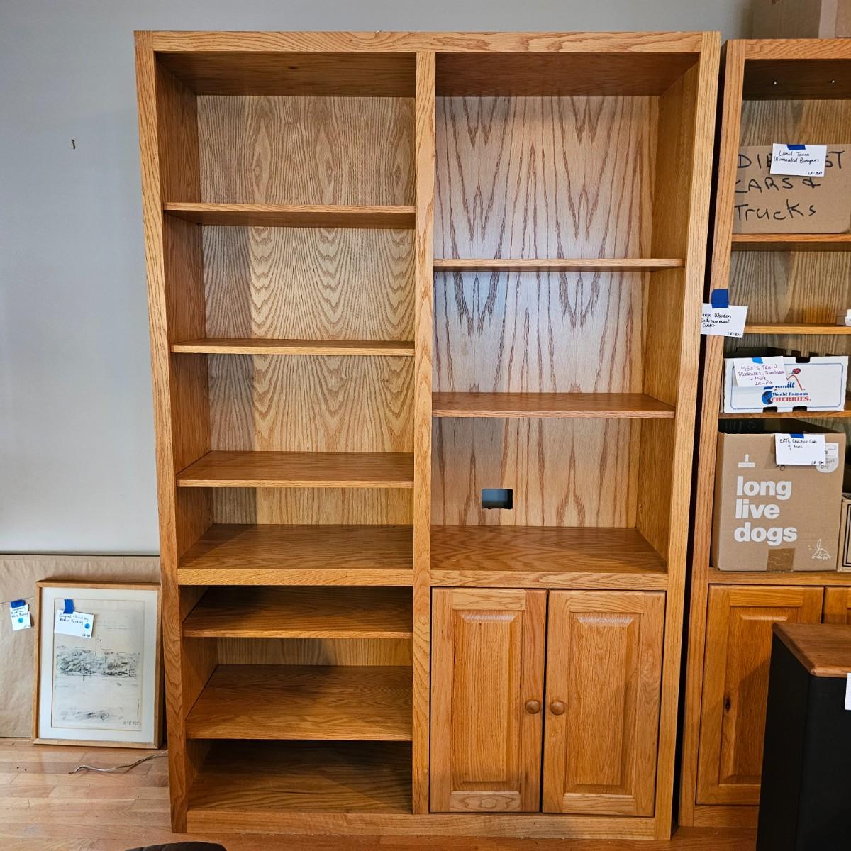 This lot contains two large shelf/cabinet units perfect for media, storage and displays. Each piece has a column of shelves and a column with shelves on top and a cabinet on the bottom. The shelves are adjustable; units are one piece each. Each piece individually measures 54” x 16.75” x 82”H. Local pickup only. Winning bidder must bring assistance to help move and load this item due to its weight and/or size. This lot is located on the main level of the house and will need to be moved down a few stairs at the entry of the house.