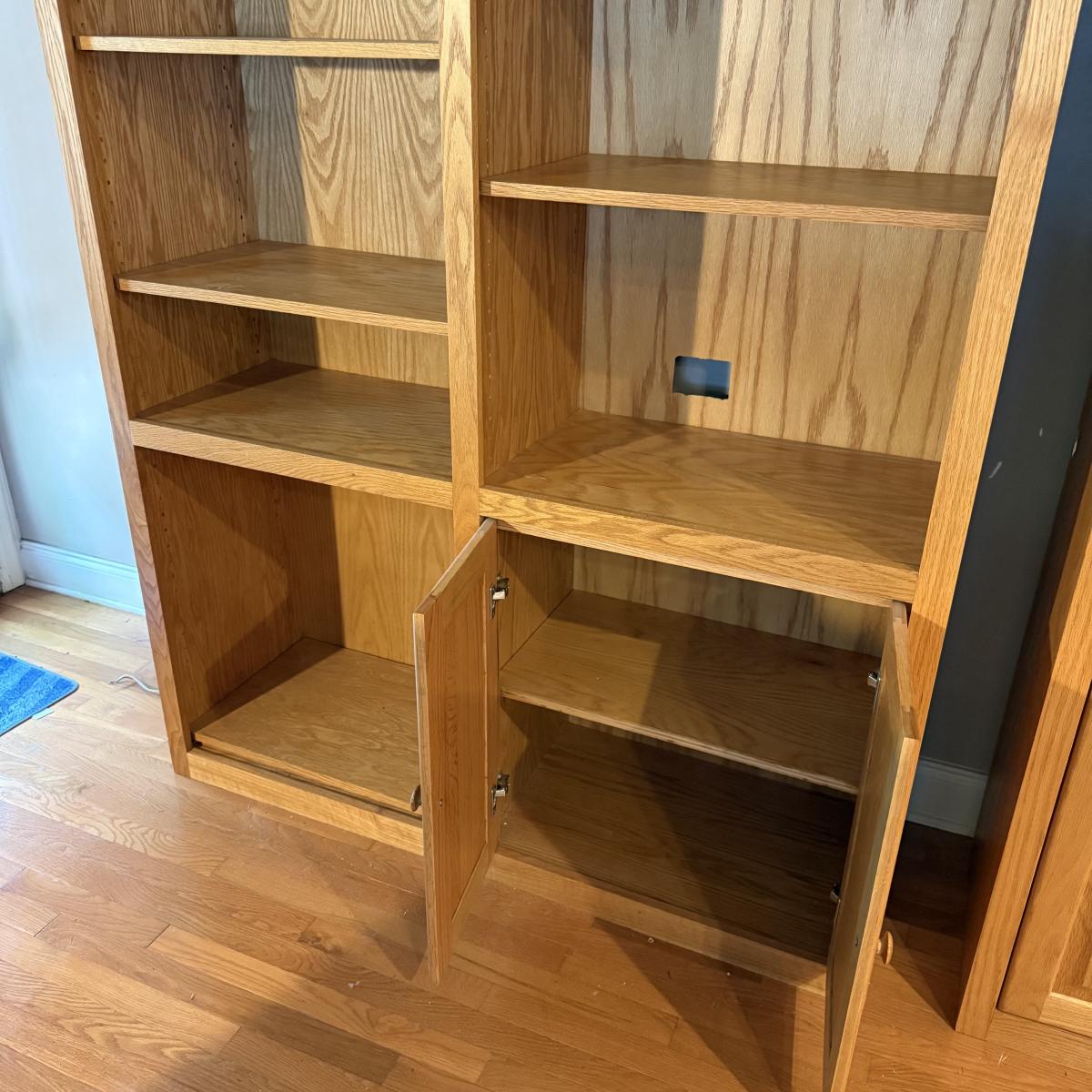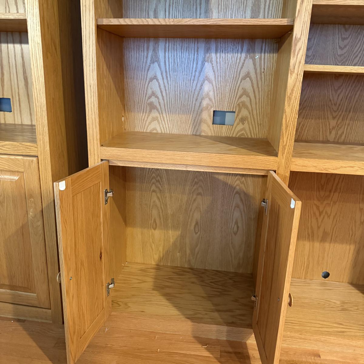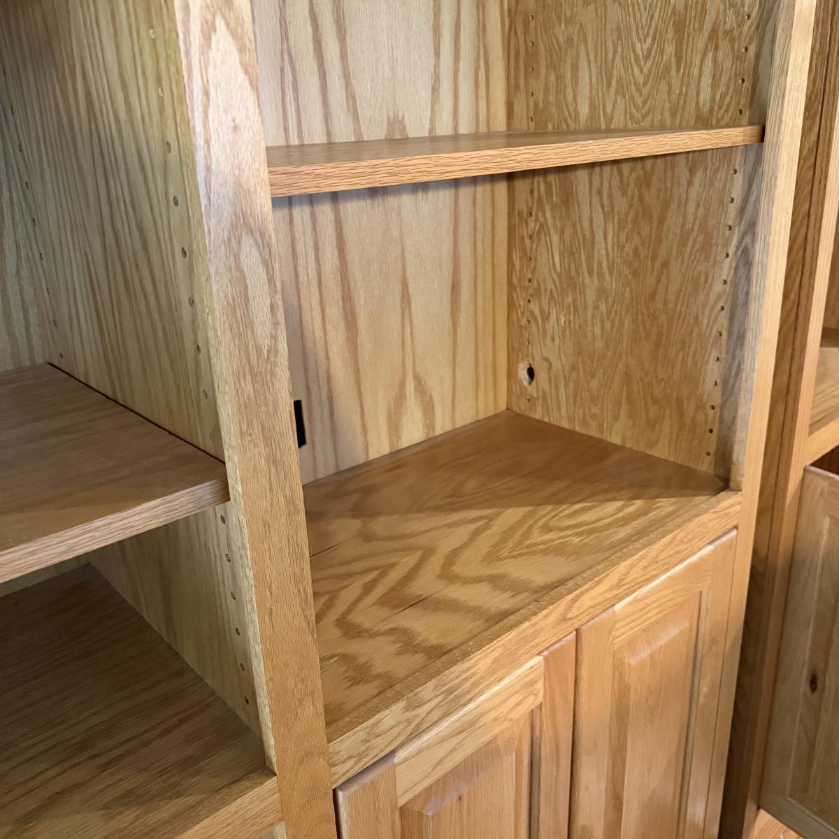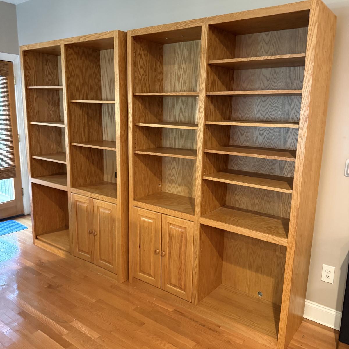 This lot contains two large shelf/cabinet units perfect for media, storage and displays. Each piece has a column of shelves and a column with shelves on top and a cabinet on the bottom. The shelves are adjustable; units are one piece each. Each piece individually measures 54” x 16.75” x 82”H. Local pickup only. Winning bidder must bring assistance to help move and load this item due to its weight and/or size. This lot is located on the main level of the house and will need to be moved down a few stairs at the entry of the house.