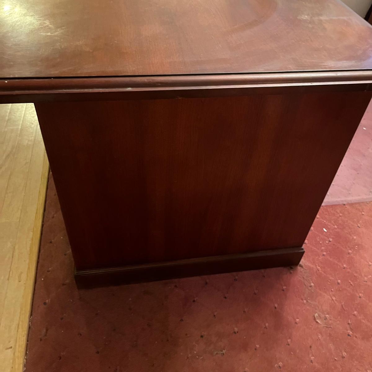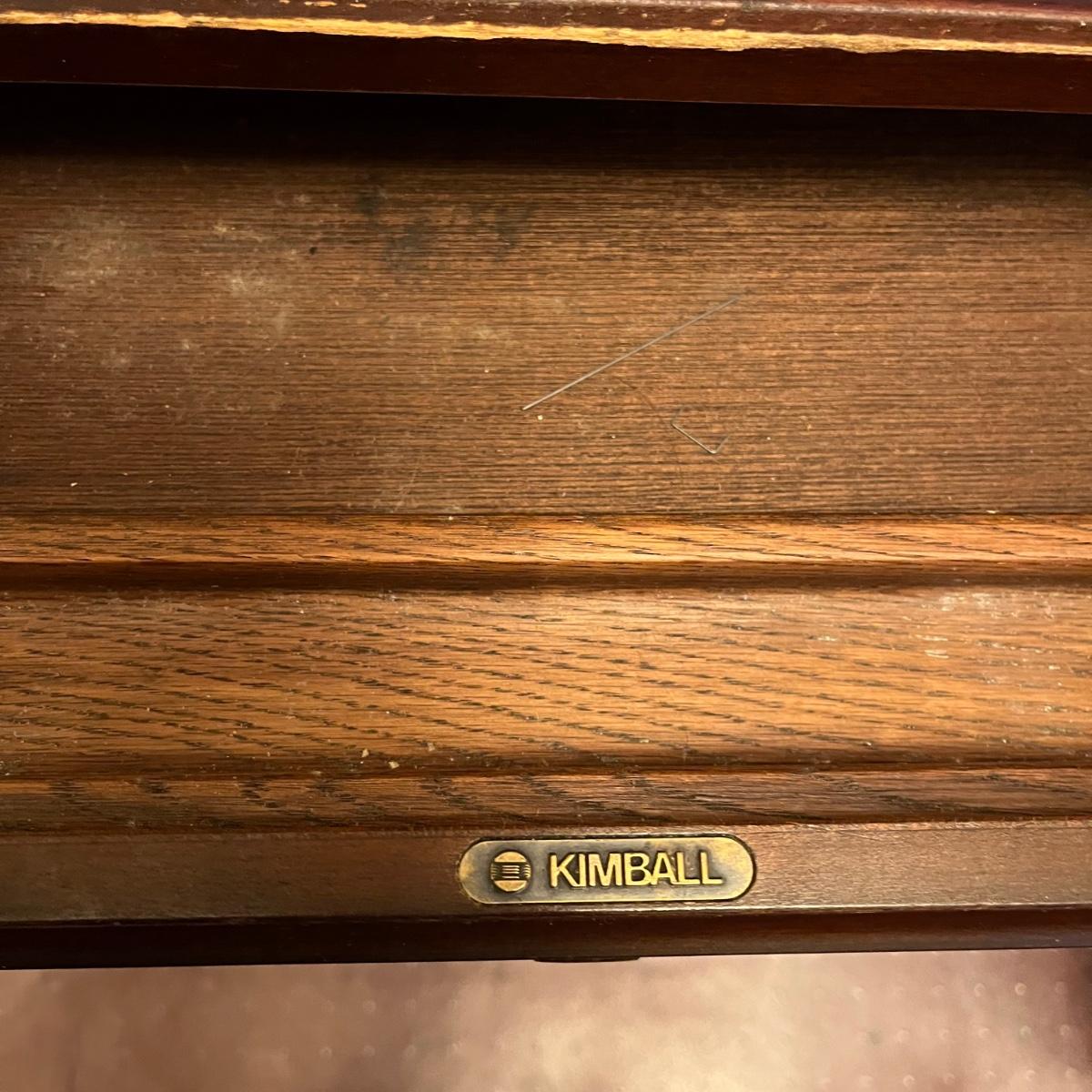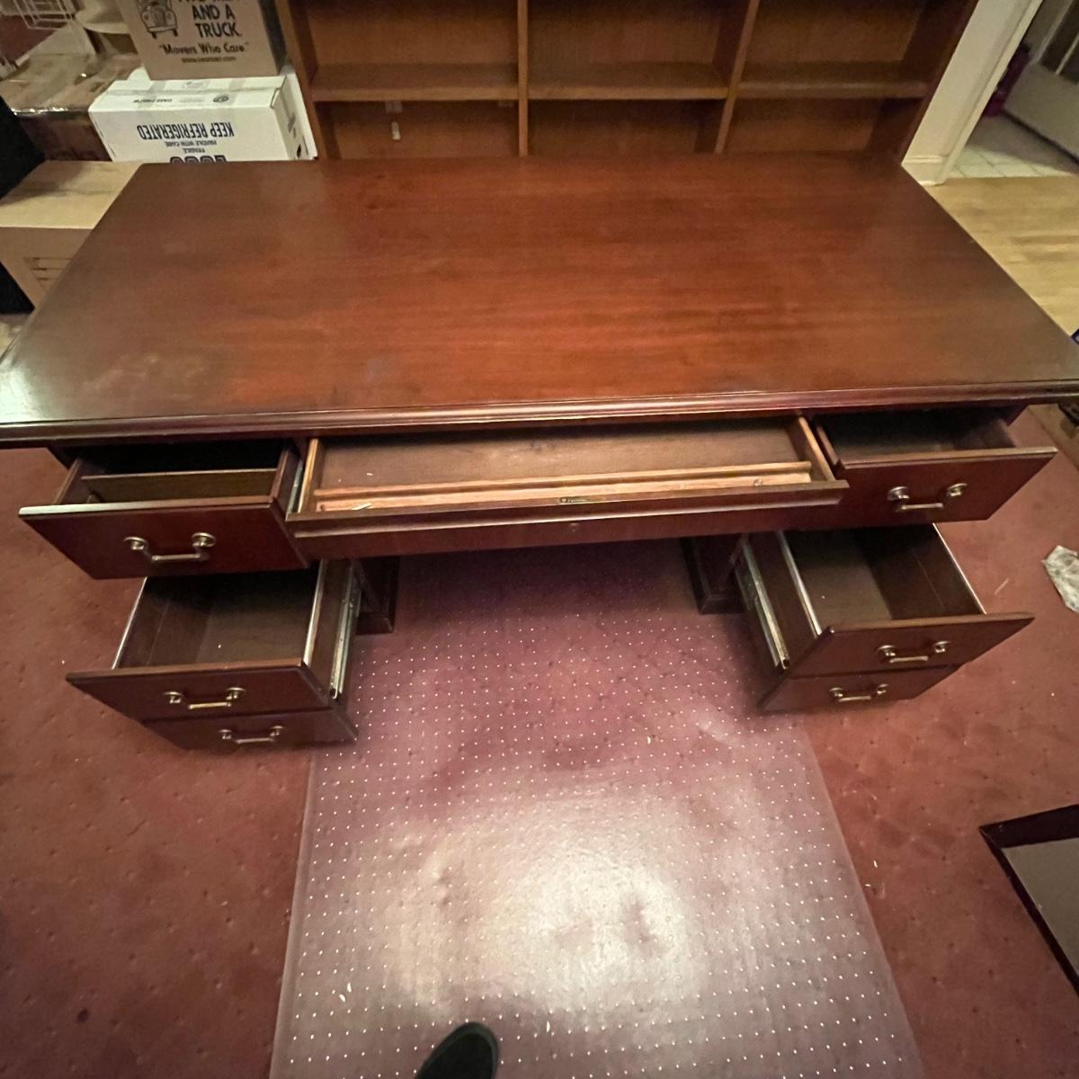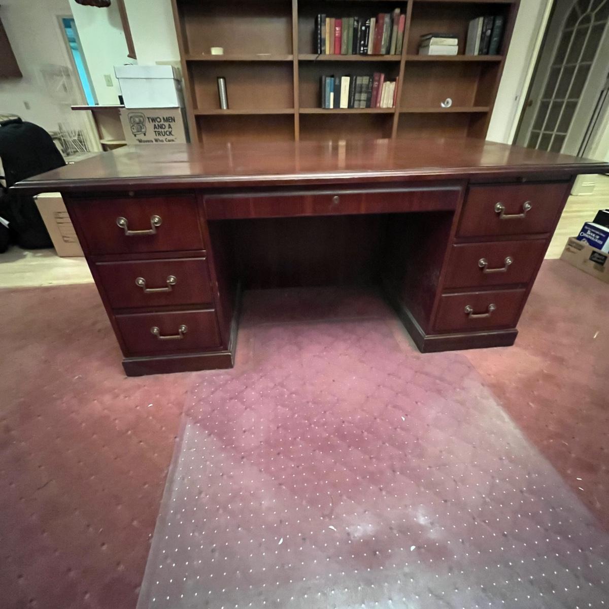 Lot includes a large wooden desk made by Kimball. Desk has two file drawers and three regular drawers with two pull out pieces on each end of desk. Desk measures 36” x 72” x 30”. Bring help item is substantial.