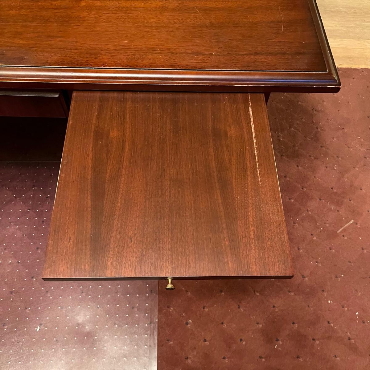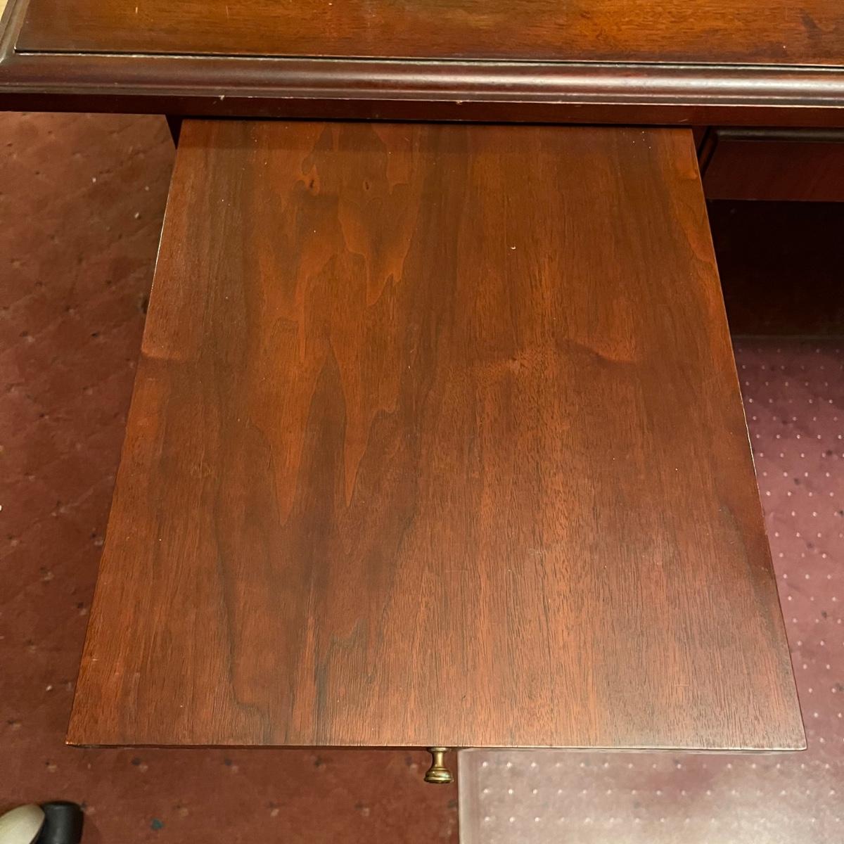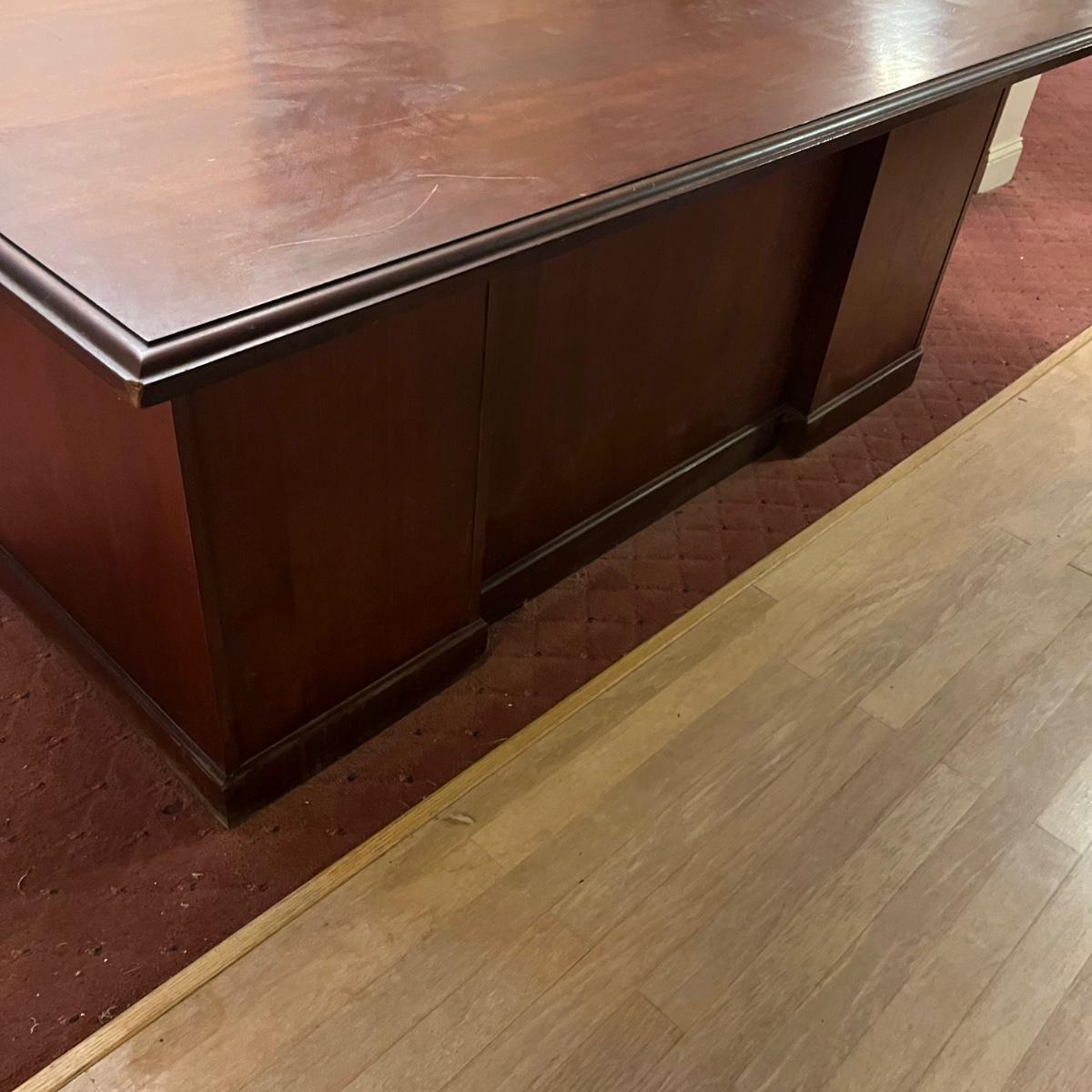 Lot includes a large wooden desk made by Kimball. Desk has two file drawers and three regular drawers with two pull out pieces on each end of desk. Desk measures 36” x 72” x 30”. Bring help item is substantial.