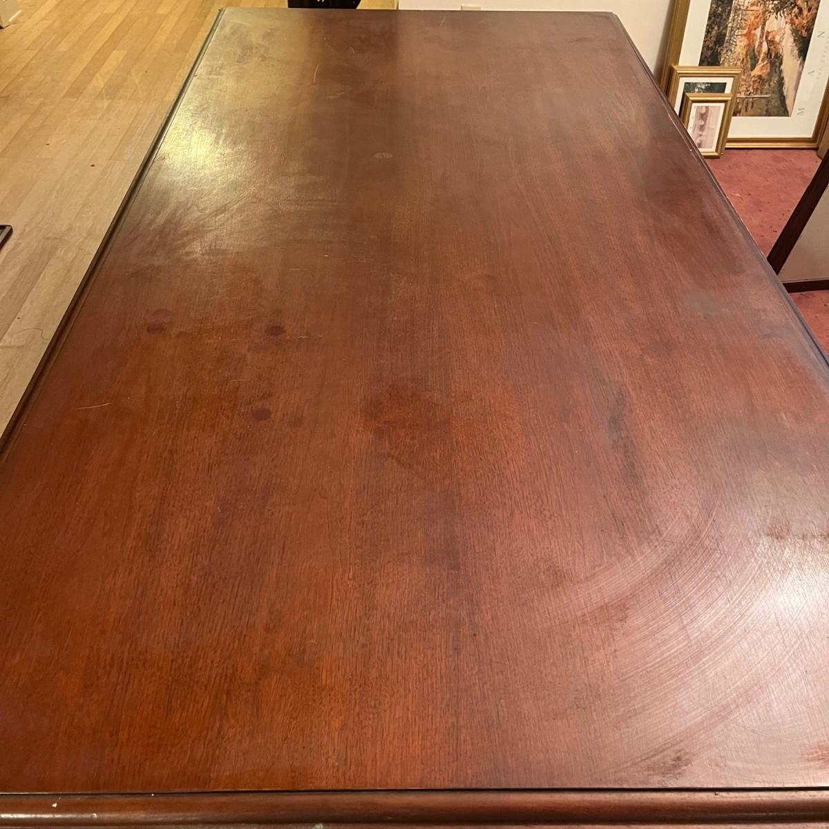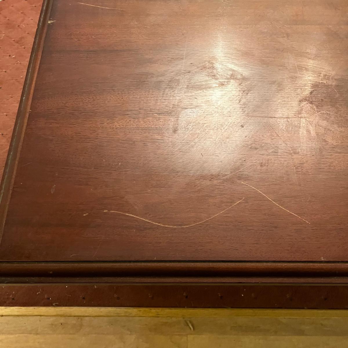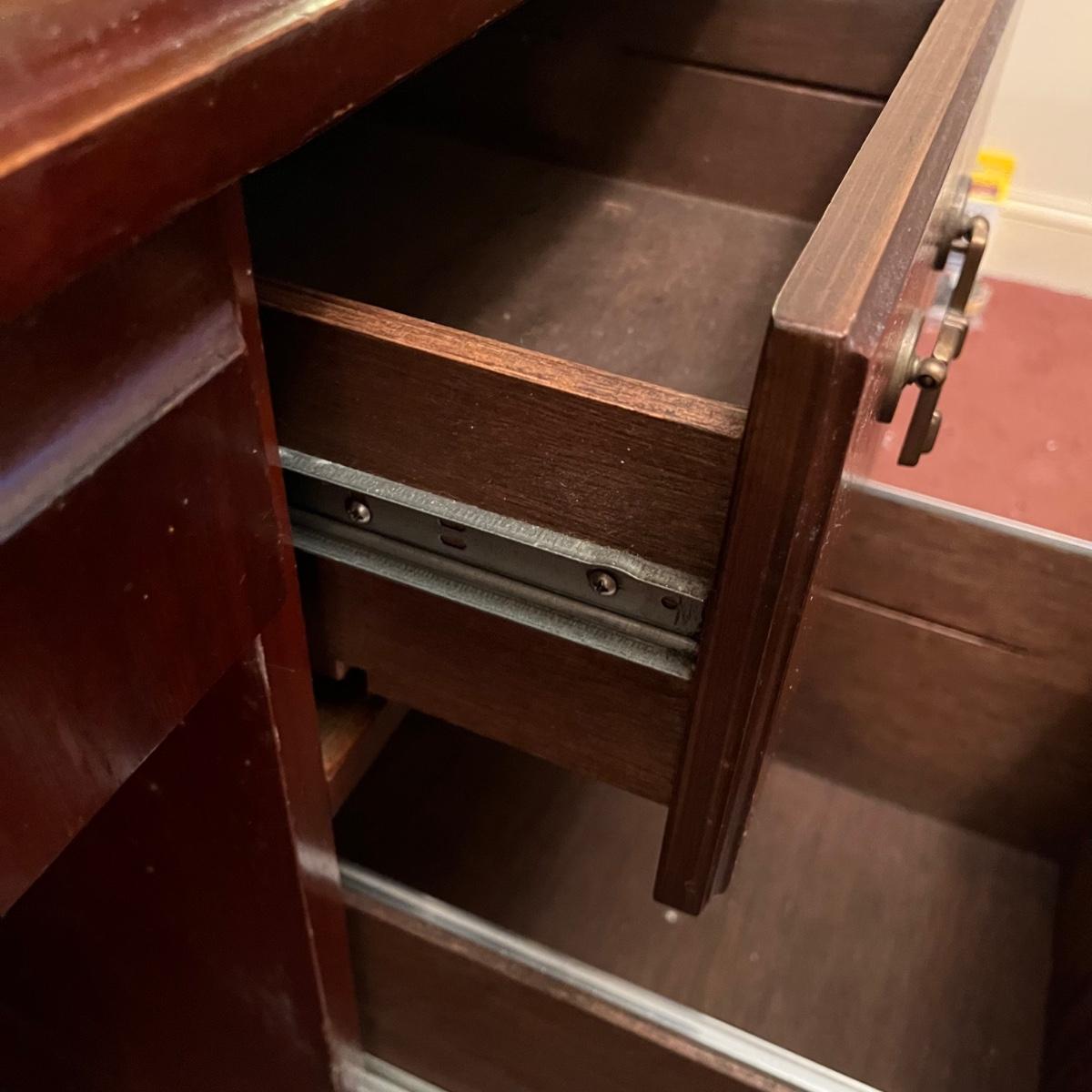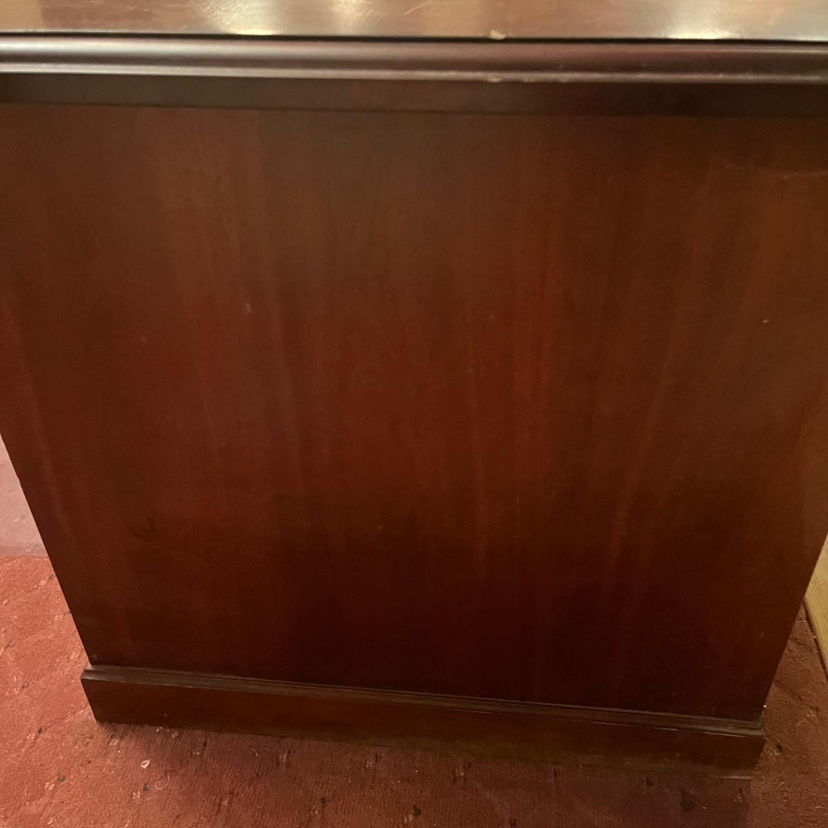 Lot includes a large wooden desk made by Kimball. Desk has two file drawers and three regular drawers with two pull out pieces on each end of desk. Desk measures 36” x 72” x 30”. Bring help item is substantial.