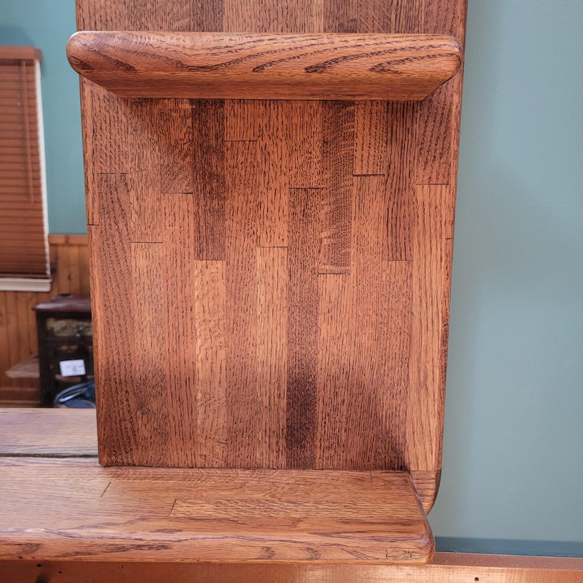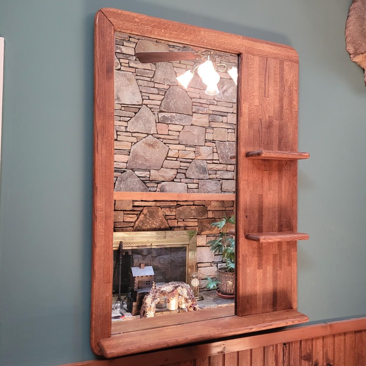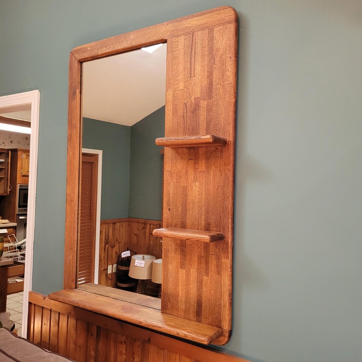 This unique solid wood framed mirror has a wide bottom shelf and two small shelves. Measures approximately 34" x 46"H with a shelf depth of 4". Local pickup only. Winning bidder must bring assistance to help move and load this item due to its weight and size.