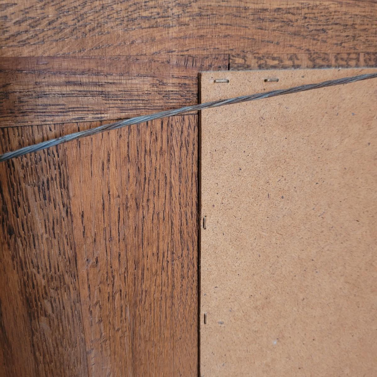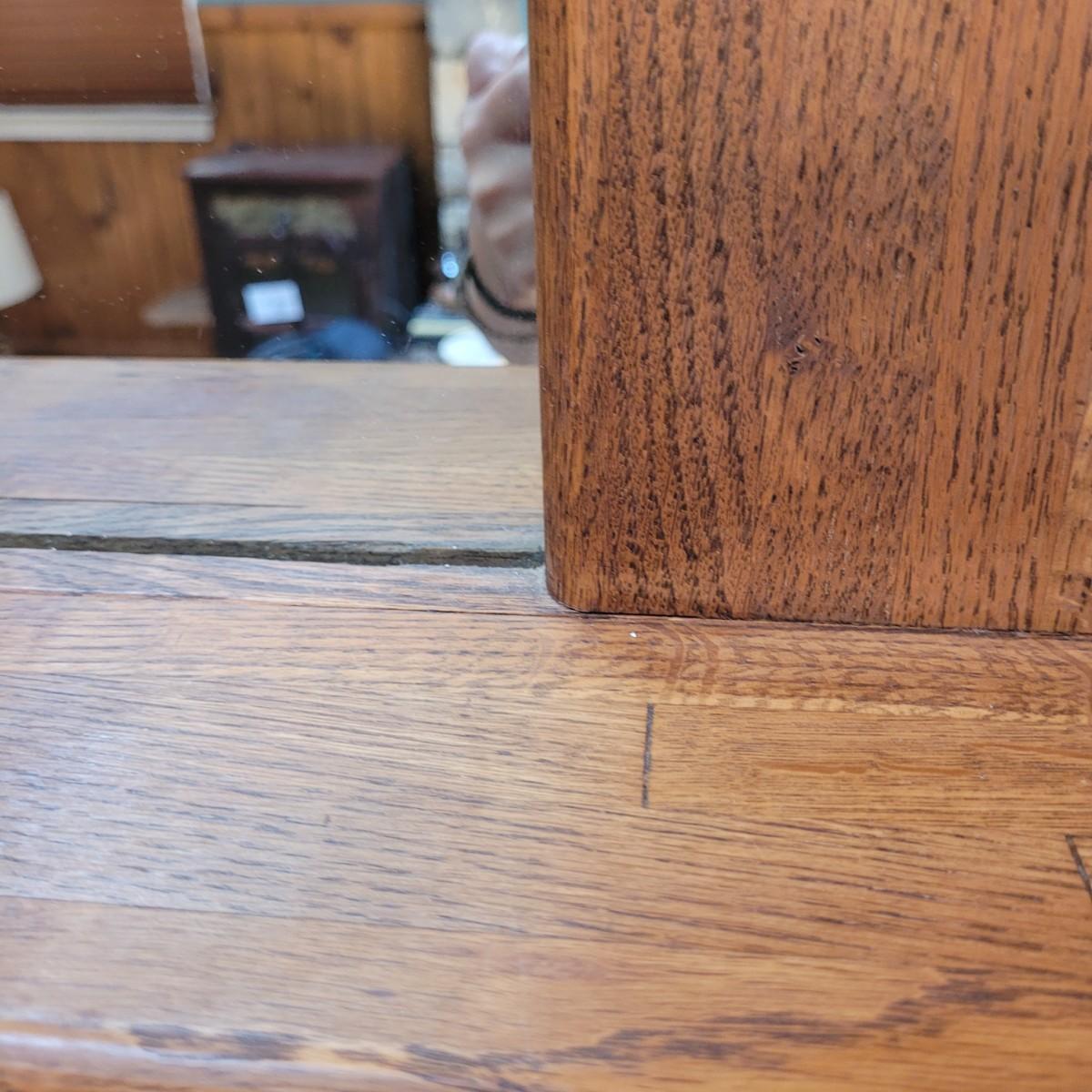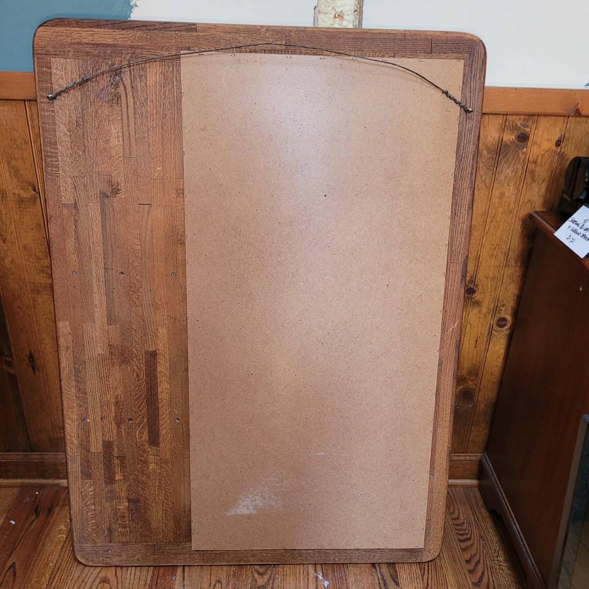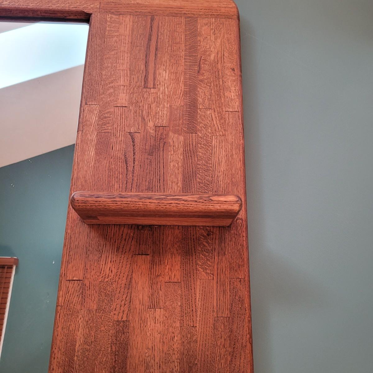 This unique solid wood framed mirror has a wide bottom shelf and two small shelves. Measures approximately 34" x 46"H with a shelf depth of 4". Local pickup only. Winning bidder must bring assistance to help move and load this item due to its weight and size.