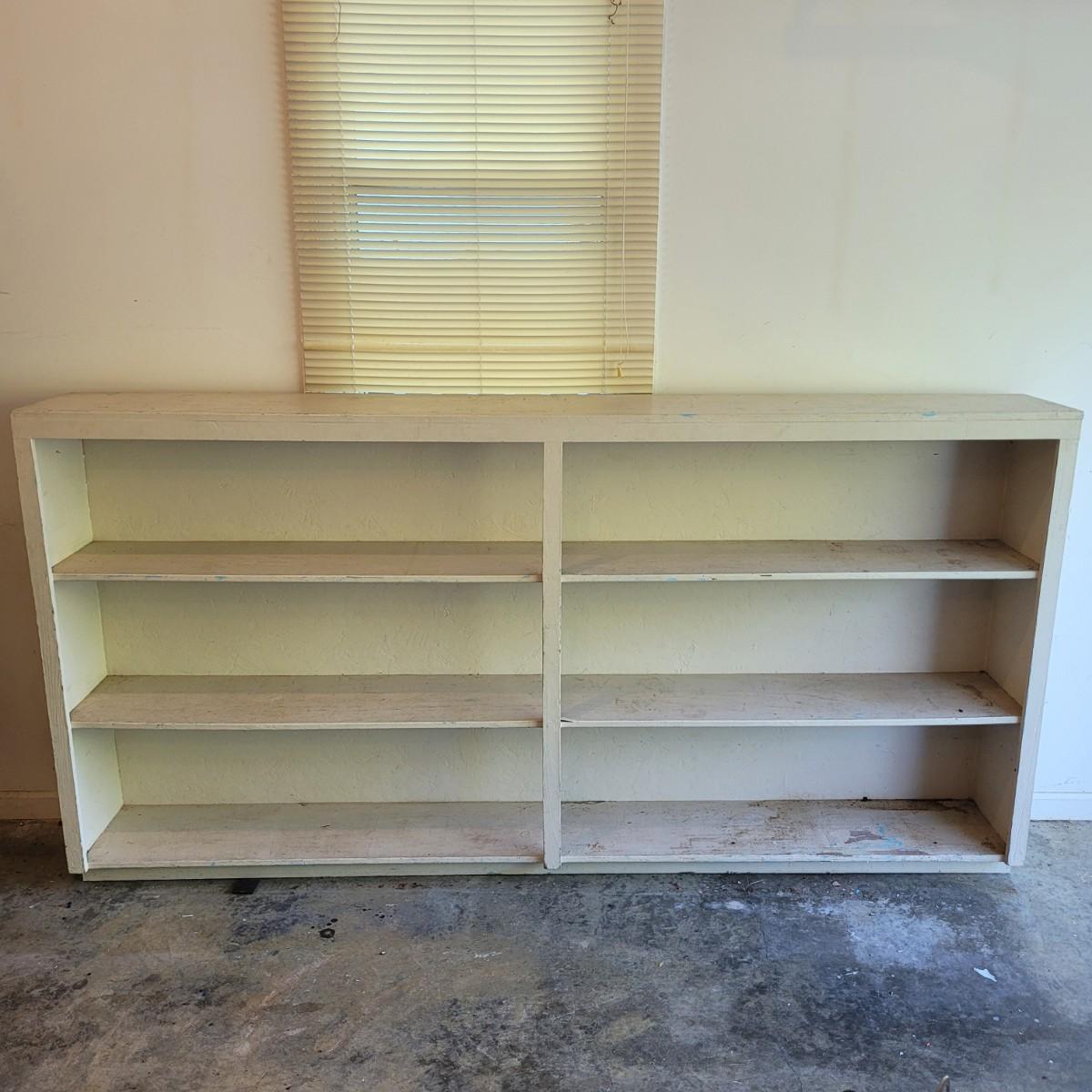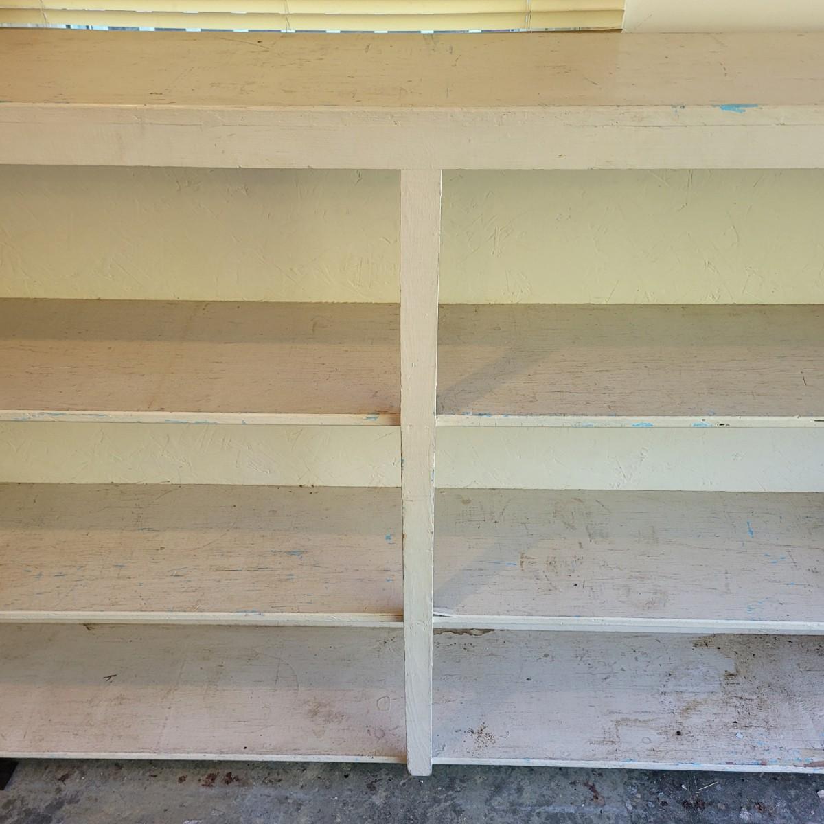 One large painted wood shelving unit. It features four levels of shelves for ample storage space. It is painted off white. It has many chips and scratches throughout. The left side of the shelf has a detachable plastic hook. The shelf measures 96" x 13" X 49"H. It appears to have been used in a garage for most of its life. This piece is located in the garage and can be moved from the home without traversing steps.